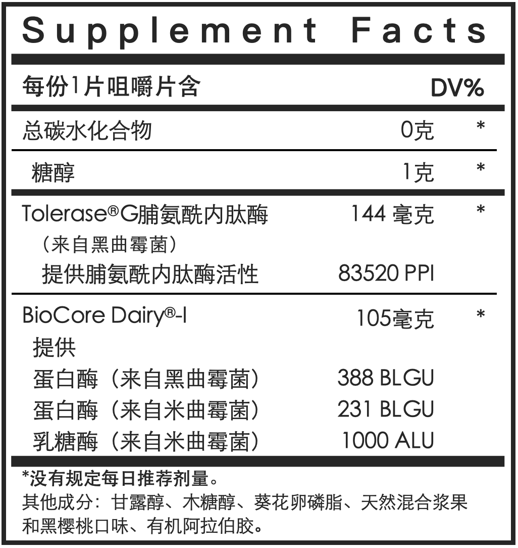 一款为儿童和成人设计的天然浆果味复合酶咀嚼片,提供麸质和乳糖分解所需的特种酶。有助于将麸质和乳糖分解成其基本成分。