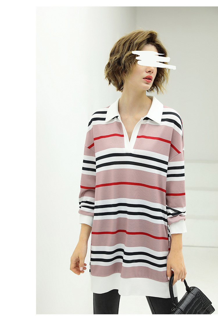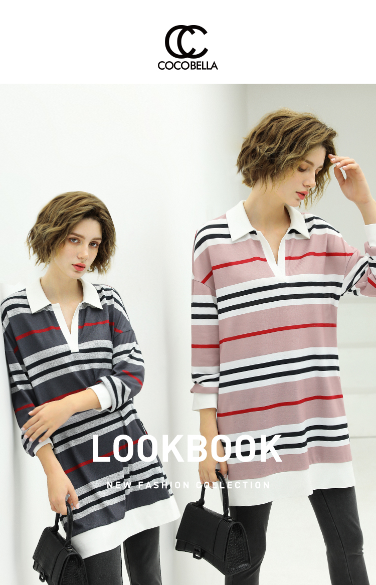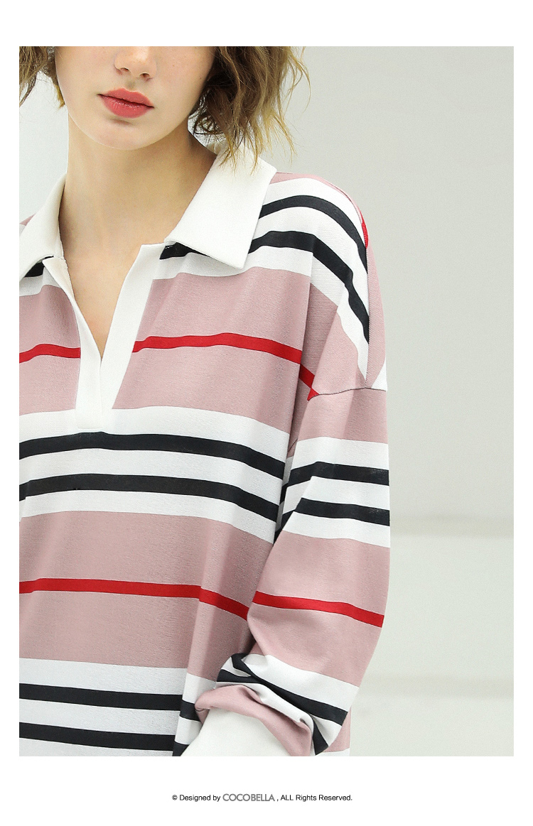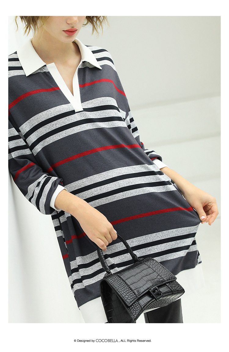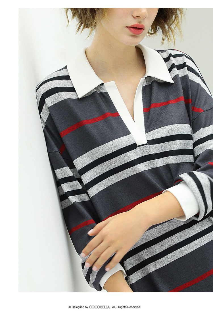 COCOBELLA撞色条纹POLO领针织连衣裙宽松长袖T恤裙FR11