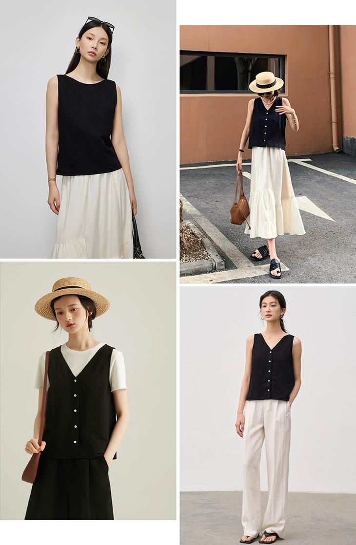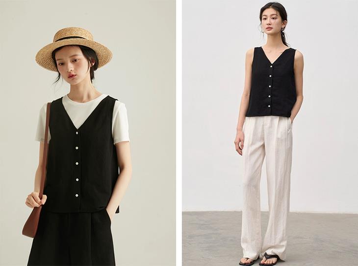但是掌柜真的很建议你一整套入,毕竟两件可以解锁更多时髦穿搭,特别是这款黑色无袖小马甲,可是时尚界长青的穿搭利器。