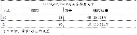 有M、L两个码数可选,M码适合80-115斤的人穿着,L码建议115-135斤,因为每个人身材特点不一样,姐妹们可以根据胸围、衣长等参数选择适合自己的码数。