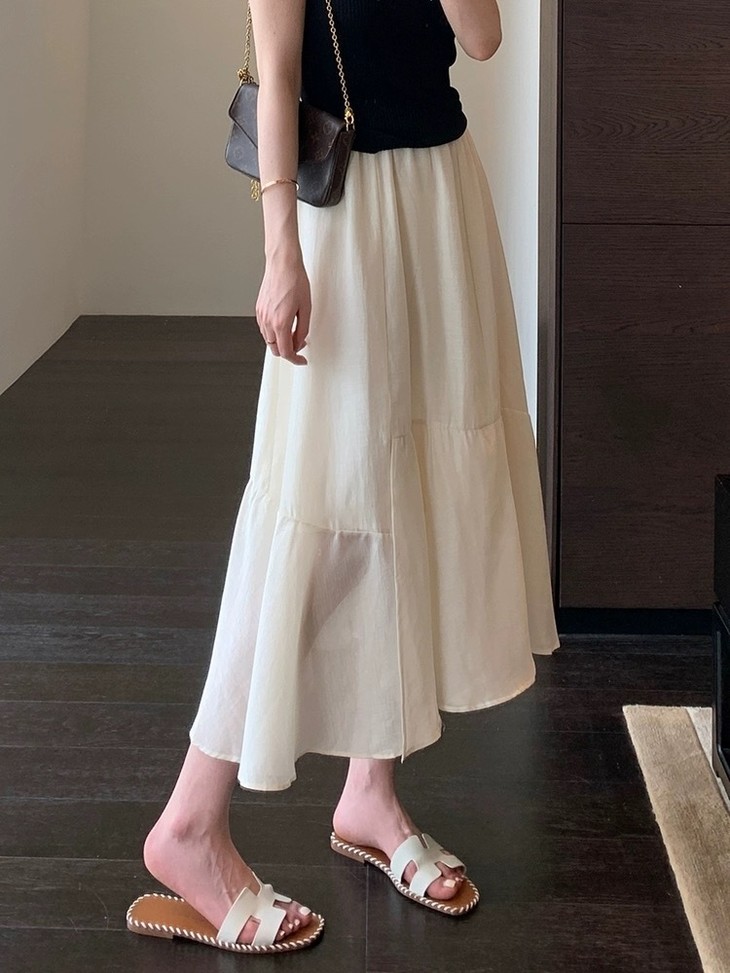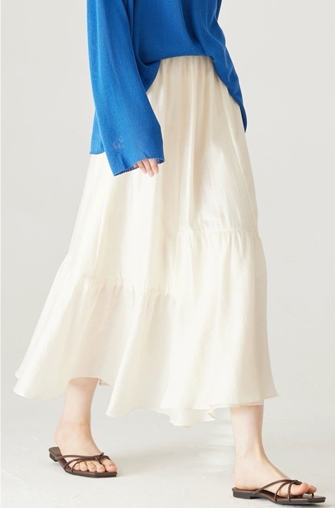 裙子面料采用天丝亚麻混纺的轻透纱感材质,飘逸又具备筋骨轻盈而不软塌。