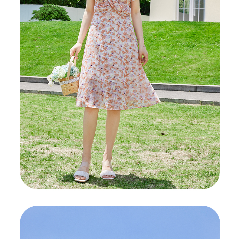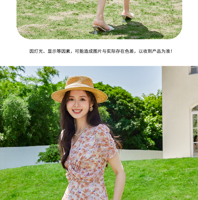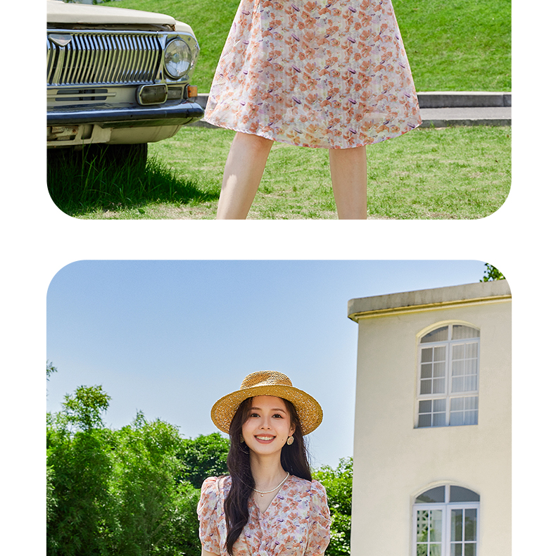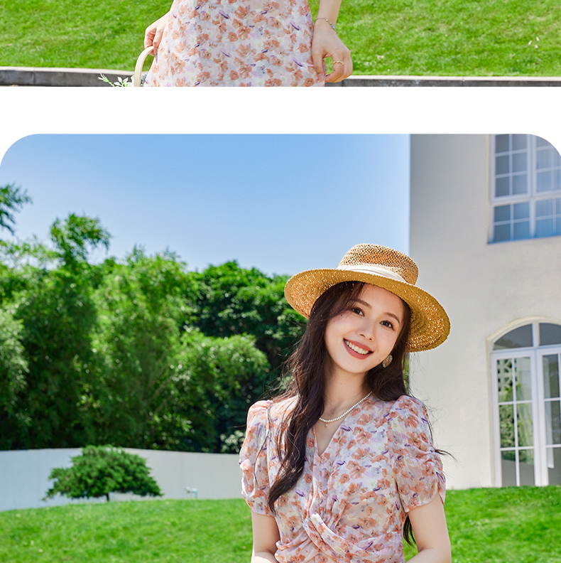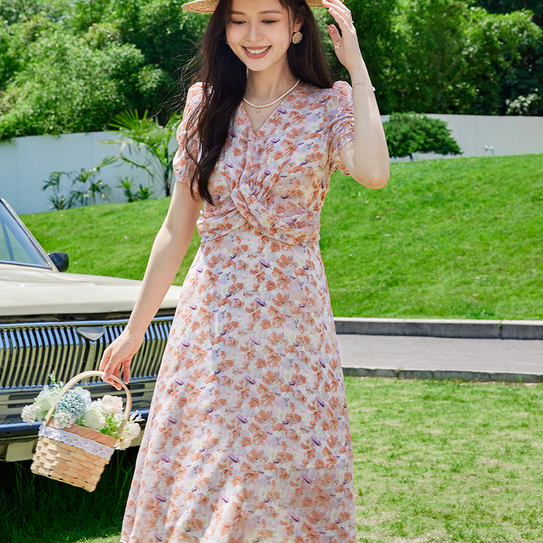 VICTORIA&VERA夏季新款温柔风气质修身法式桔梗粉色碎花交叉设计连衣裙