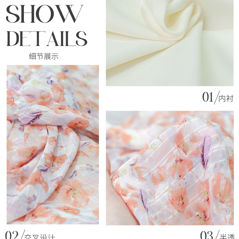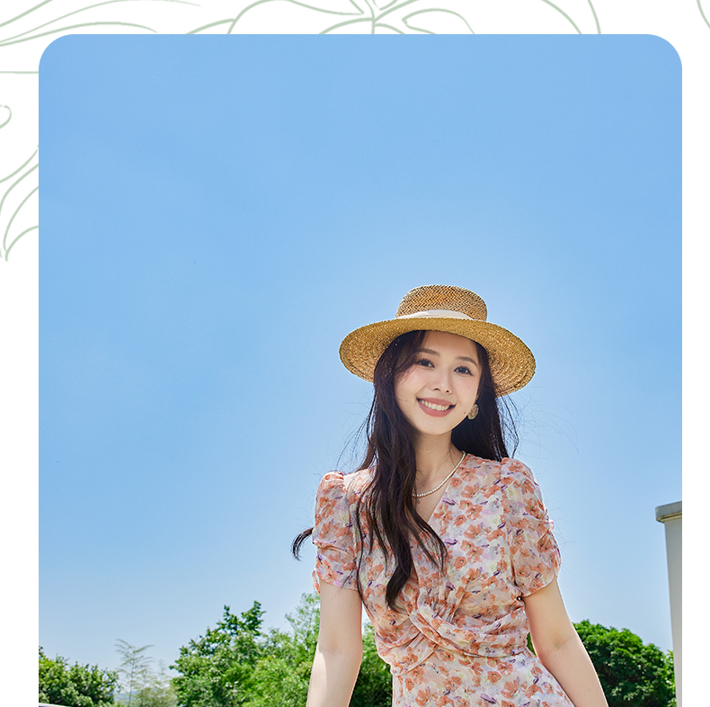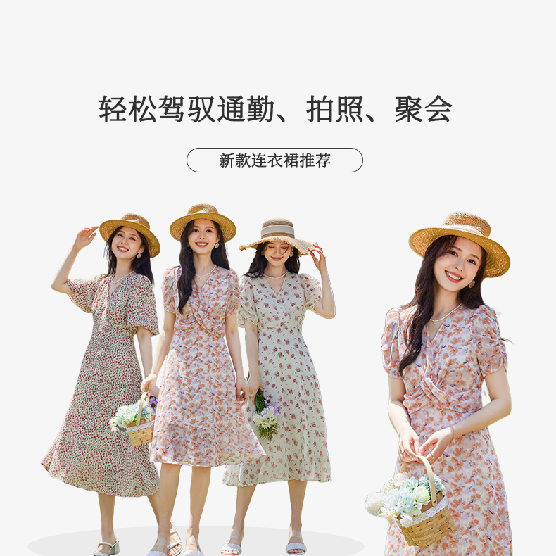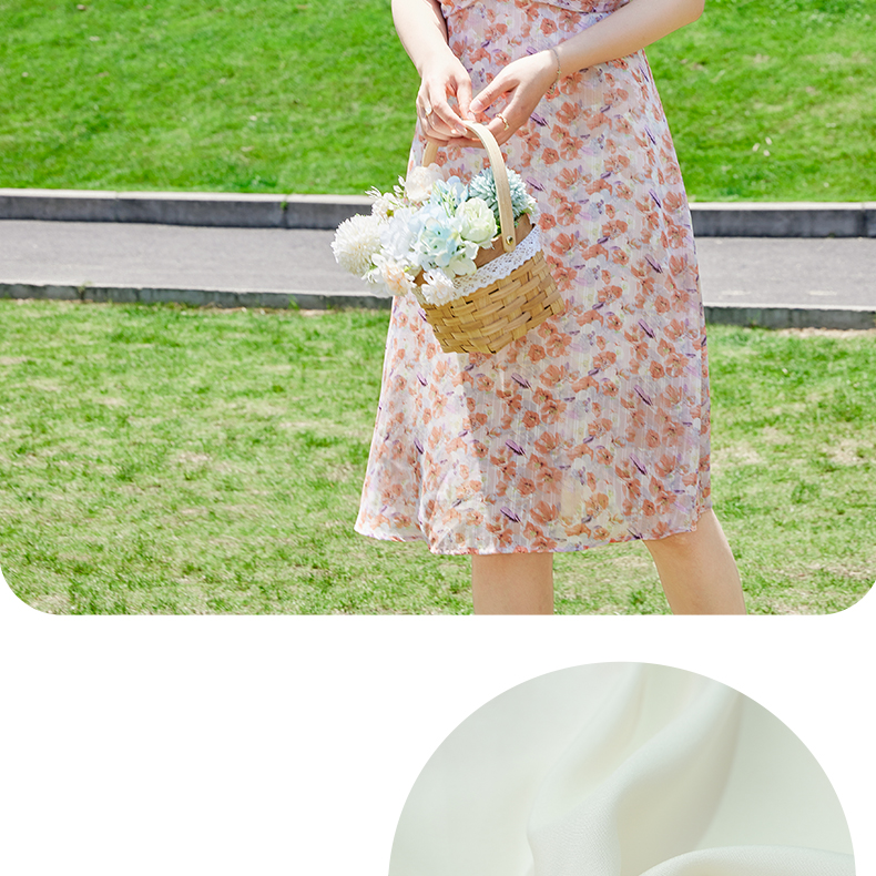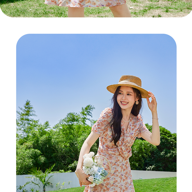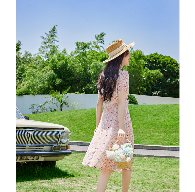 VICTORIA&VERA夏季新款温柔风气质修身法式桔梗粉色碎花交叉设计连衣裙