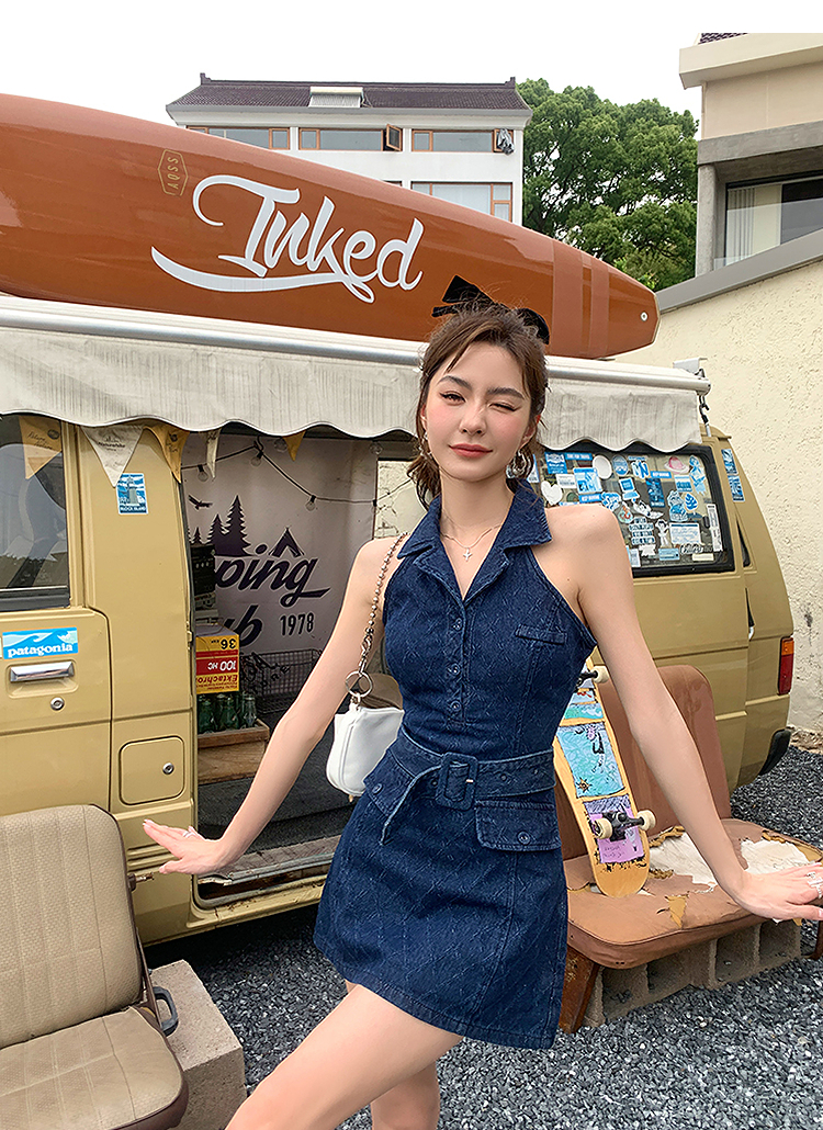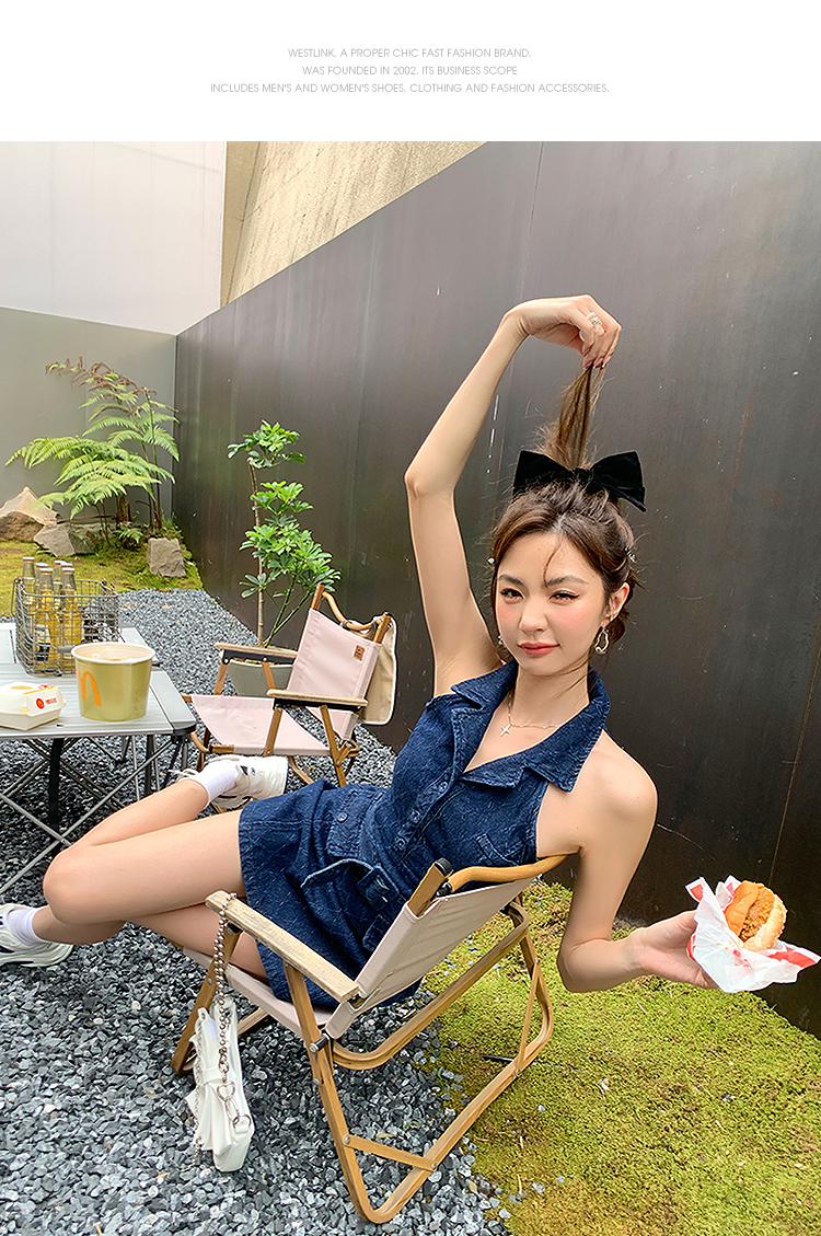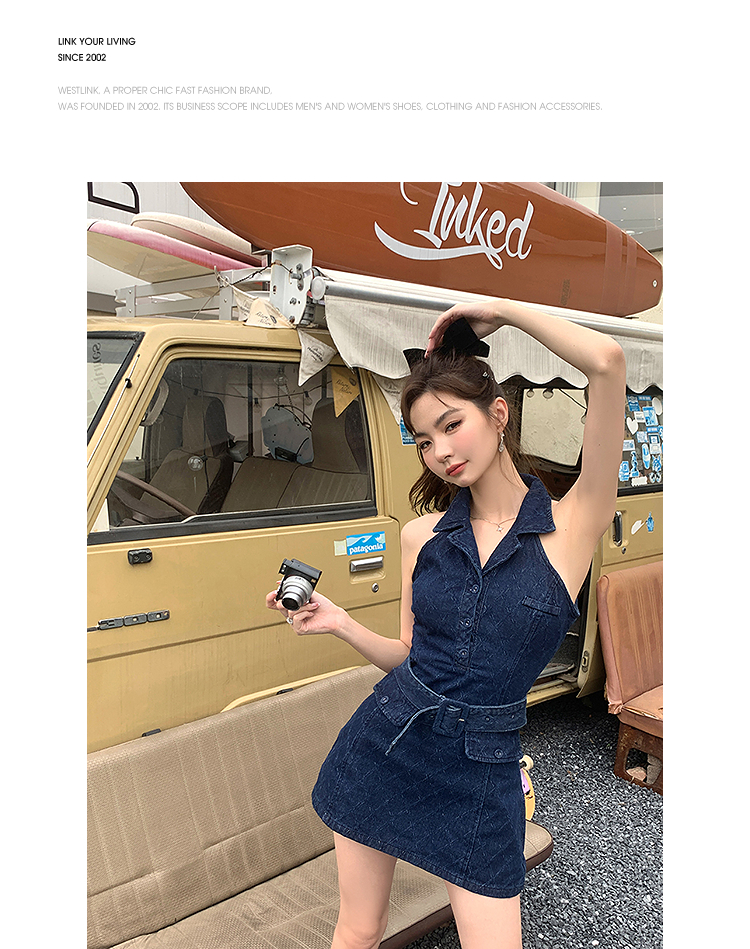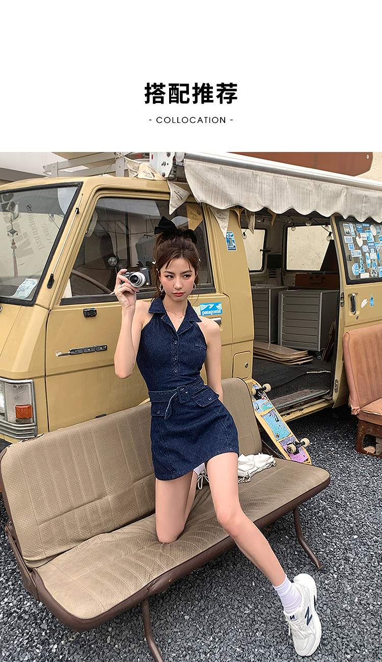 西遇挂脖牛仔连衣裙女夏季新款酷飒风蓝色收腰无袖v领短裙SS050709