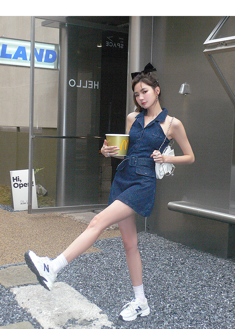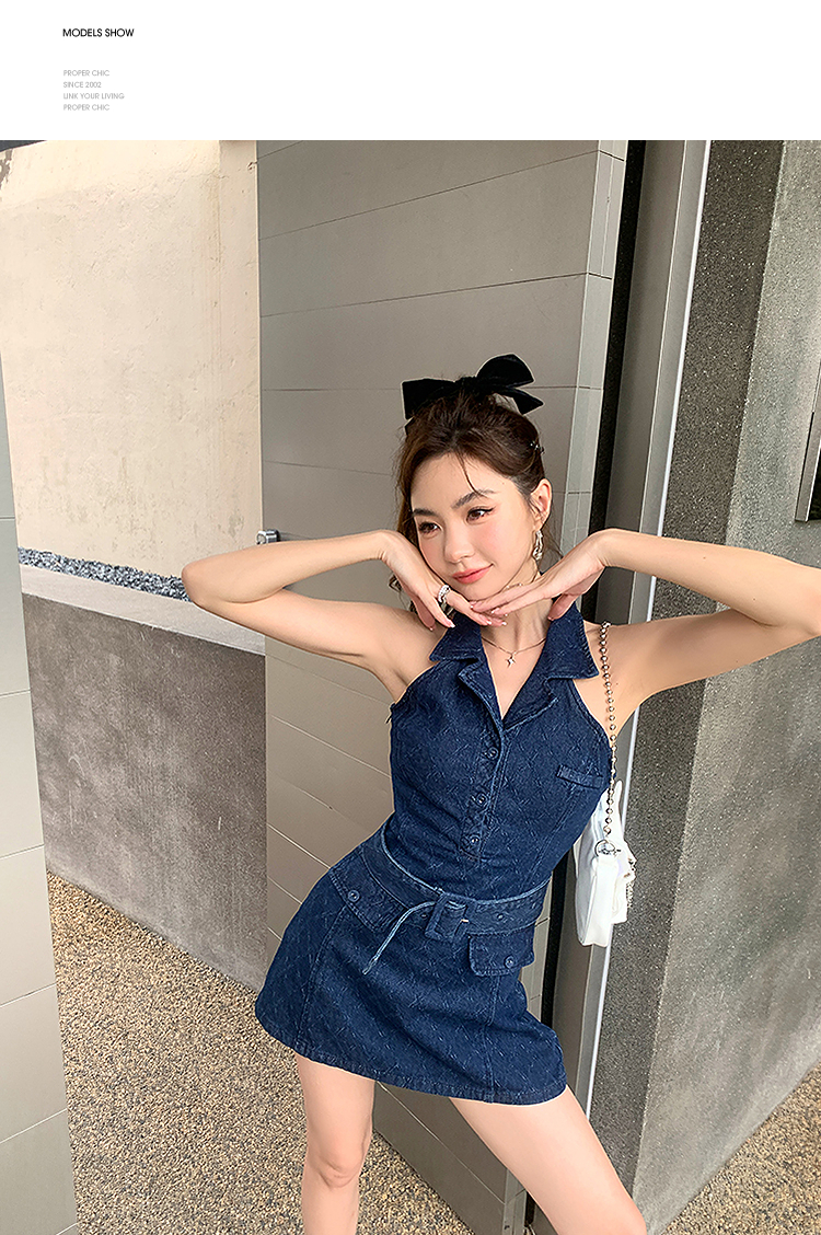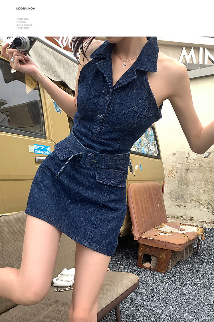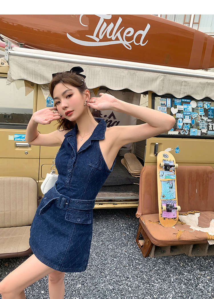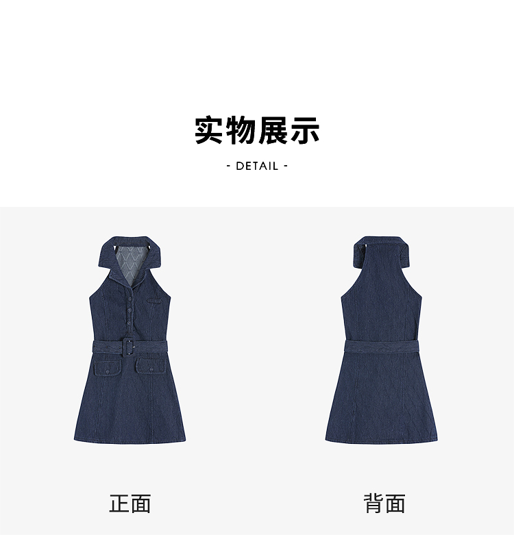 西遇挂脖牛仔连衣裙女夏季新款酷飒风蓝色收腰无袖v领短裙SS050709