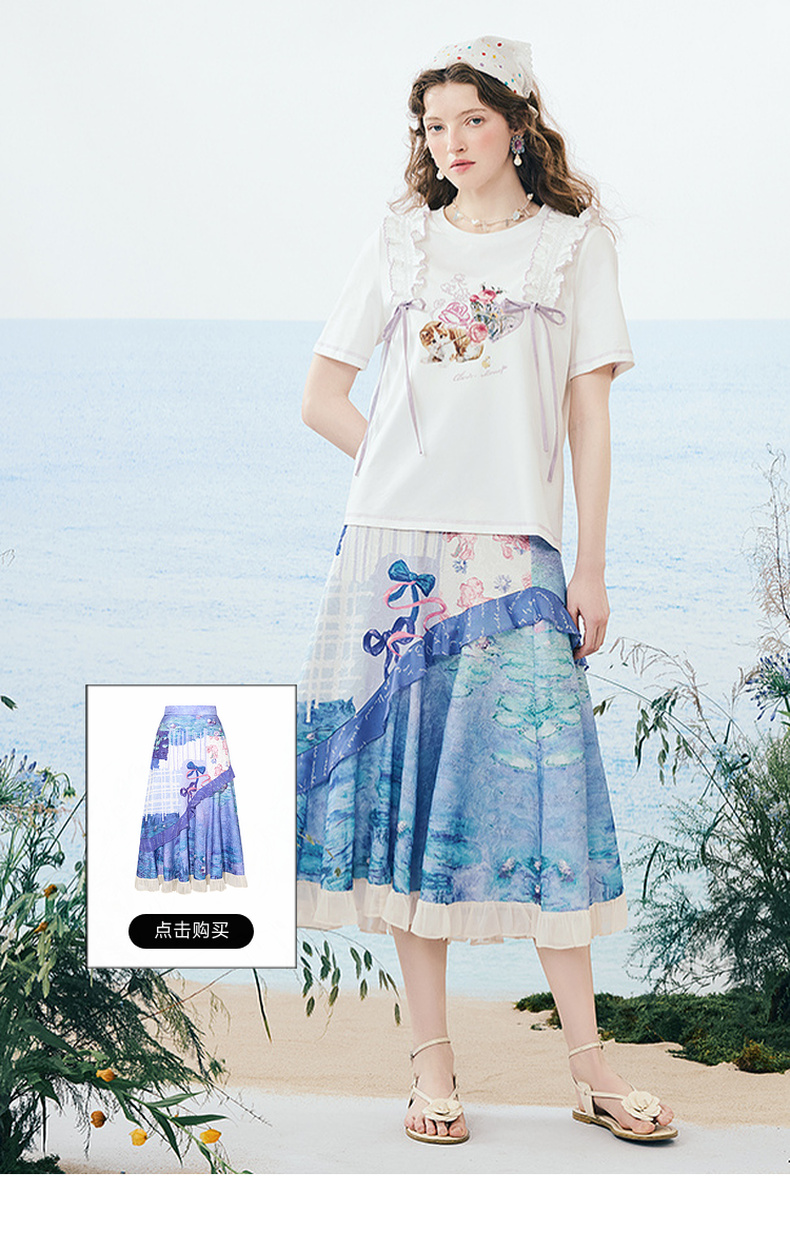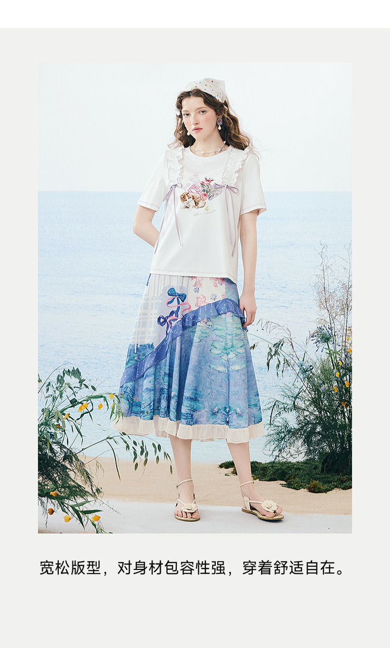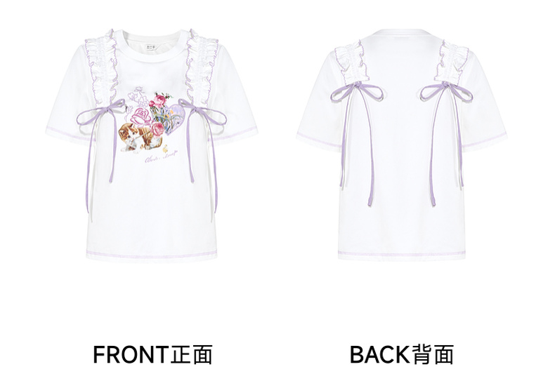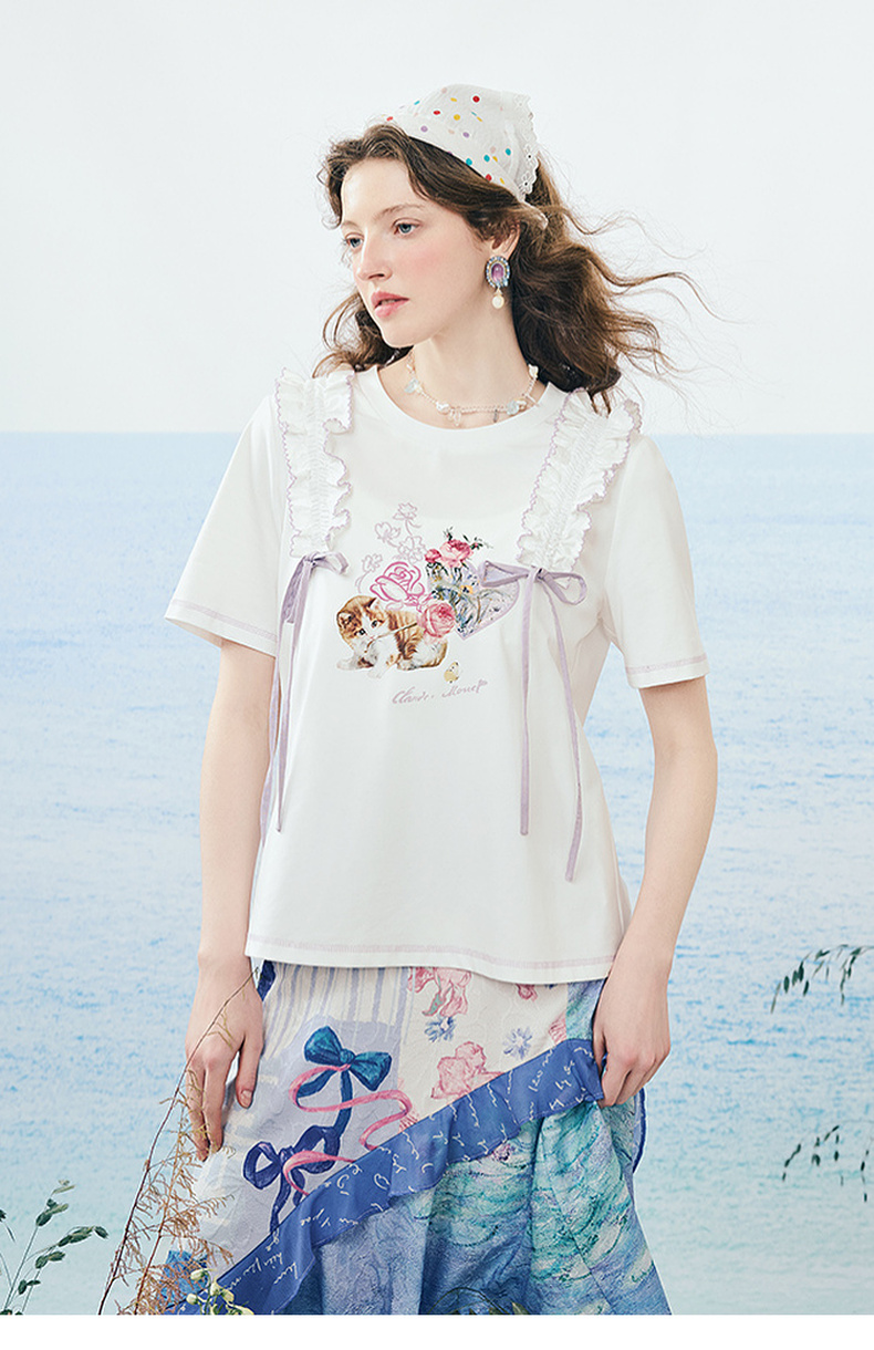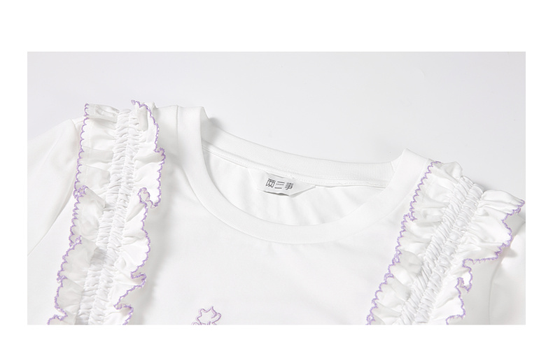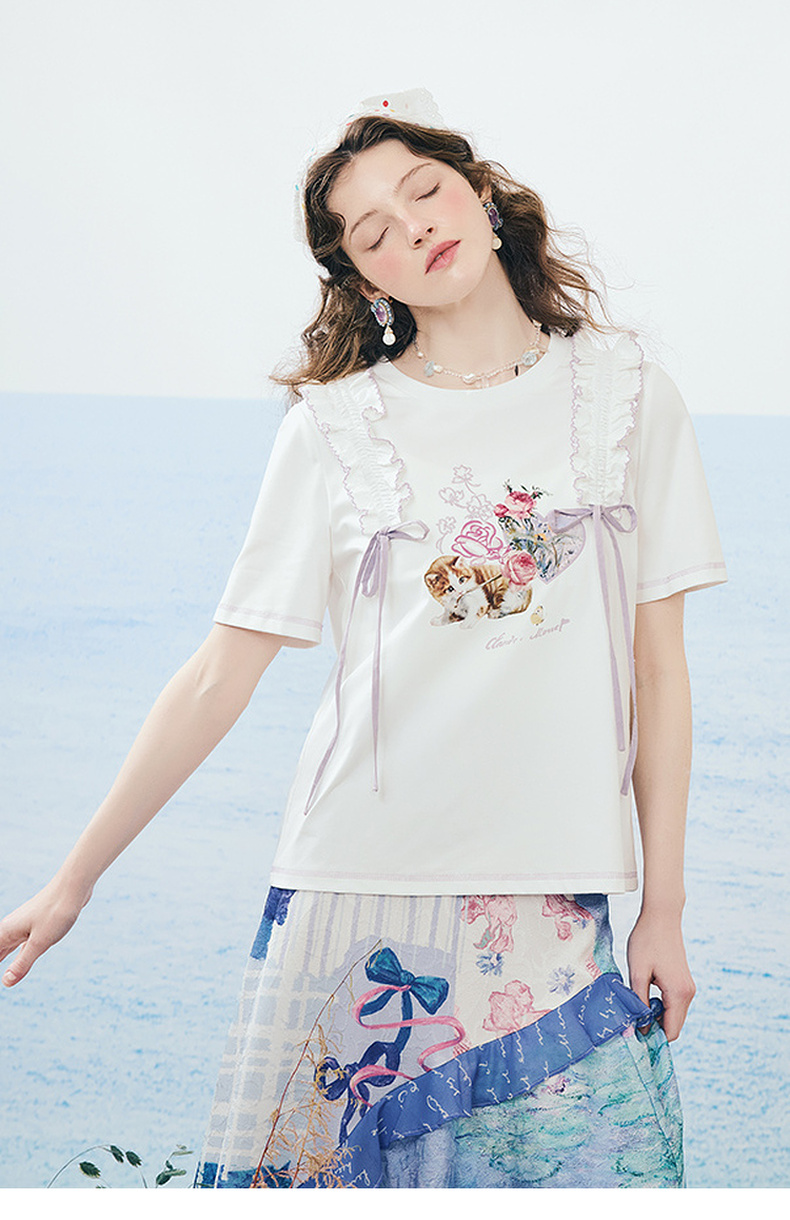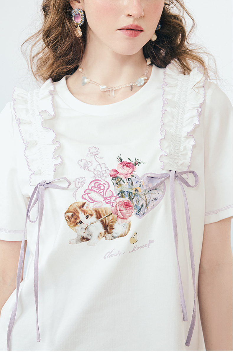 两三事 香榭喵喵 2025夏季新款木耳边拼接猫咪印花刺绣短袖t恤女