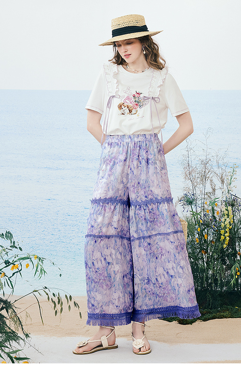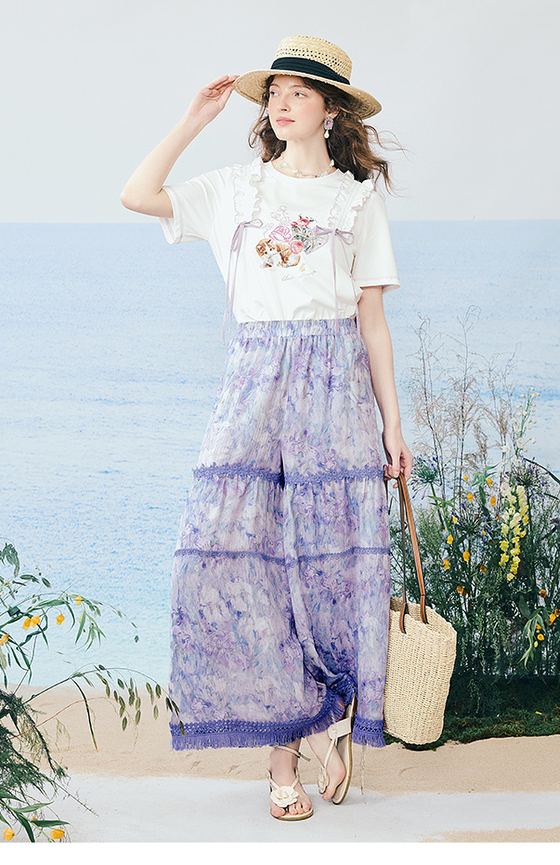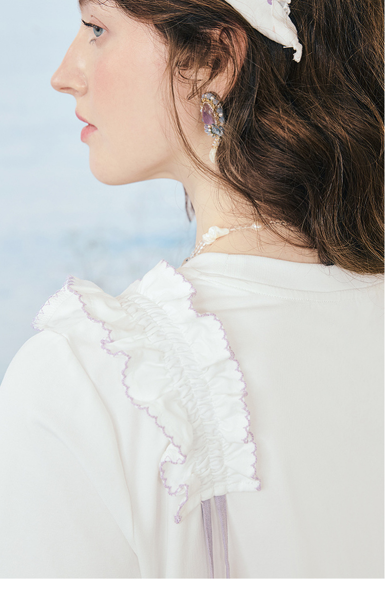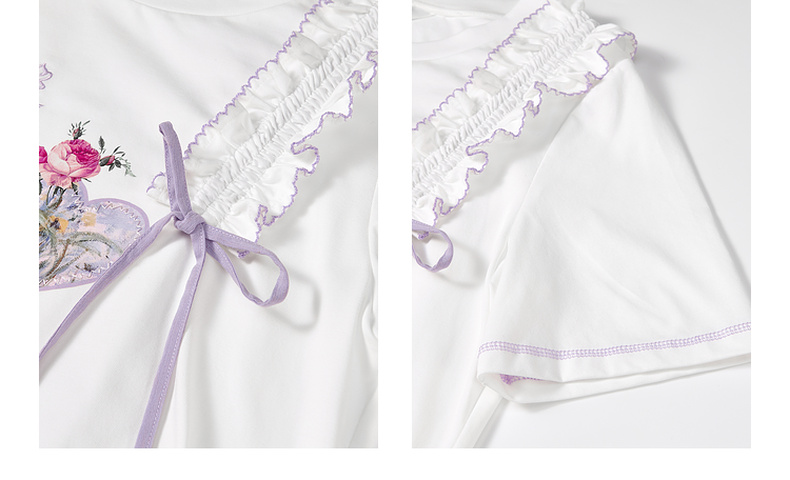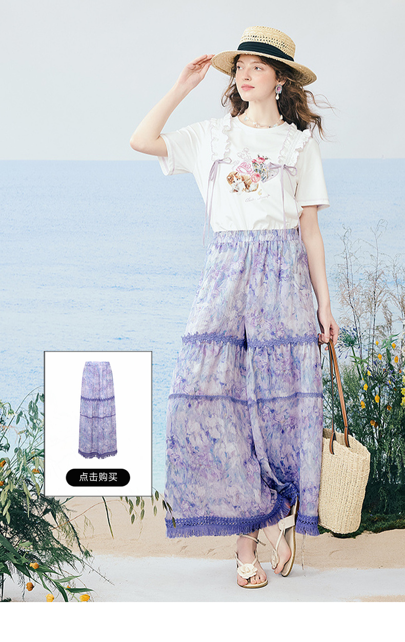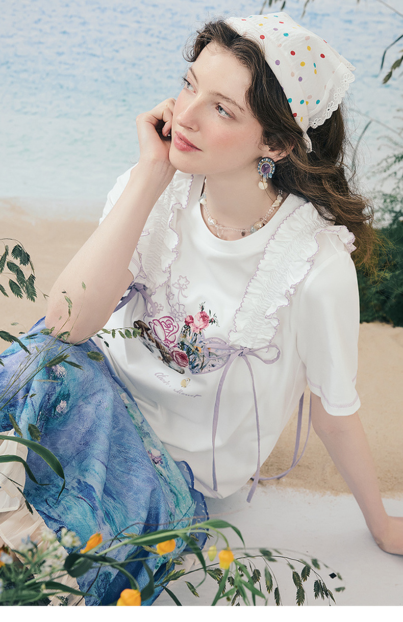 两三事 香榭喵喵 2025夏季新款木耳边拼接猫咪印花刺绣短袖t恤女