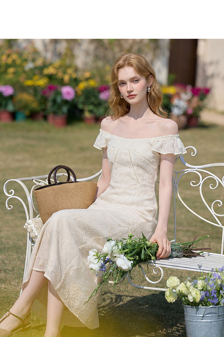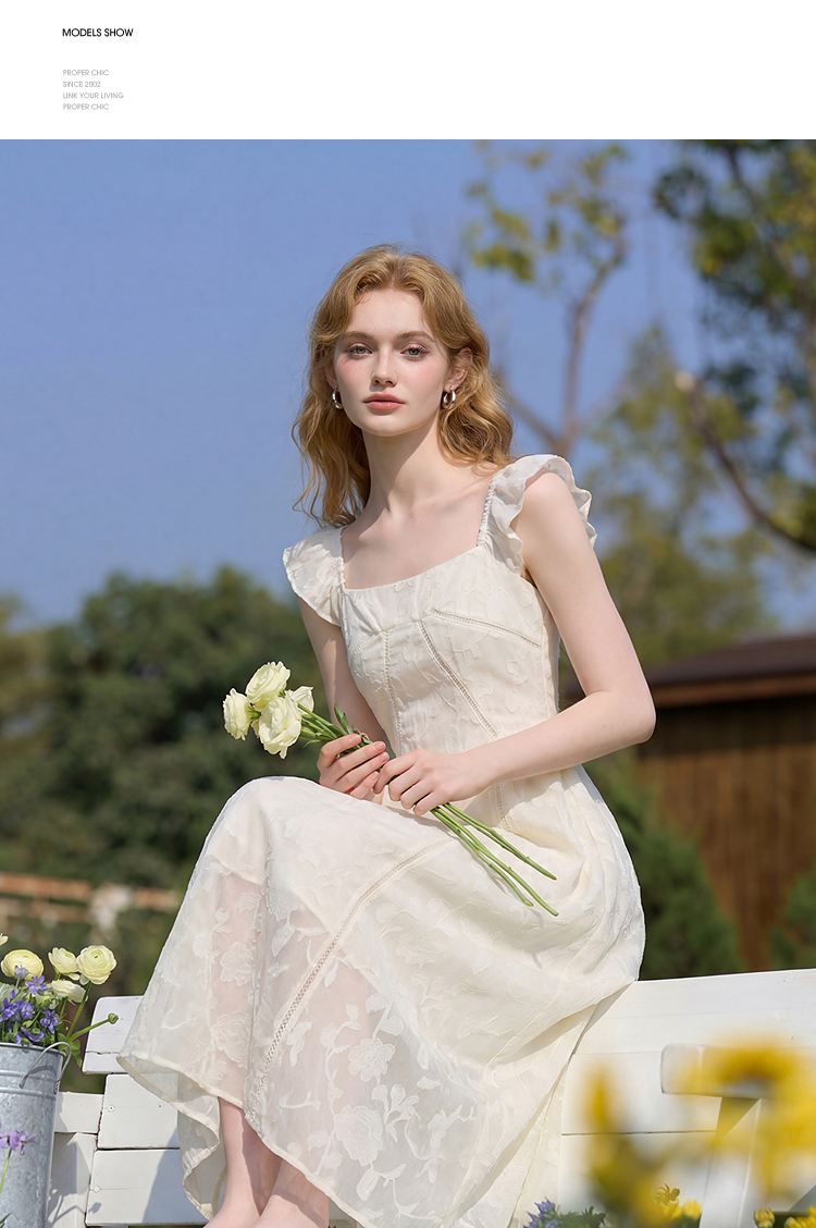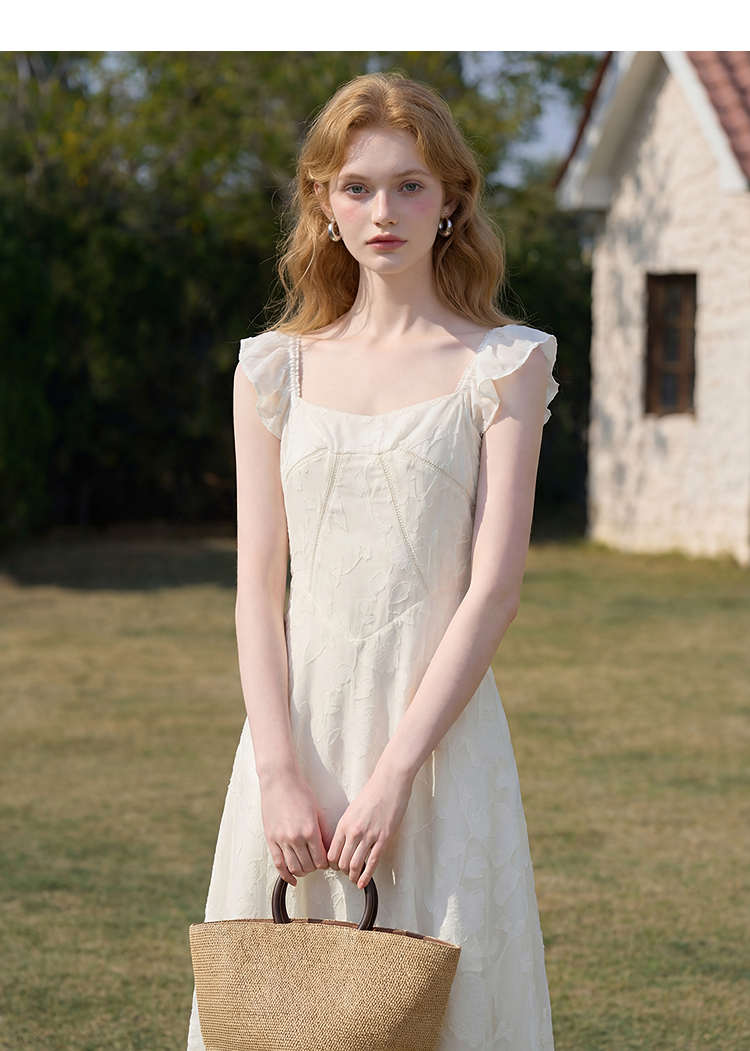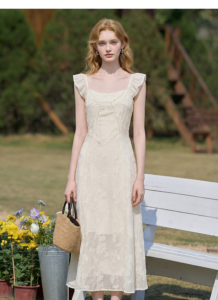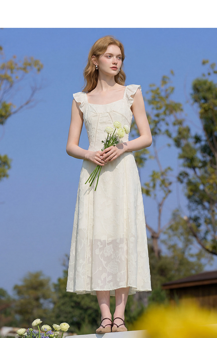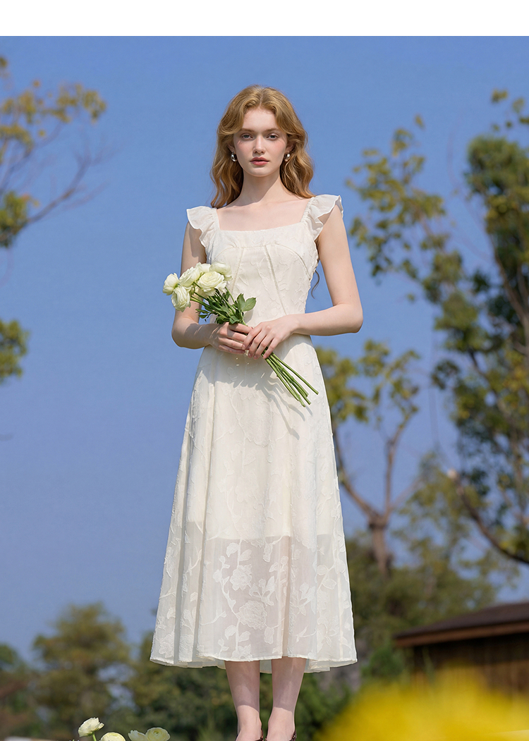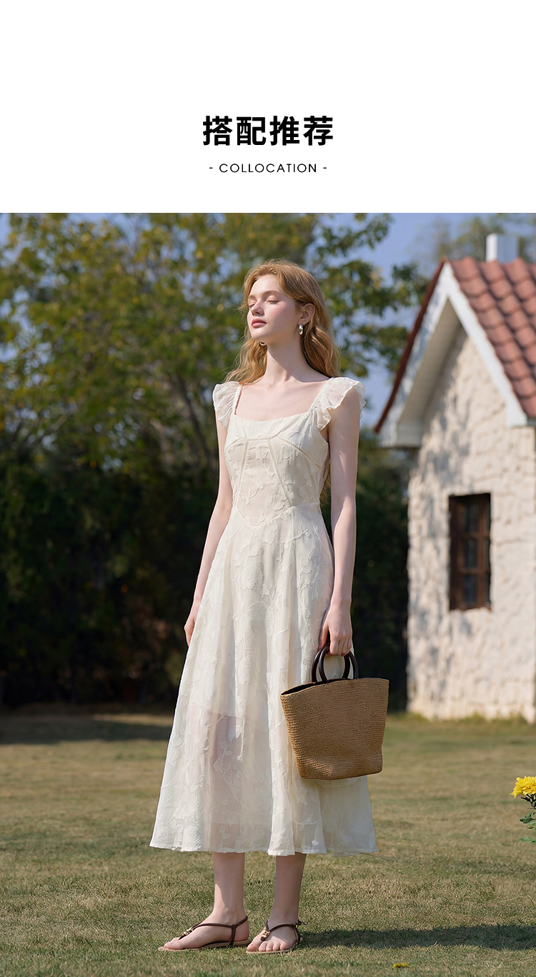 西遇法式方领连衣裙女2026夏新款收腰显瘦气质提花A字中长仙女裙E0060274
