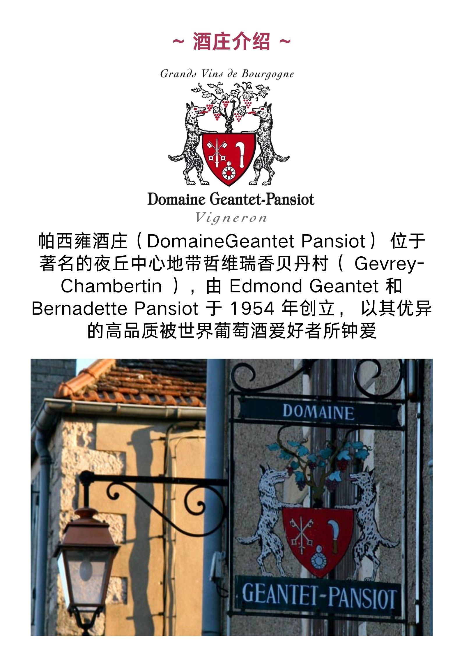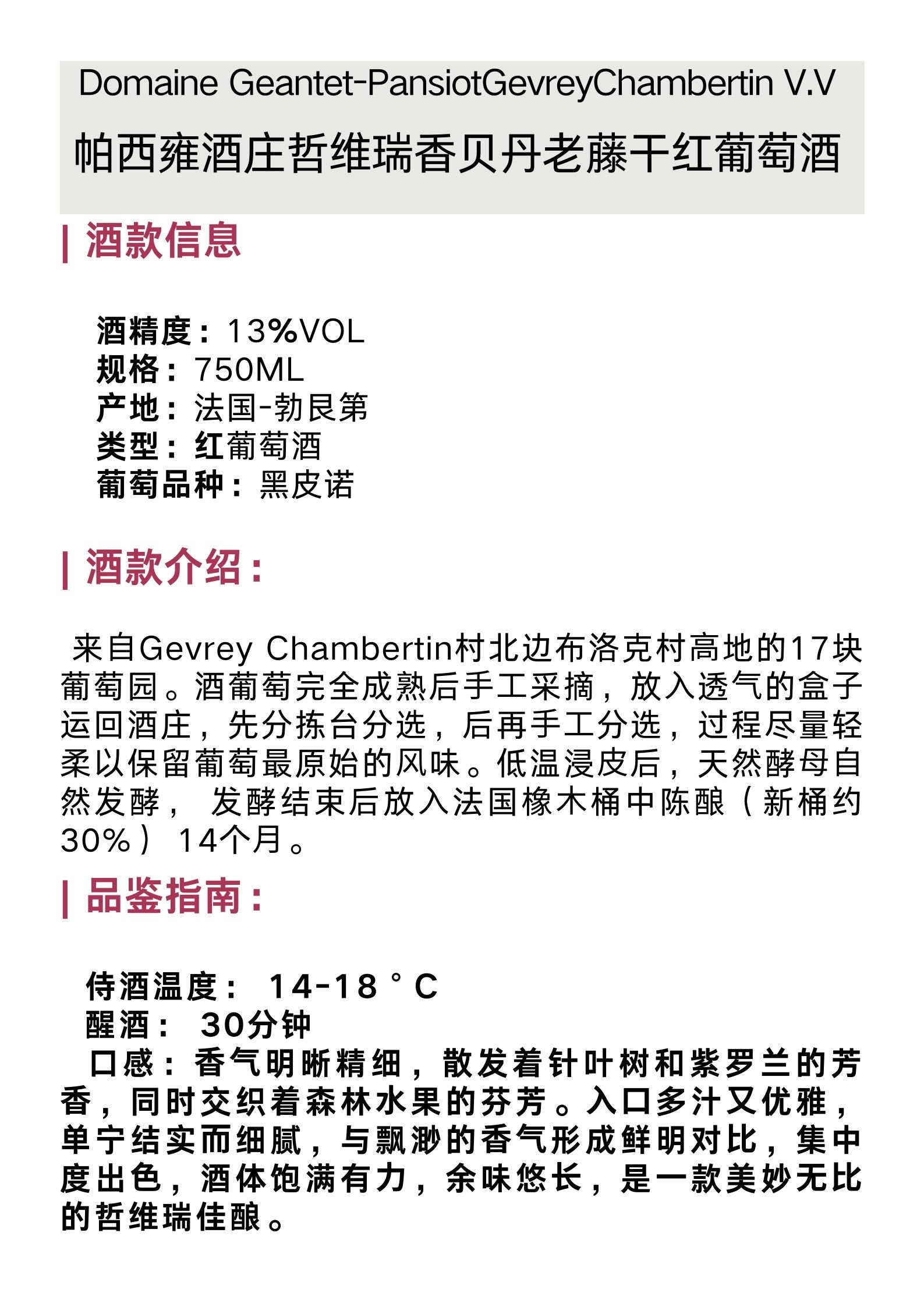 帕西雍酒庄哲维瑞香贝丹老藤干红葡萄酒 Domaine Geantet-Pansiot GevreyChambertin V.V