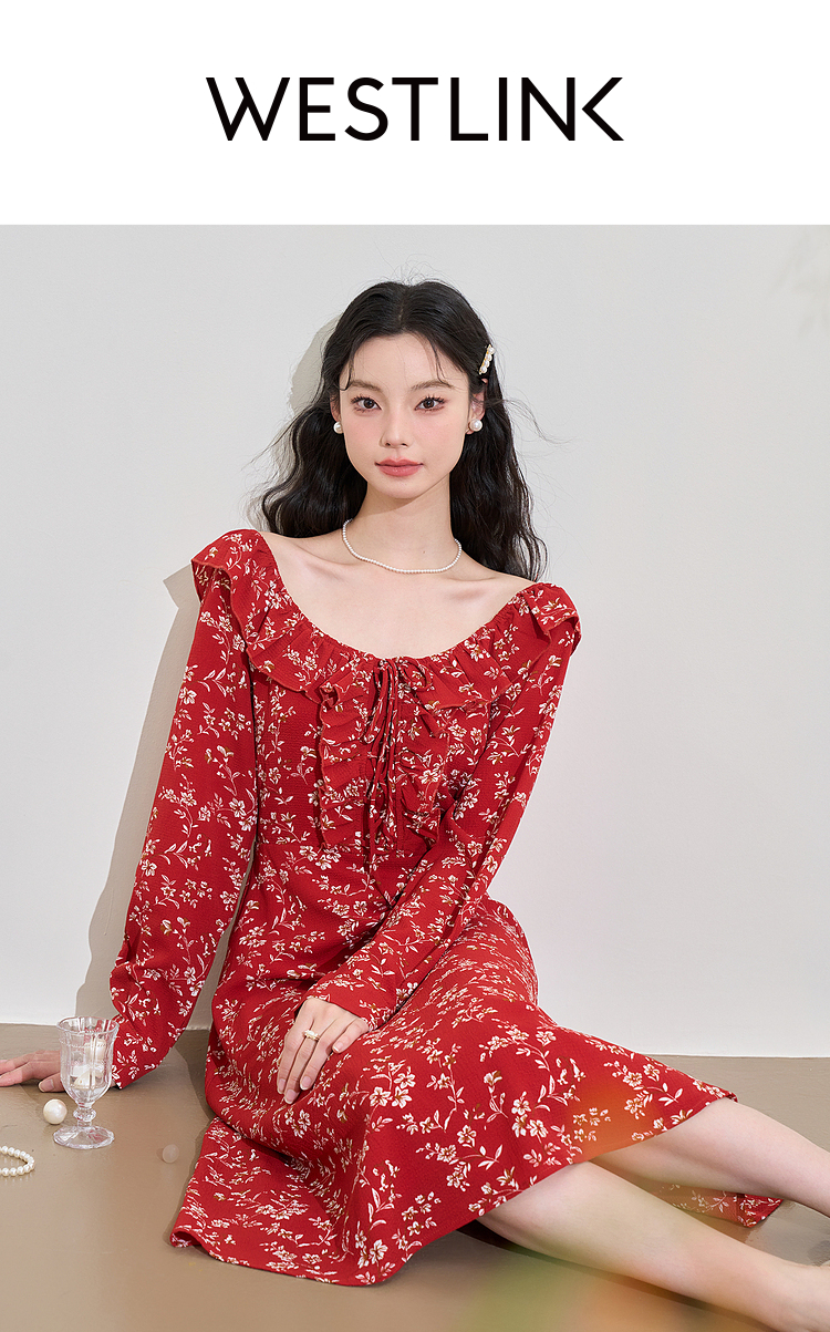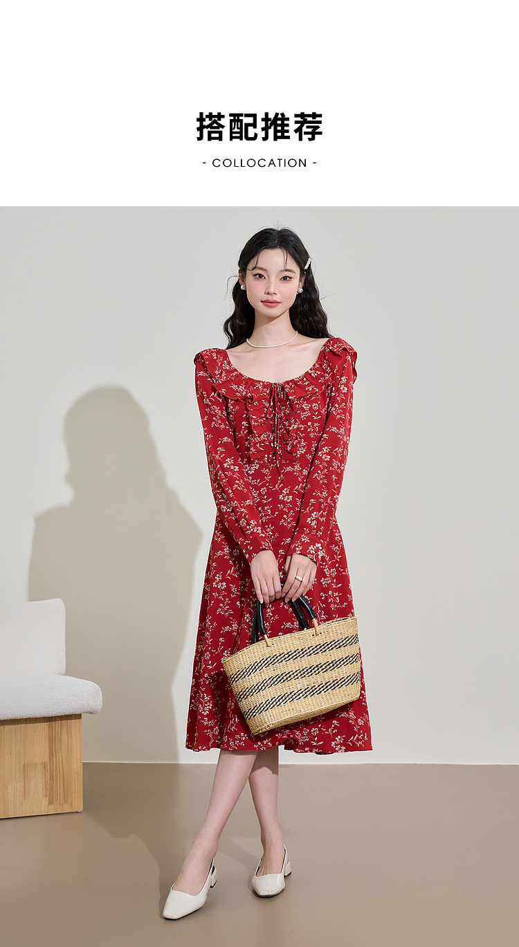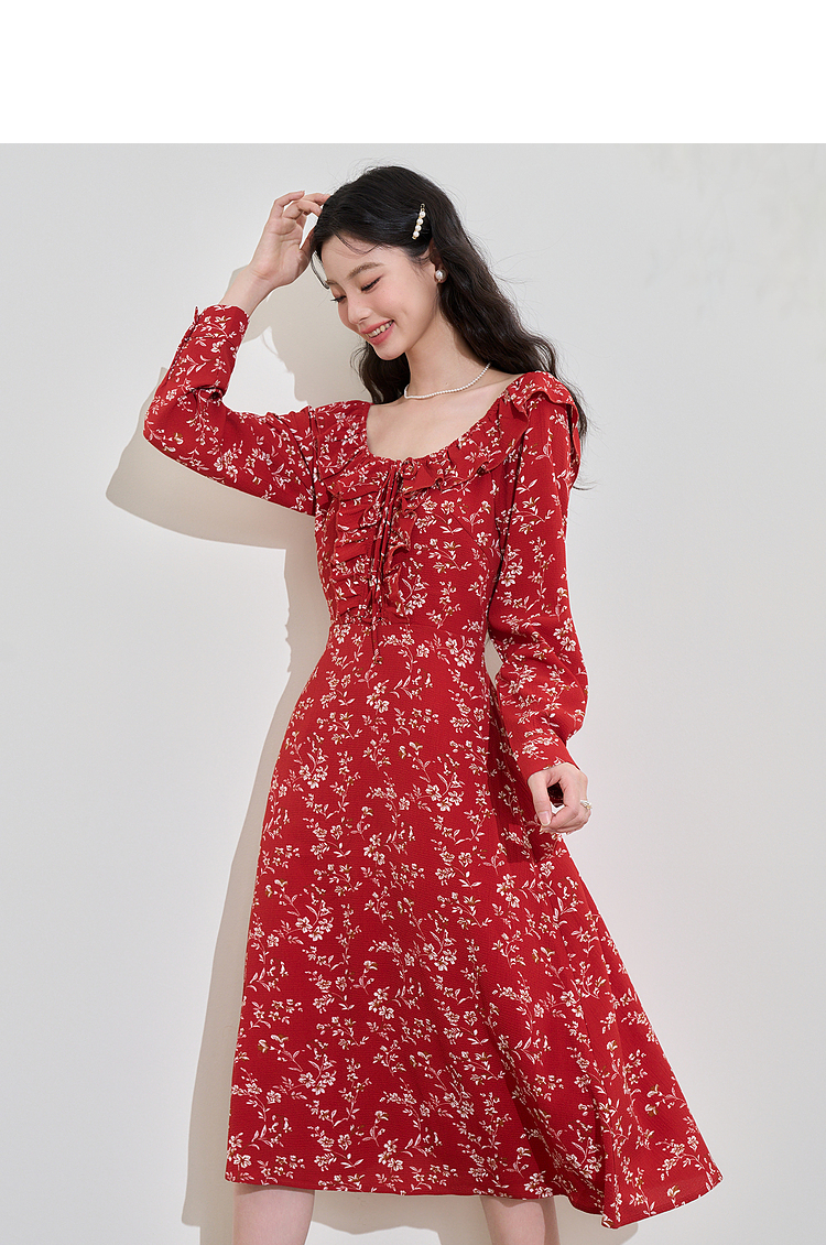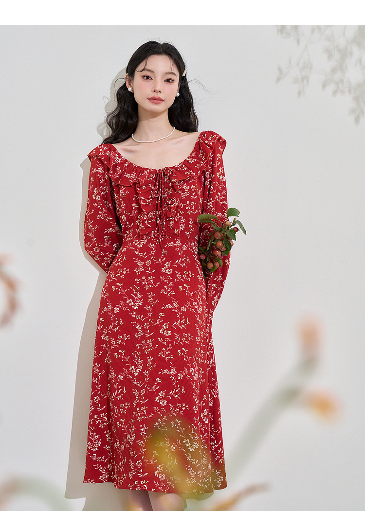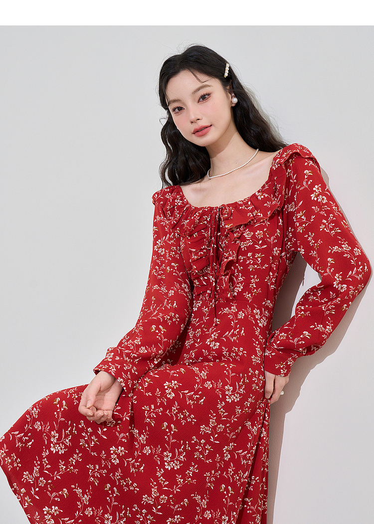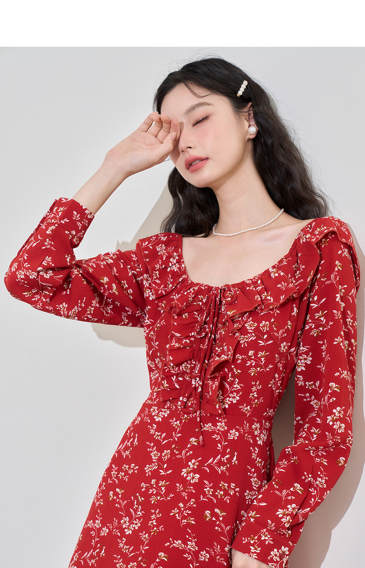 法式浪漫复古荷叶边碎花裙女早春显白显瘦U领长袖连衣裙V3042262