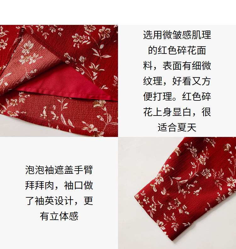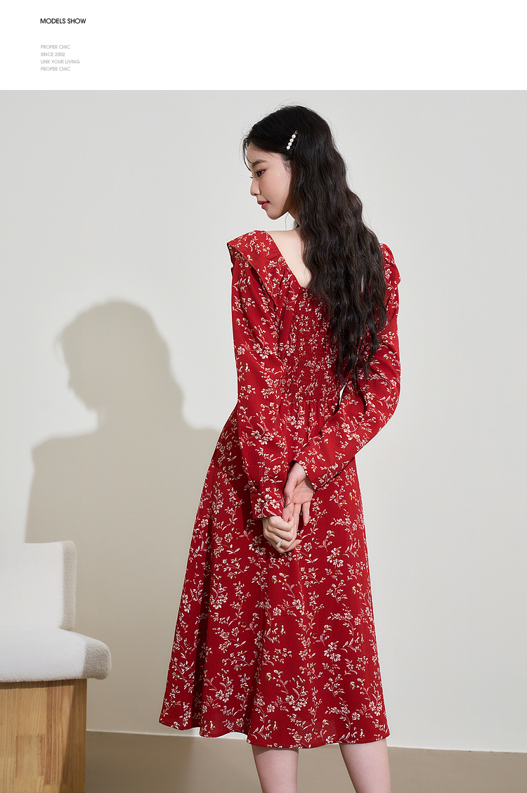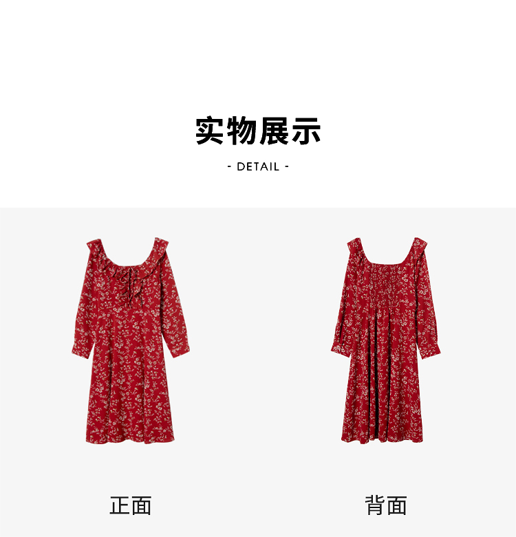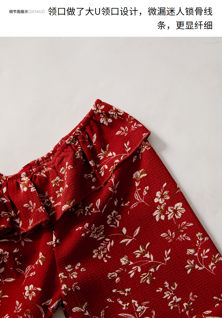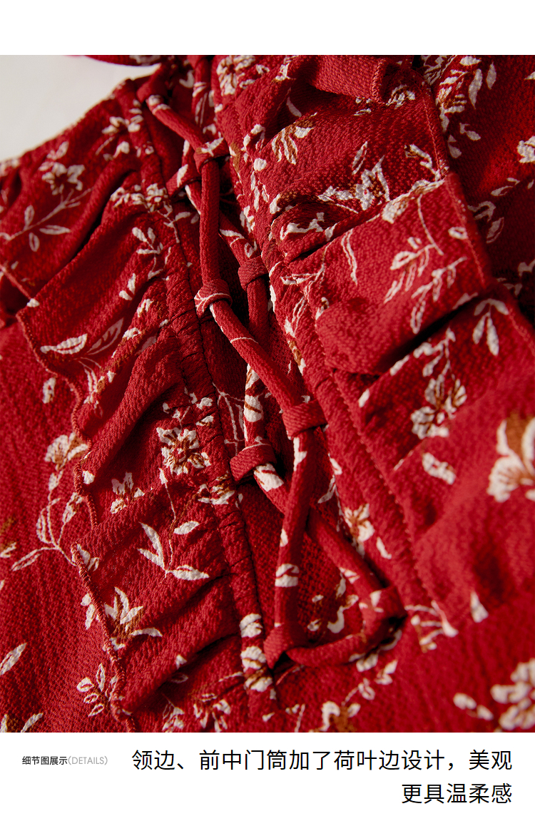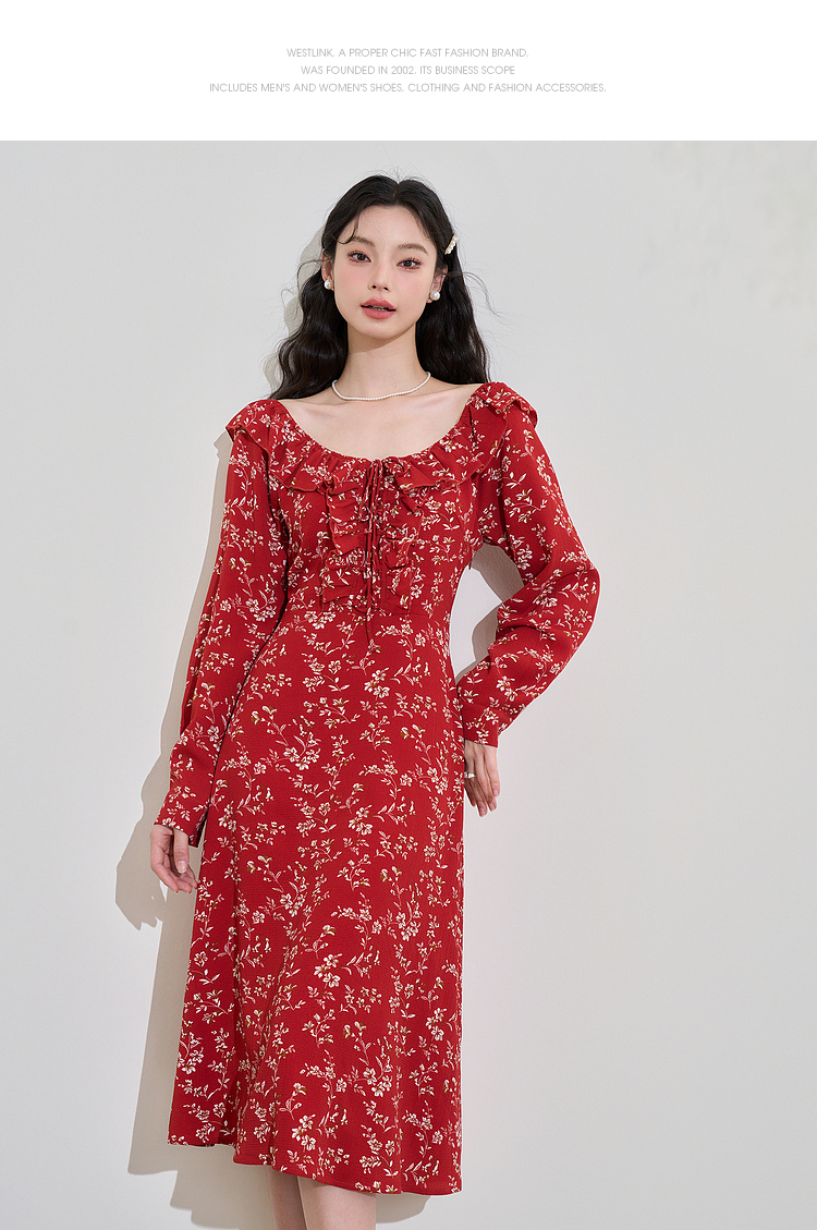 法式浪漫复古荷叶边碎花裙女早春显白显瘦U领长袖连衣裙V3042262