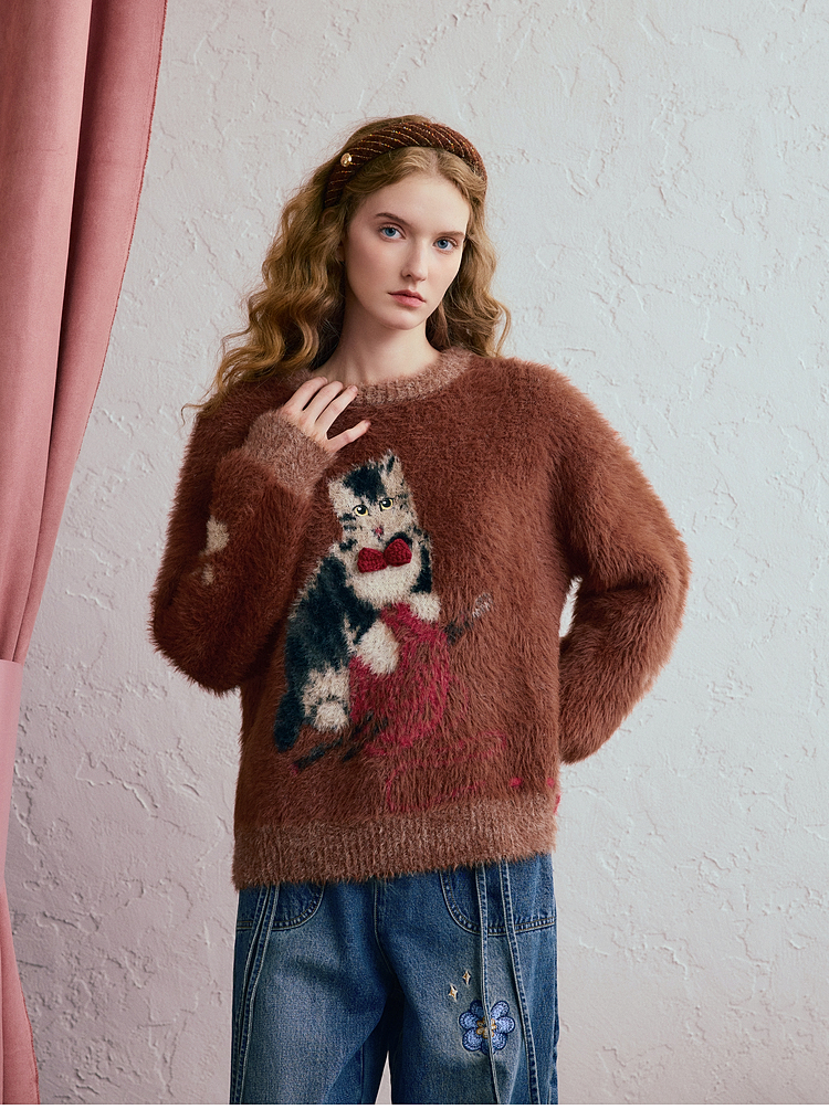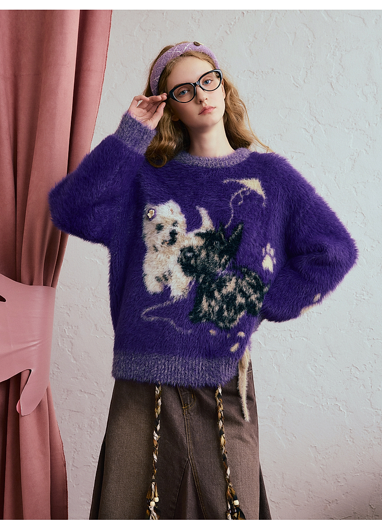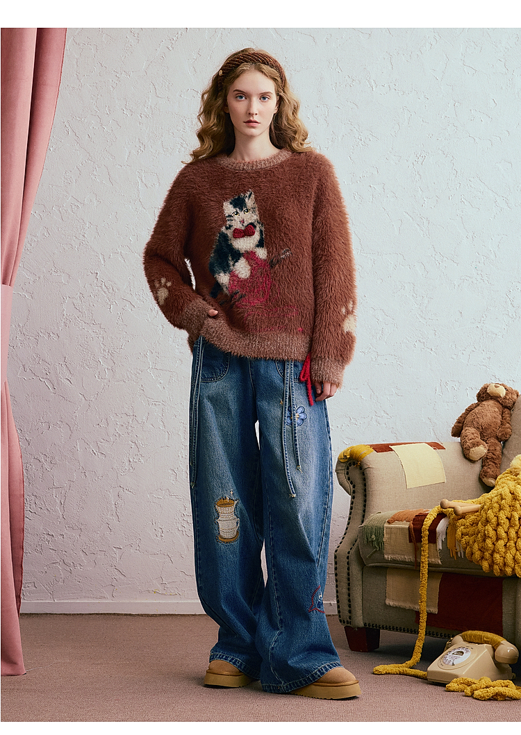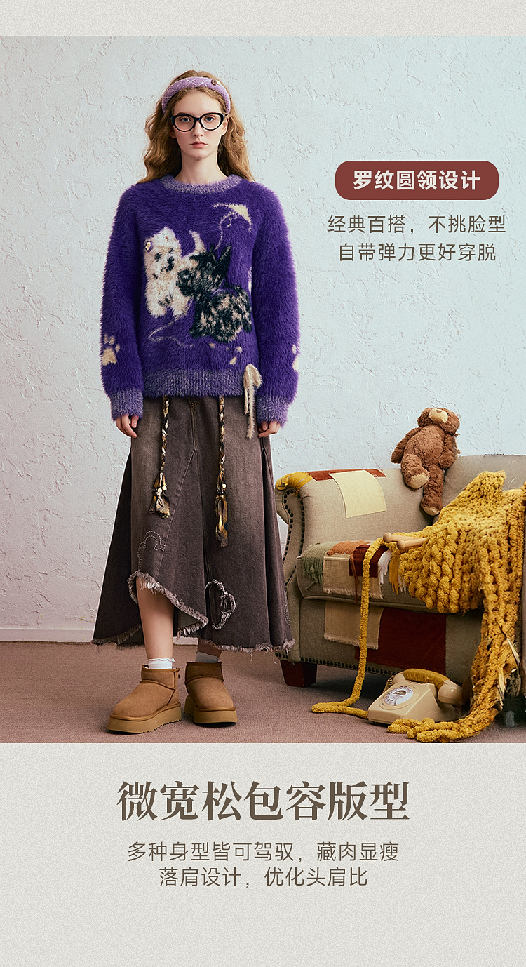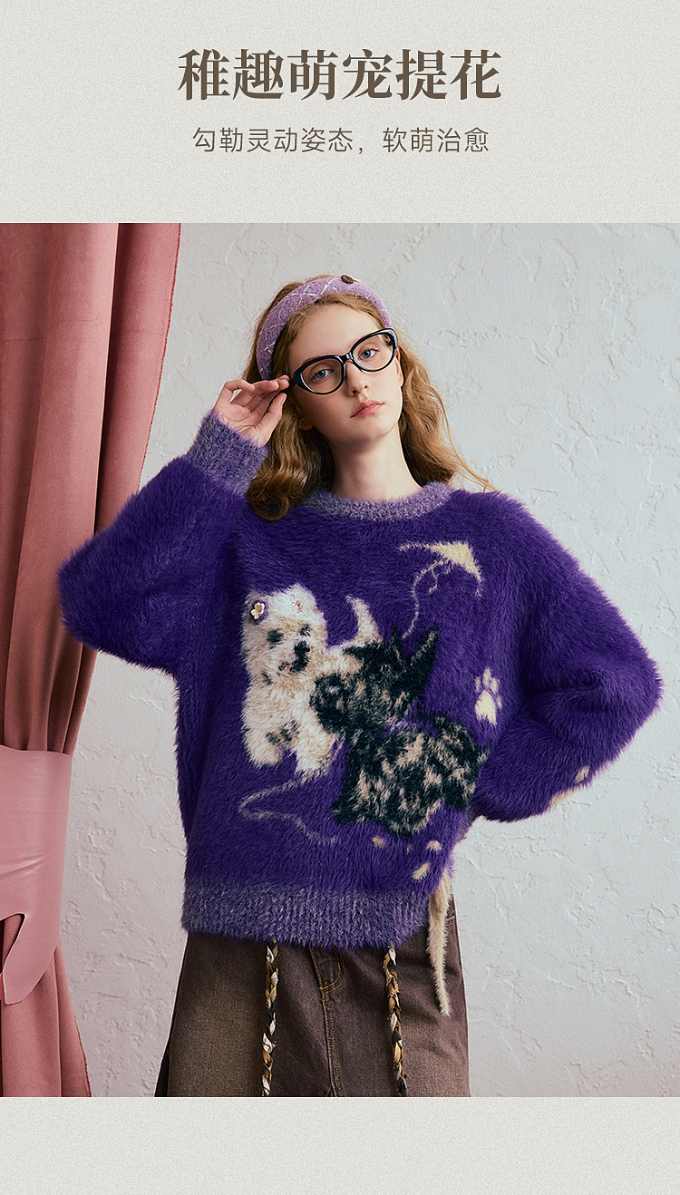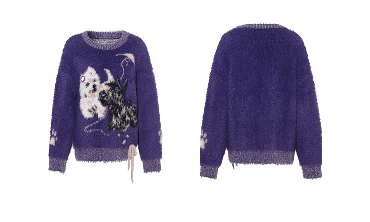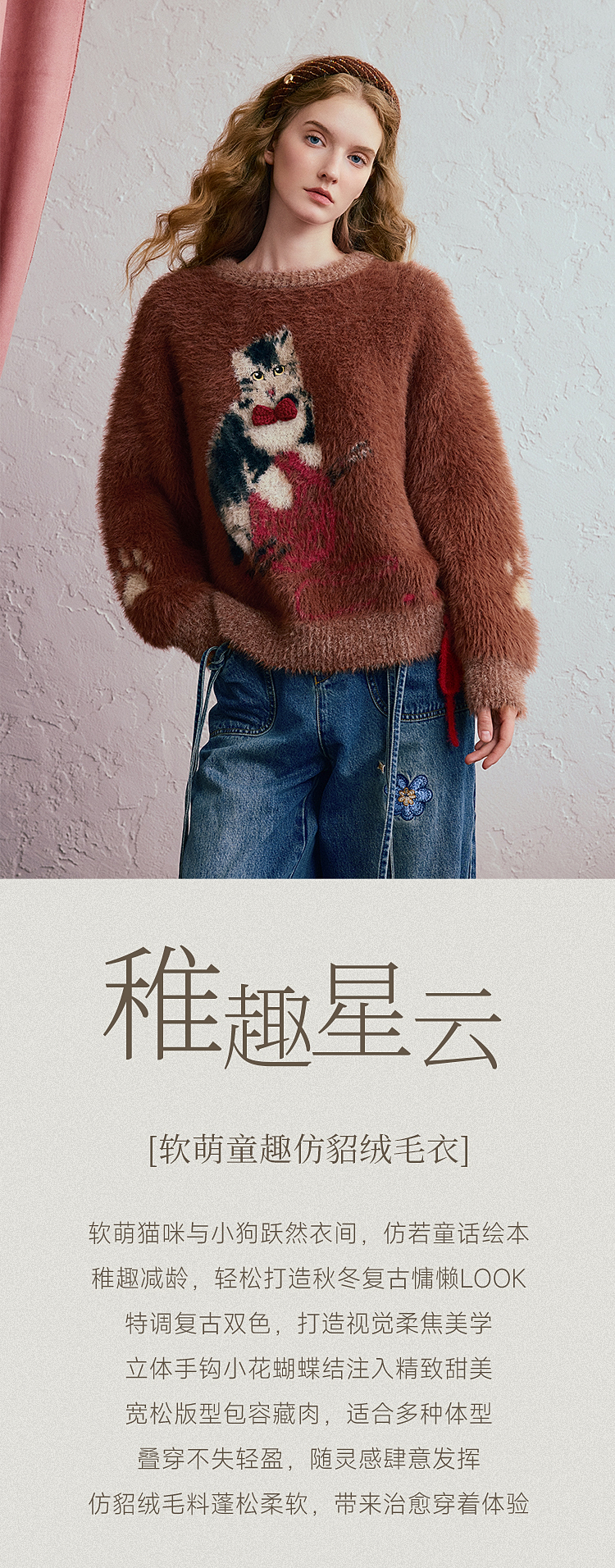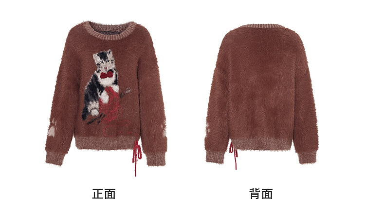 两三事稚趣星云2025冬季新款萌宠图案抽绳绑带下摆毛绒毛衣女宽松