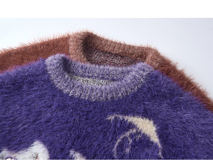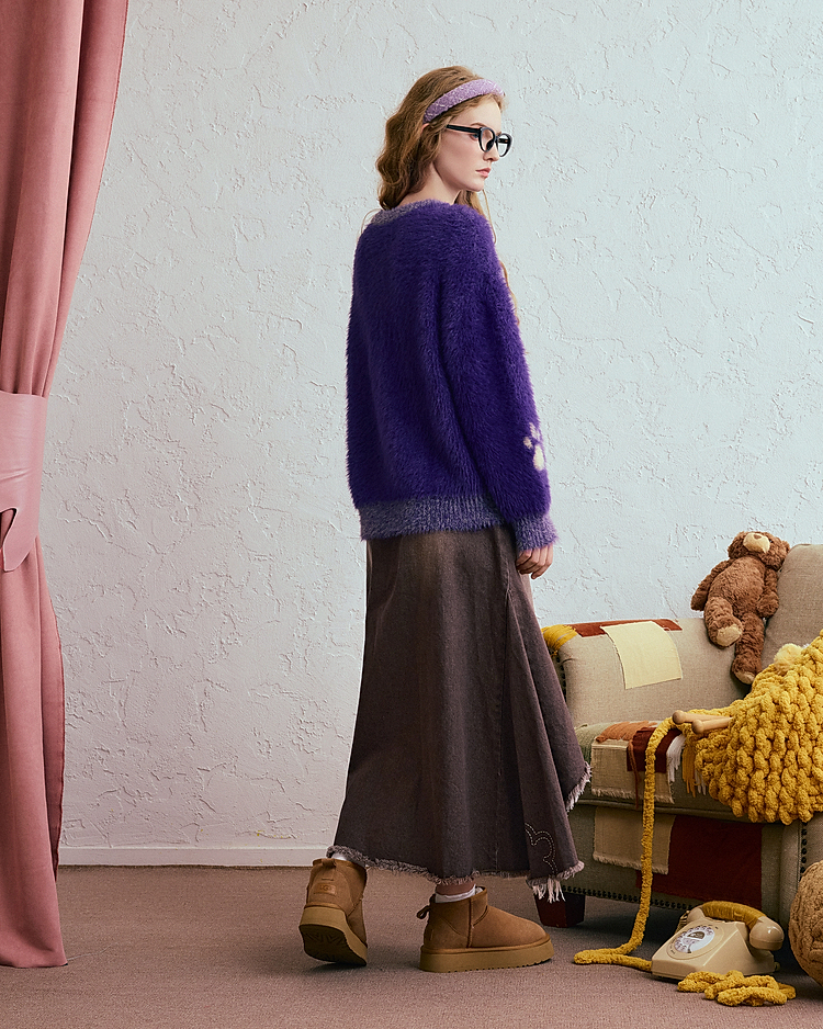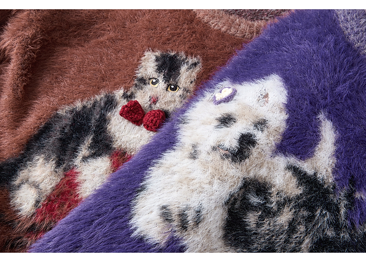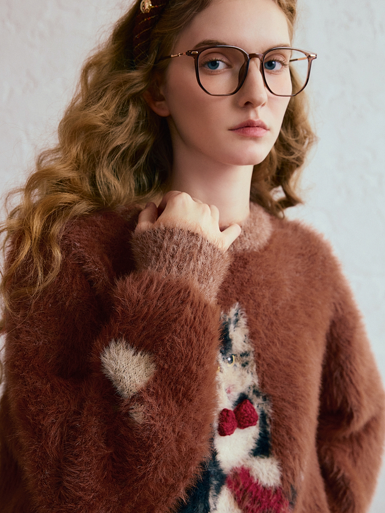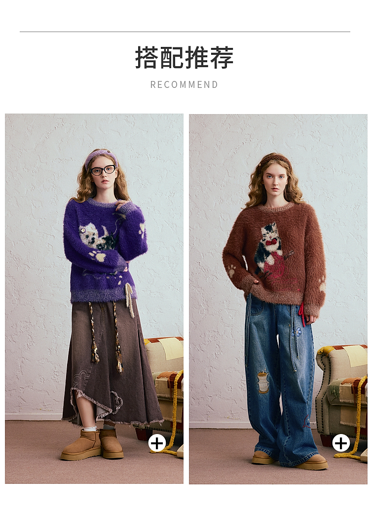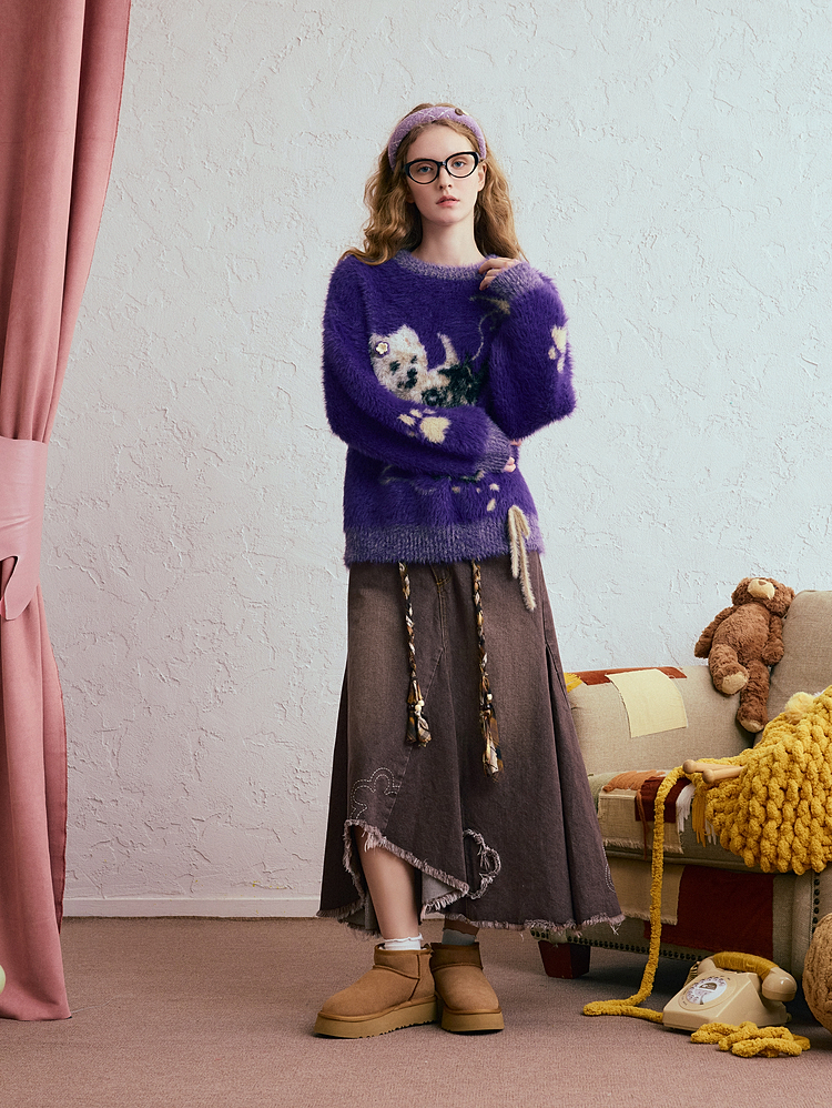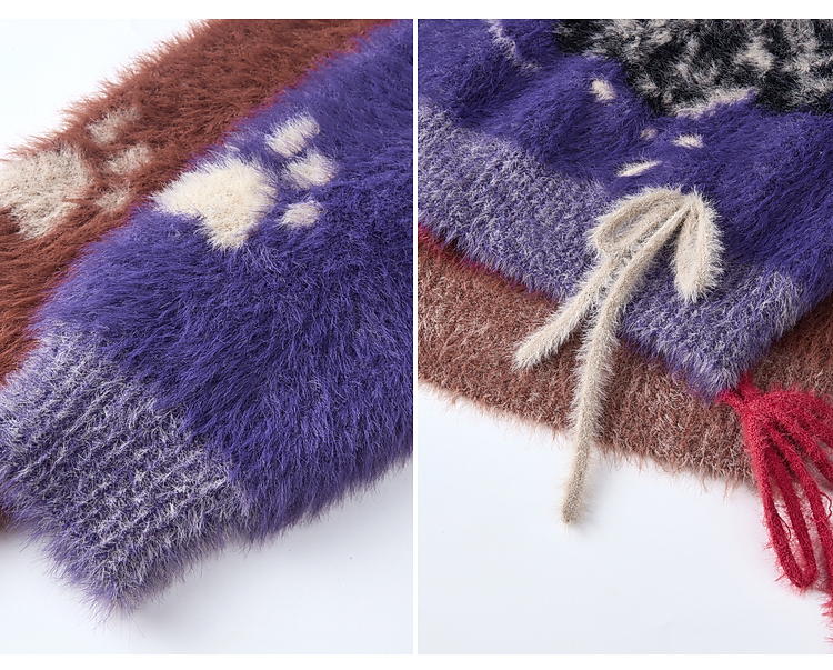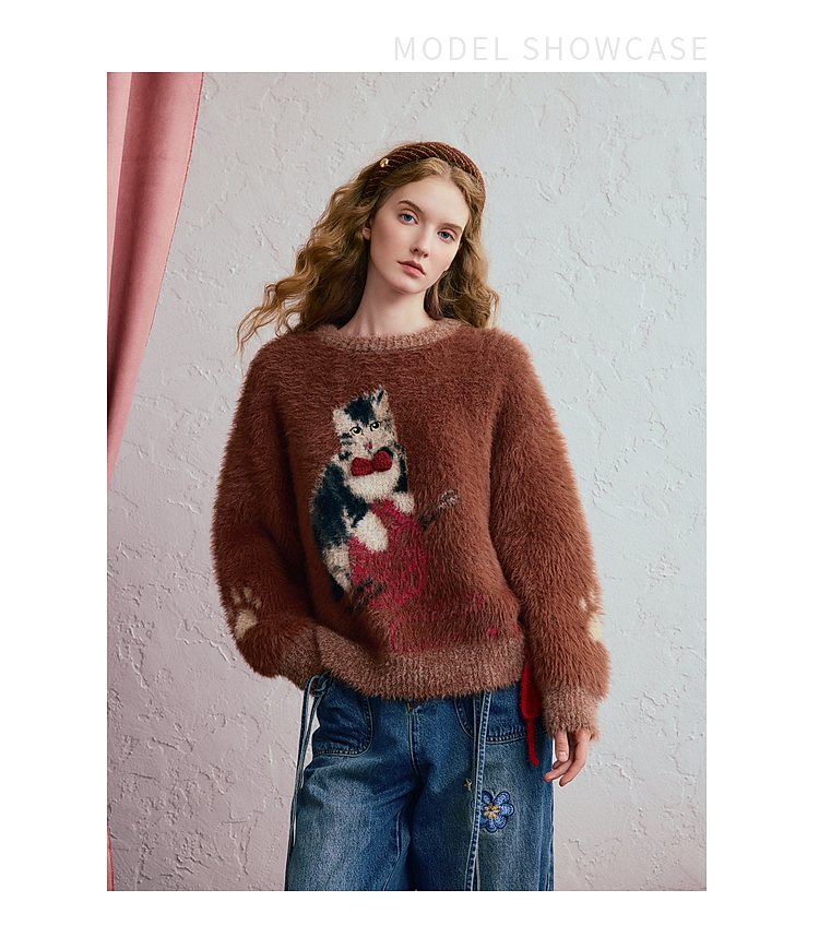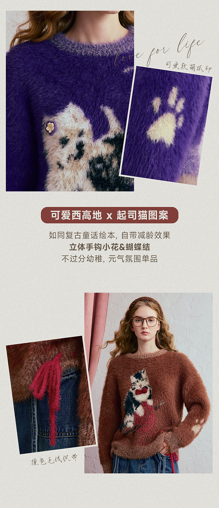 两三事稚趣星云2025冬季新款萌宠图案抽绳绑带下摆毛绒毛衣女宽松