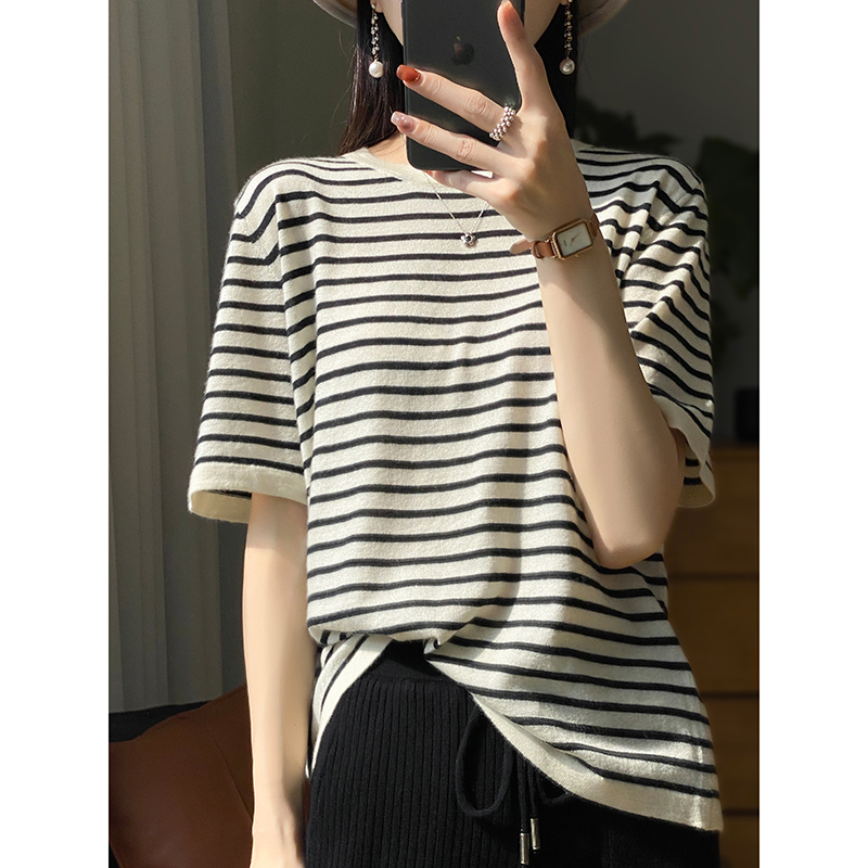 【康赛妮纱线】白厂丝羊绒!穿过不想脱!条纹减龄针织T恤女SYR01