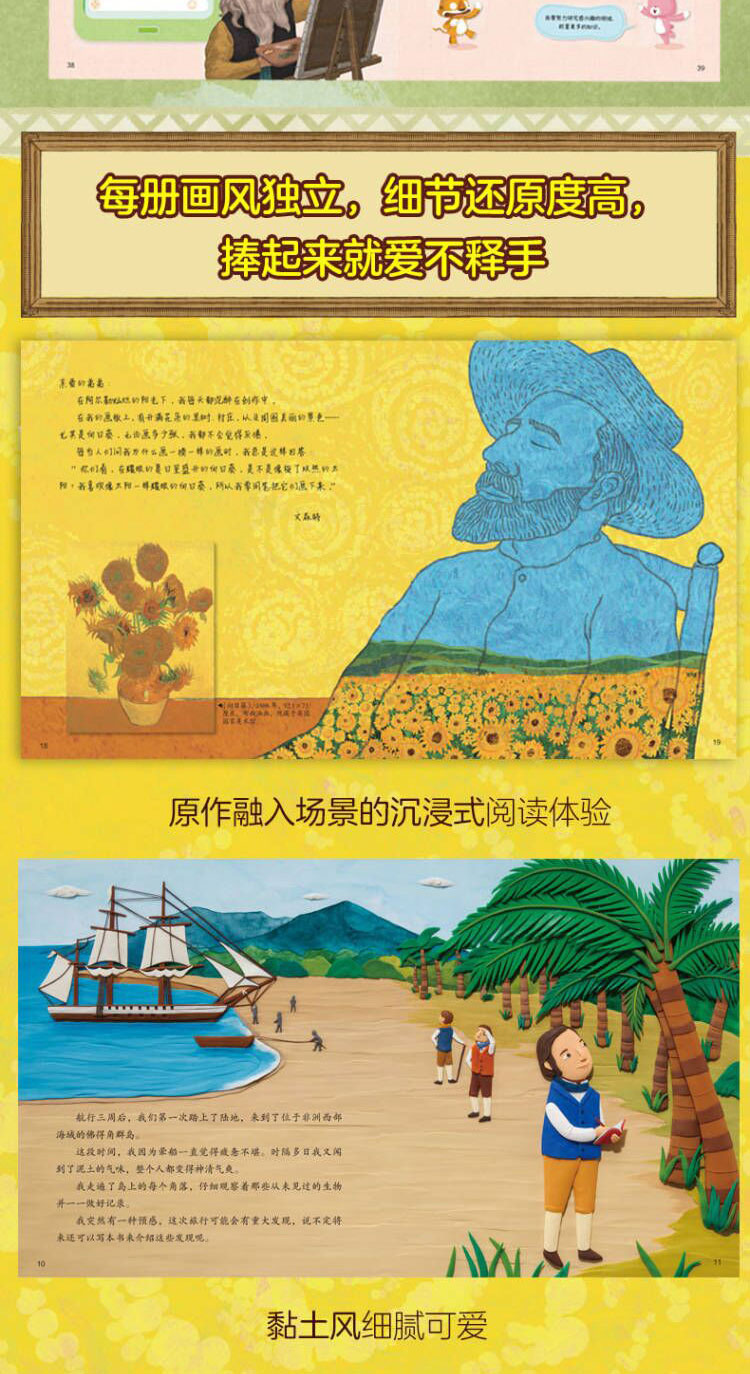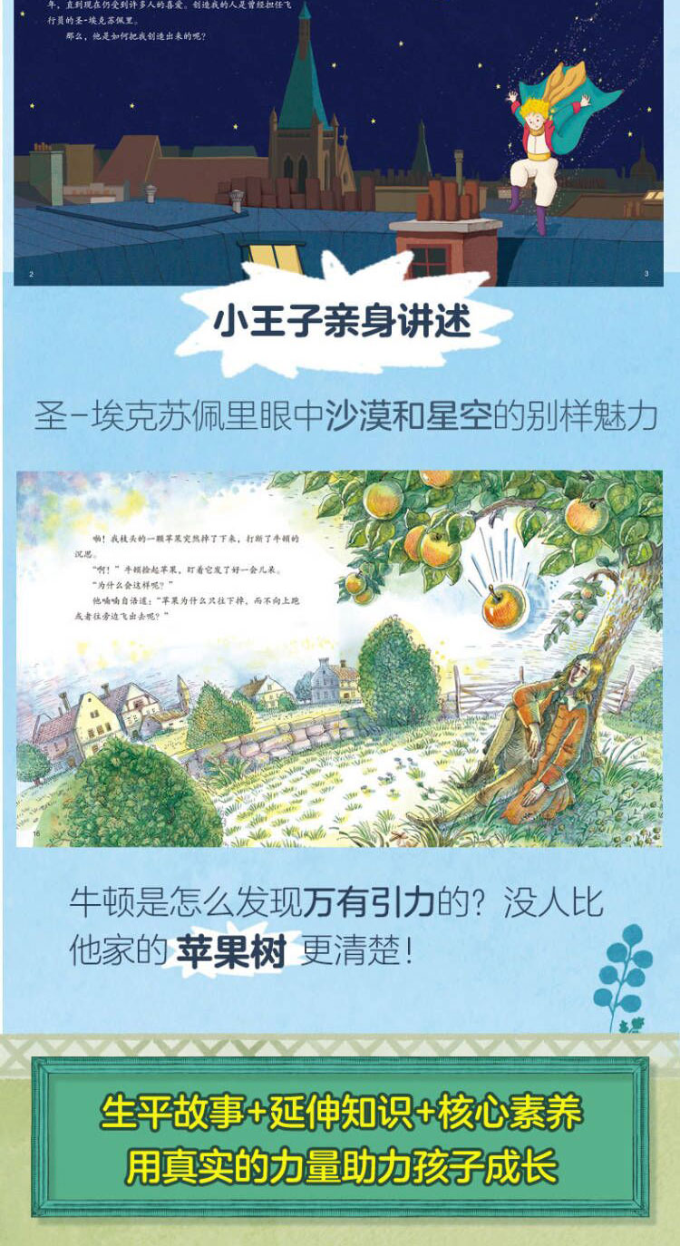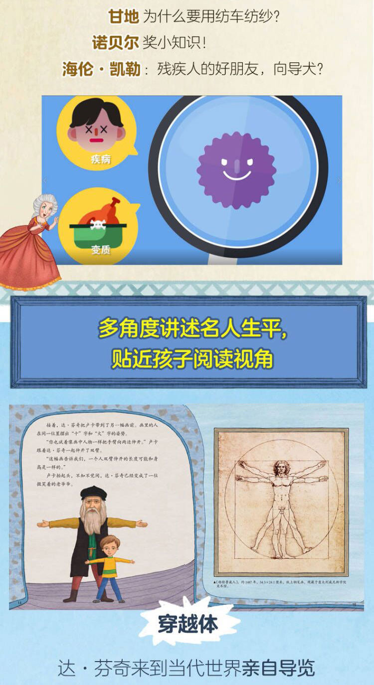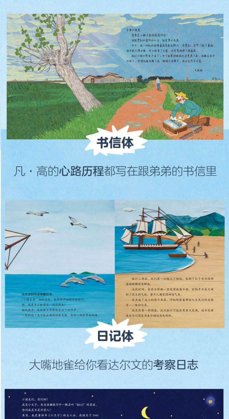 在这套书里,你能看到达·芬奇“穿越”到当代世界亲自为自己的作品当“导游”,小王子现身讲述圣-埃克苏佩里眼中沙漠和星空的壮阔、浪漫,凡·高通过书信体直观展现自己的创作历程,牛顿家的苹果树和加拉帕戈斯群岛的大嘴地雀分别讲述各自的奇遇……多样化的叙述角度,让每一次阅读都是新奇之旅。