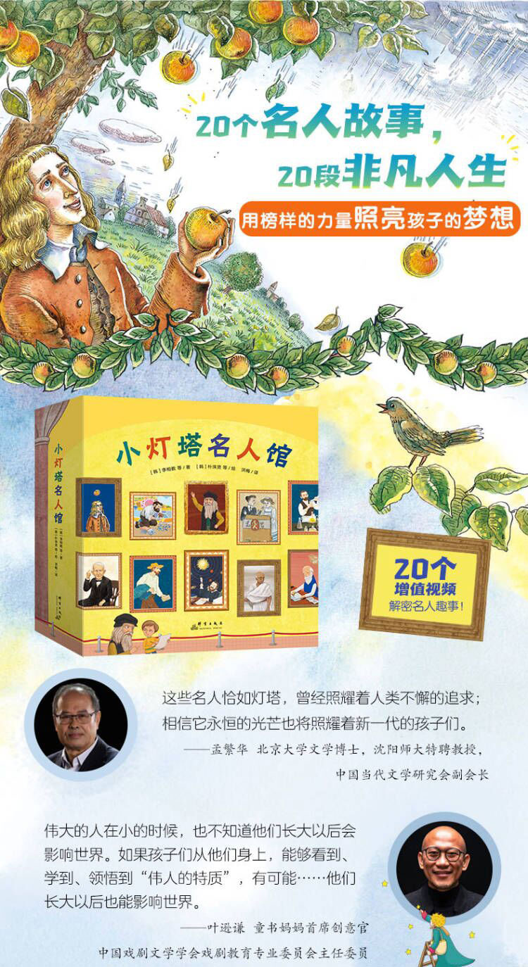 《小灯塔名人馆》共20册,涵盖文化、科学、艺术等多个领域。通过日记体、穿越体、书信体等多种视角,讲述20位名人的非凡人生。全书附赠4种类型共20个增值视频,通过职业体验、地区探访等展现形式,带孩子了解名人趣事。书中还设有“走近名人”“知识拓展”“分享心得”三个栏目,补充相关名人历史背景知识,带孩子更加深入地了解名人历程,让读故事和学知识有效衔接。每册一个核心素养,收获成长的力量。