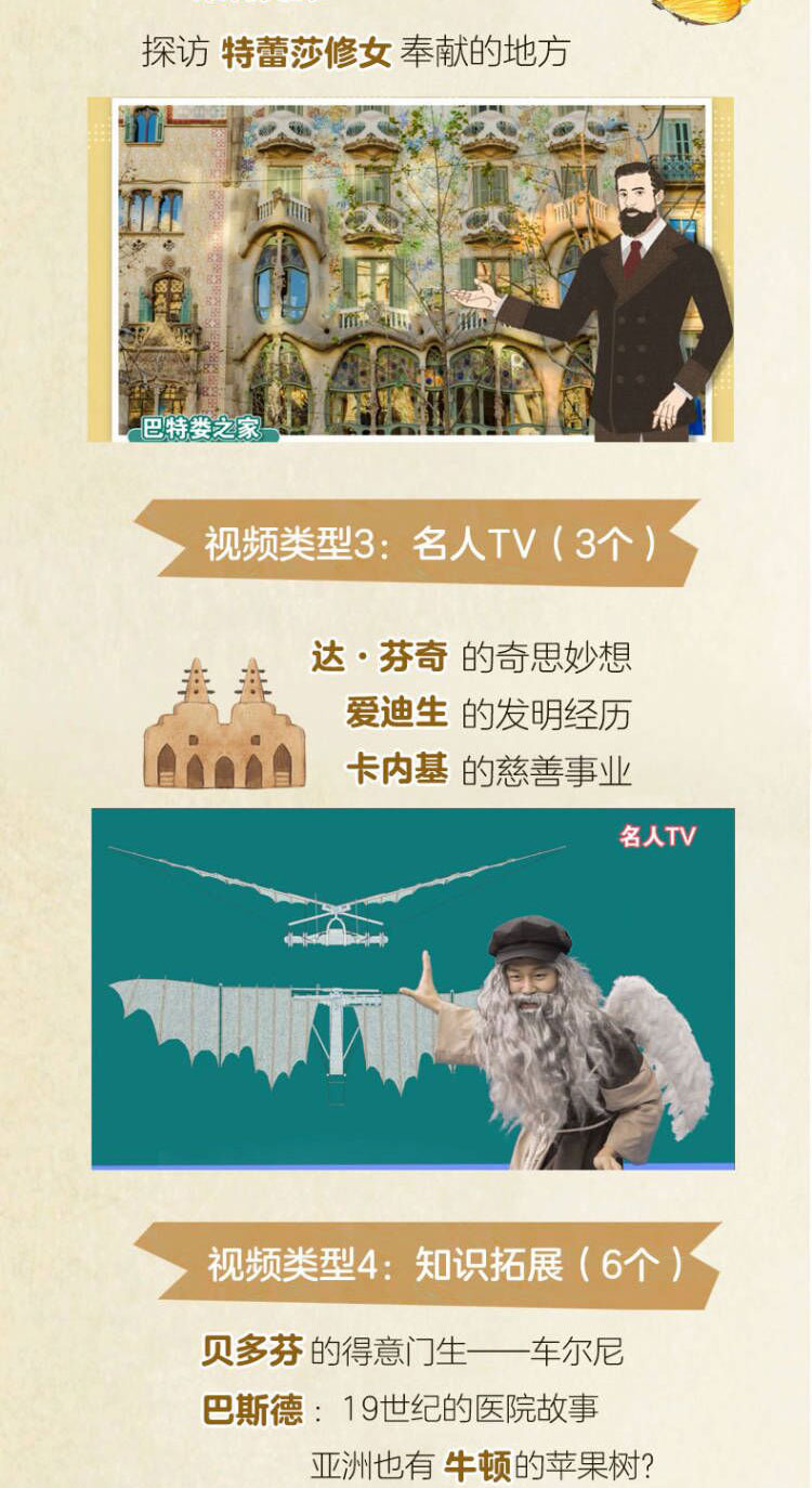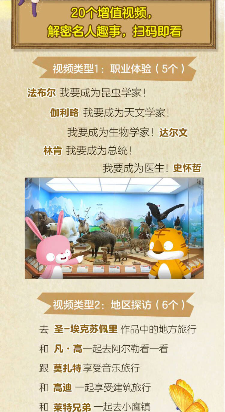 4种类型共20个增值视频,涉及职业体验、地区探访、名人TV和知识拓展,兼具趣味性与互动性,给孩子满满参与感。