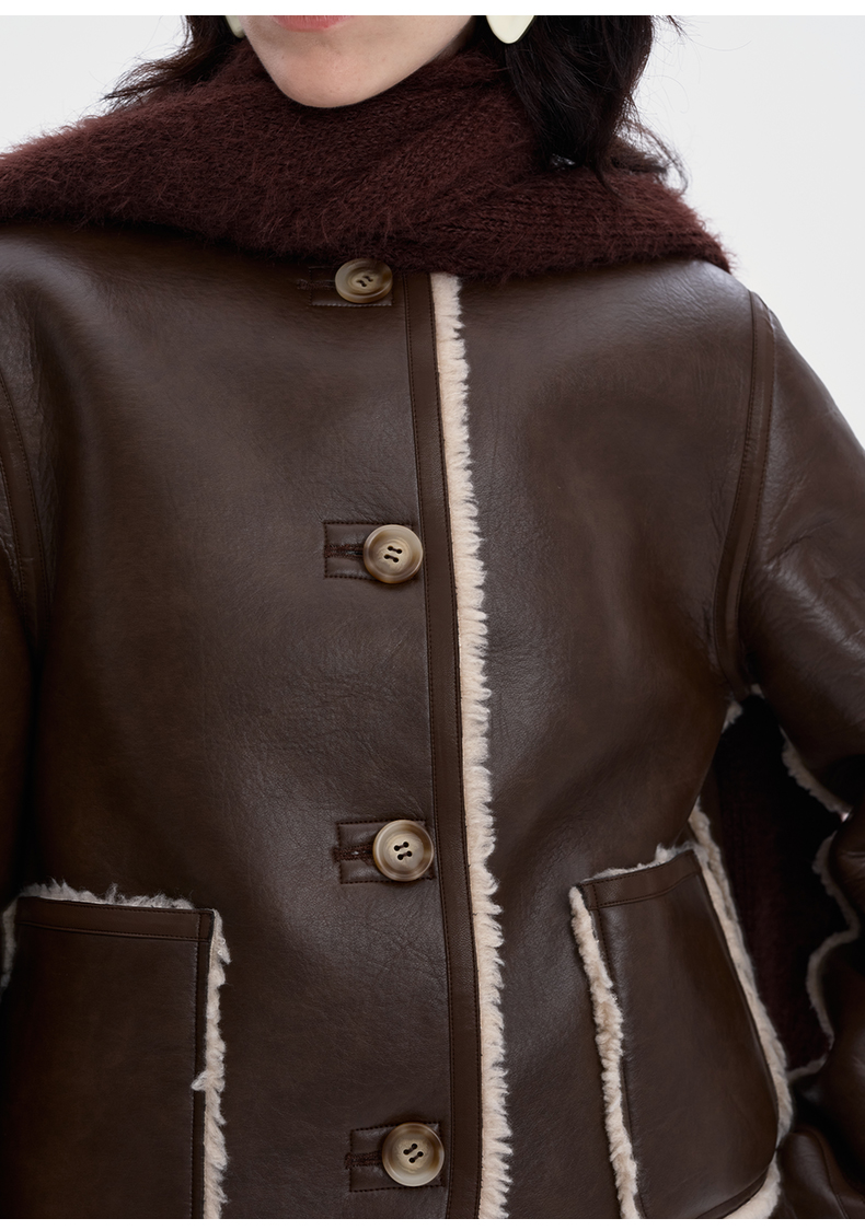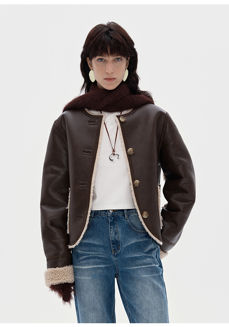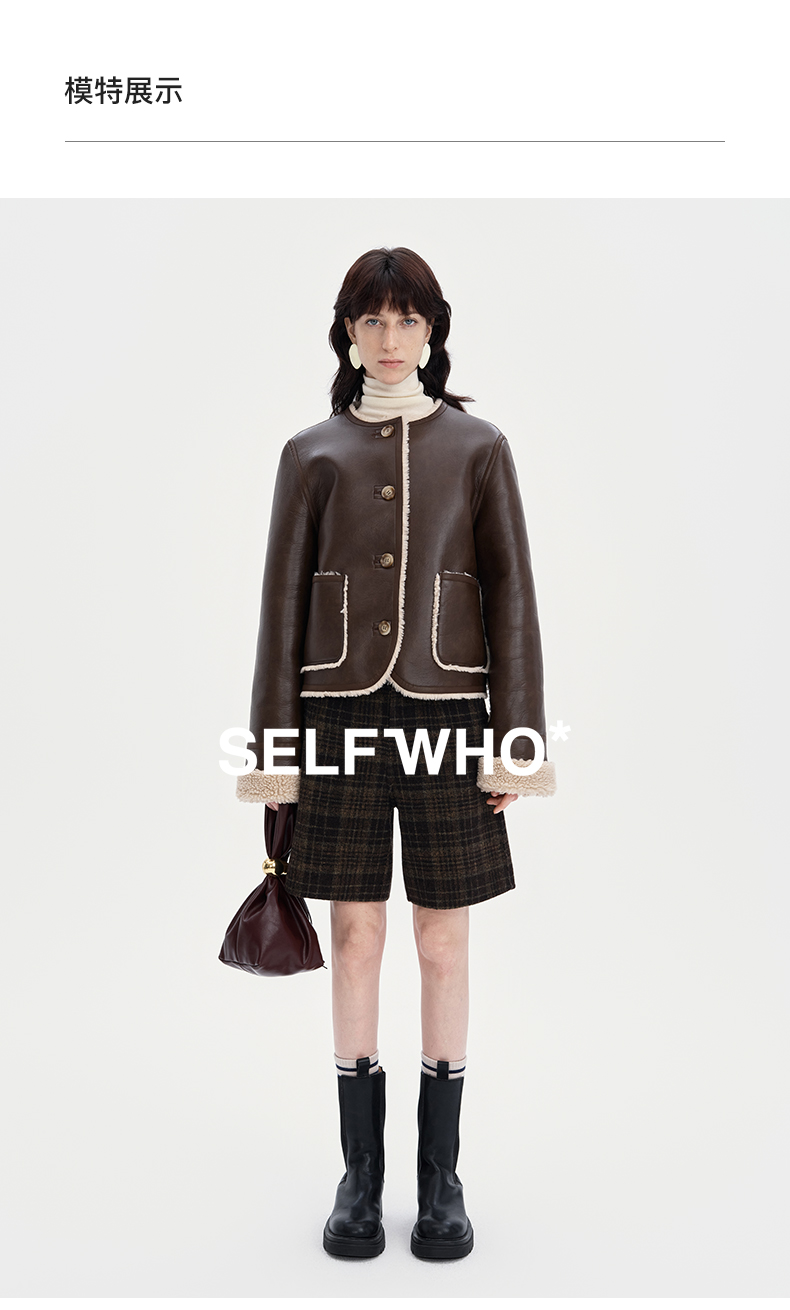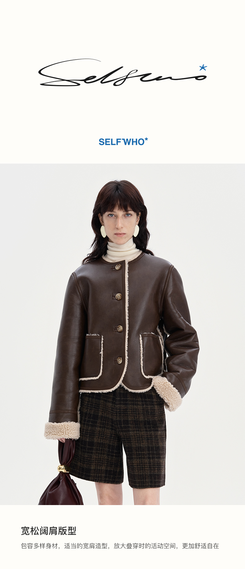 SELFWHO复古酒红棕pu皮草外套女秋冬2024新款皮毛一体设计感夹克