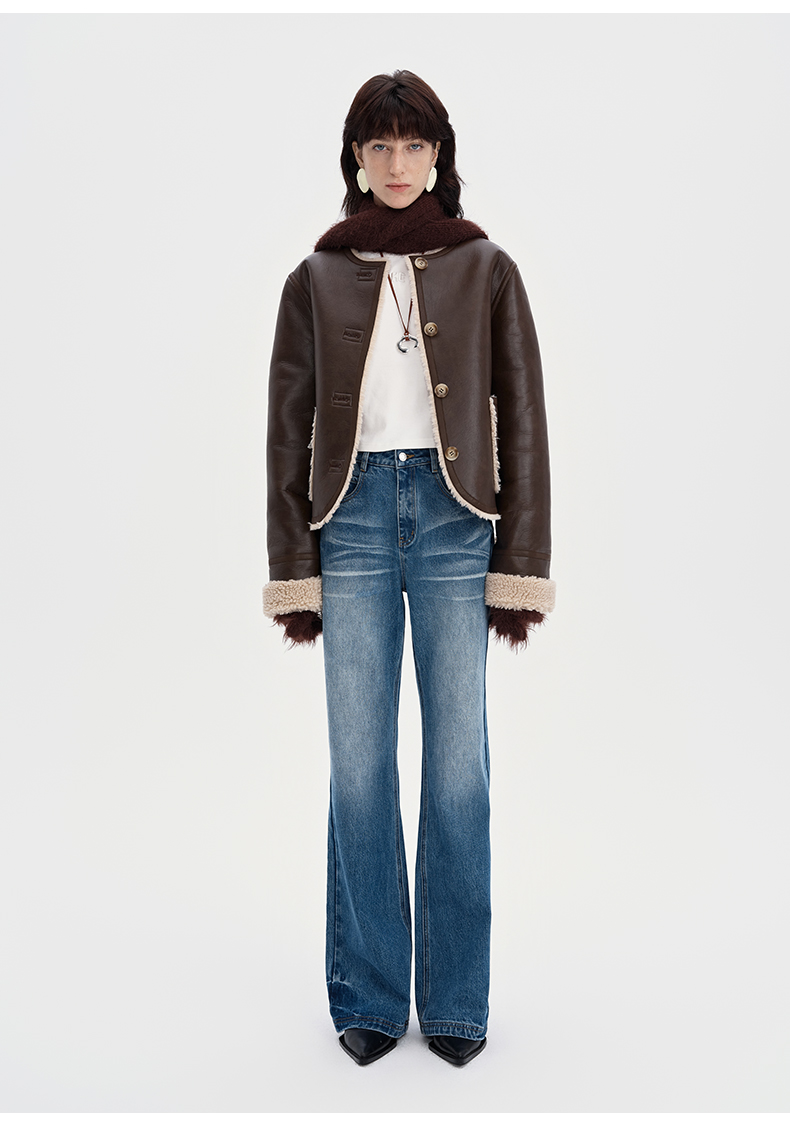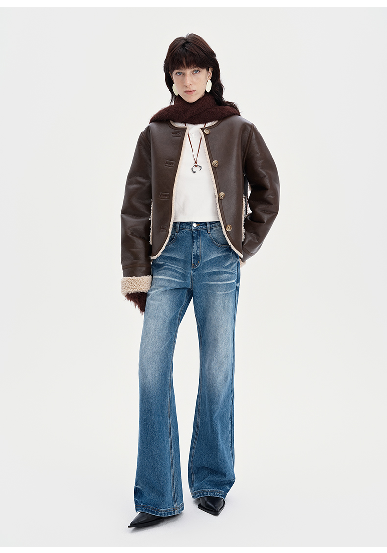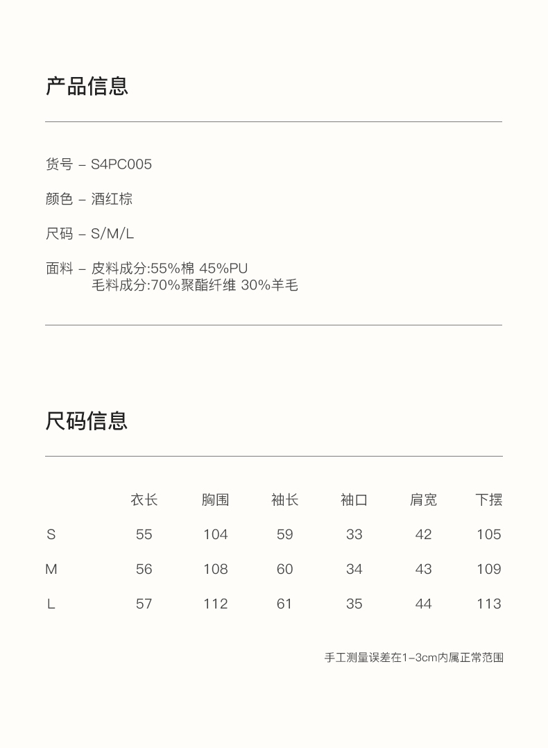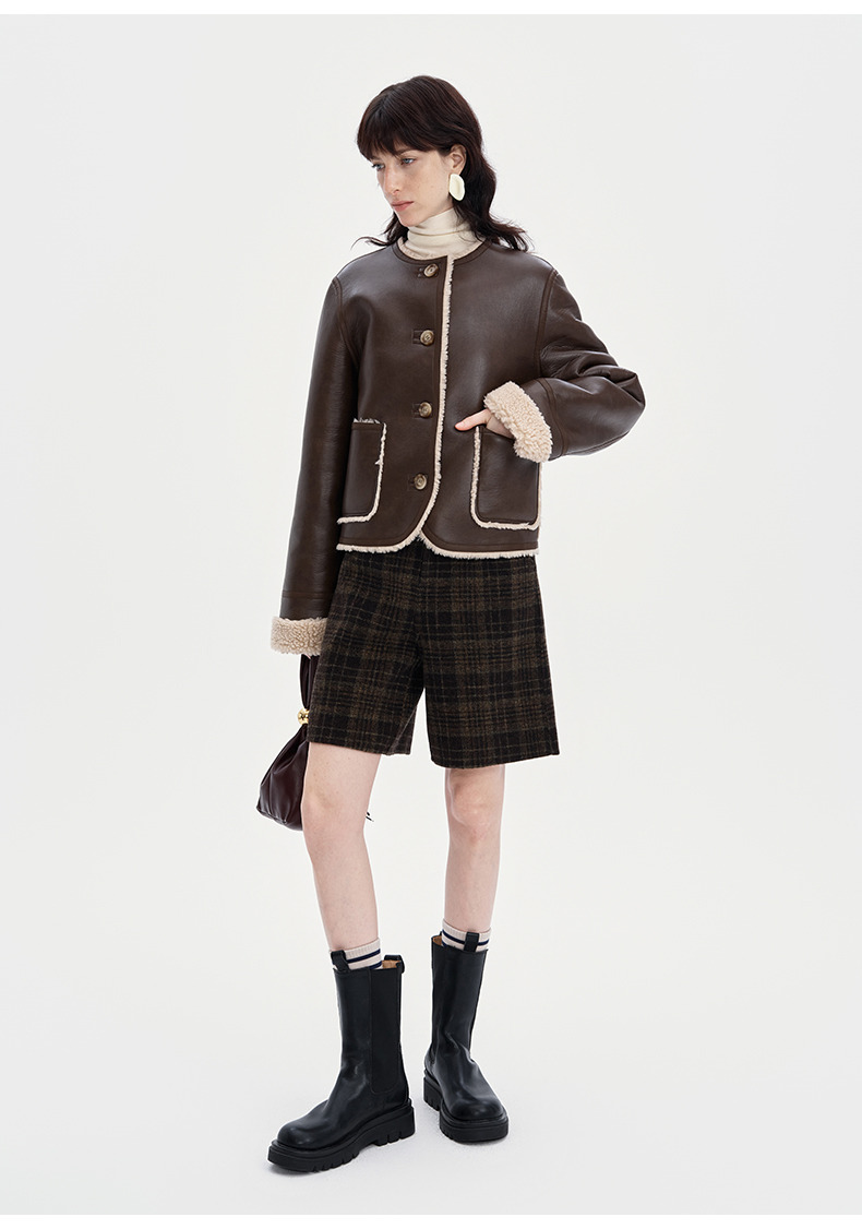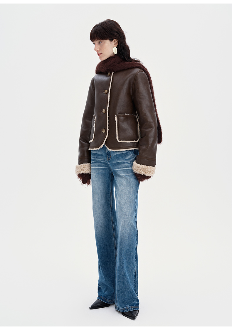 SELFWHO复古酒红棕pu皮草外套女秋冬2024新款皮毛一体设计感夹克