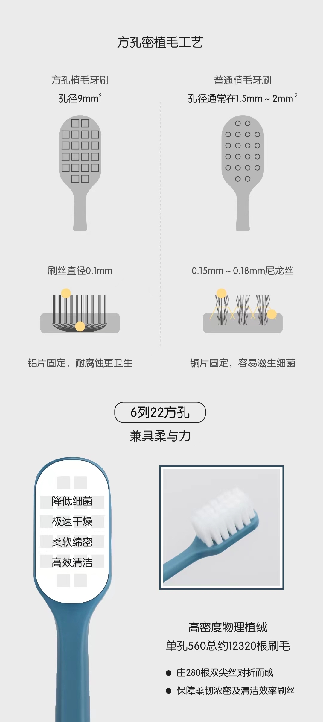 ③6列22方孔密集值毛技术全方位包裹牙齿