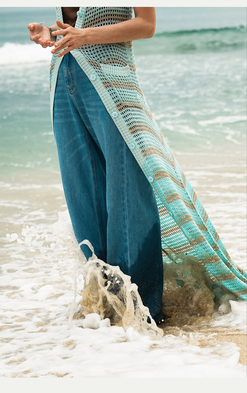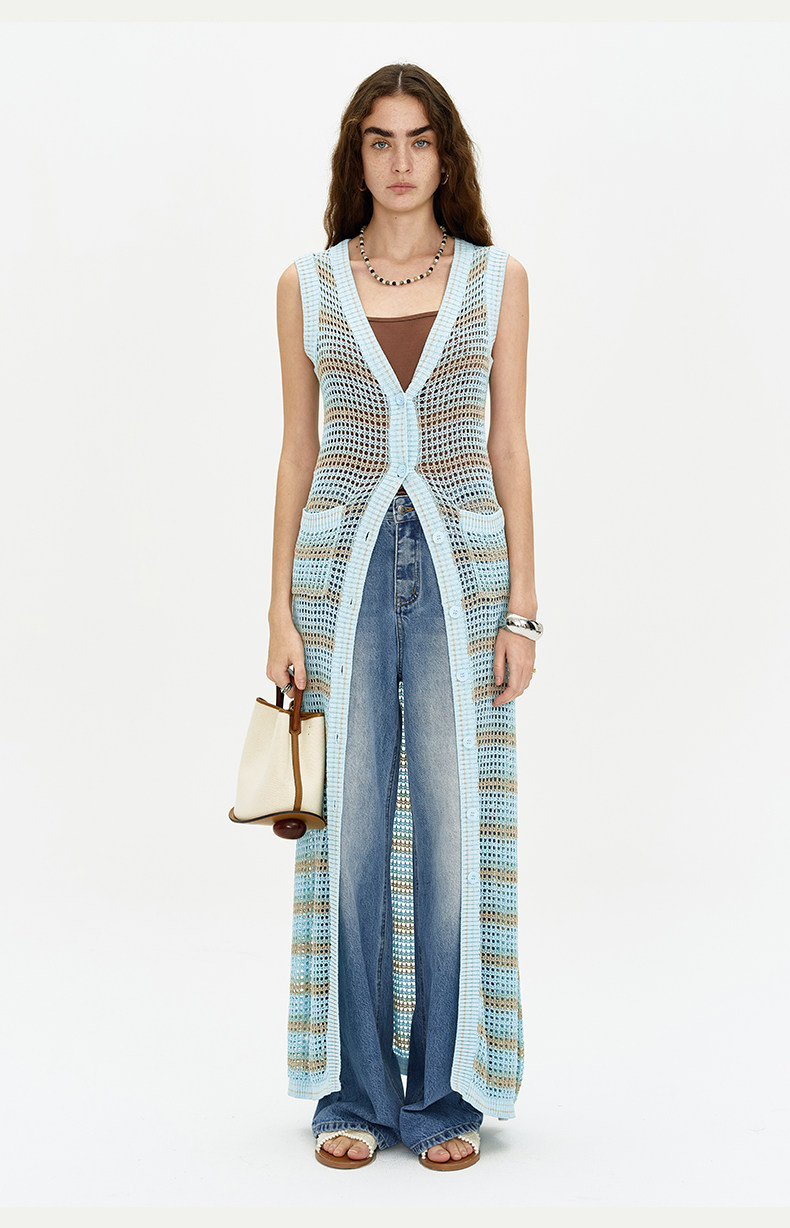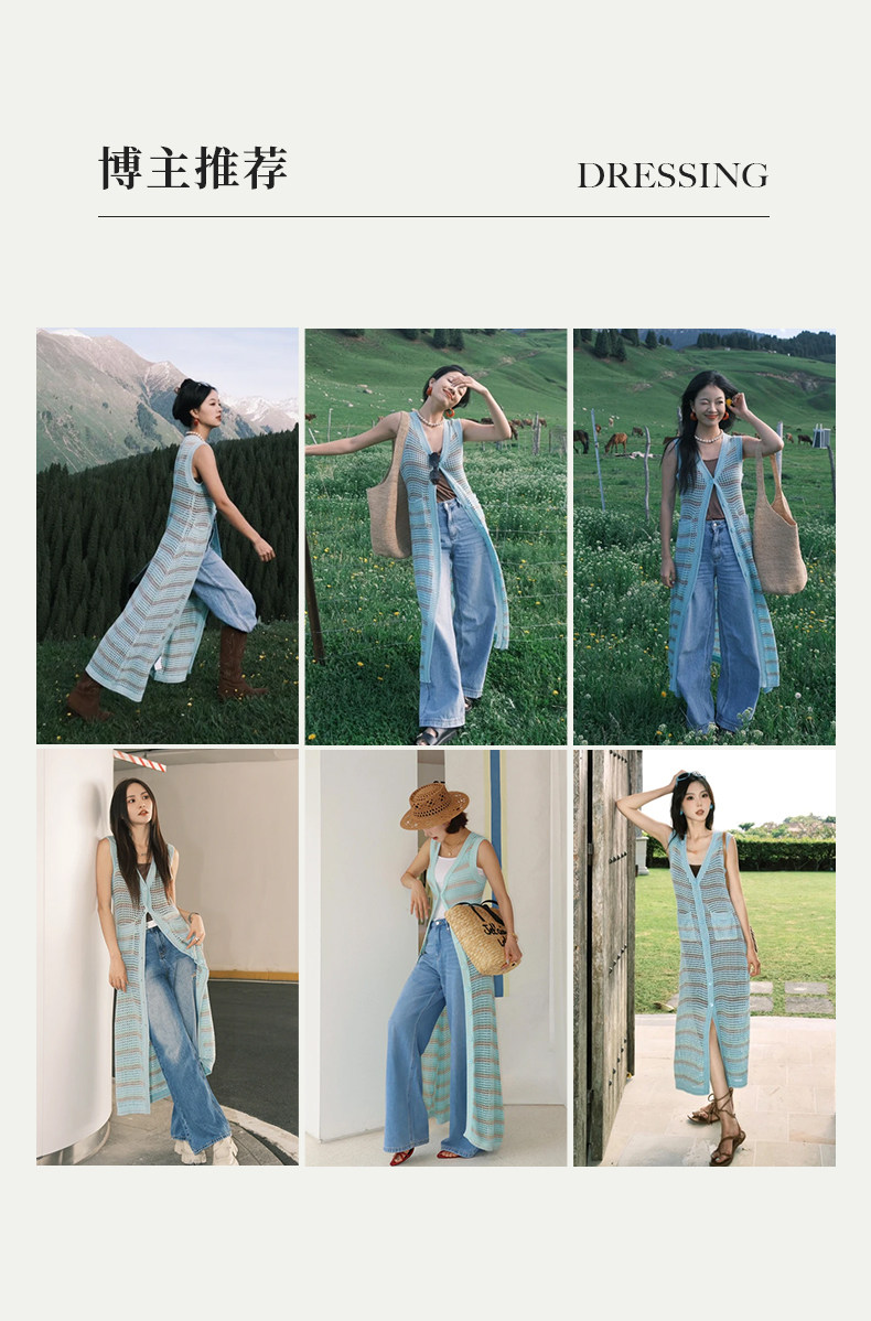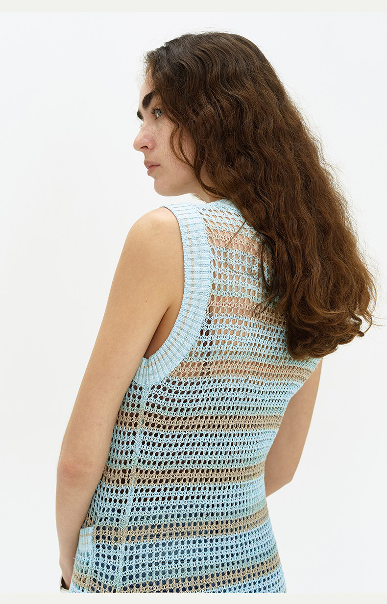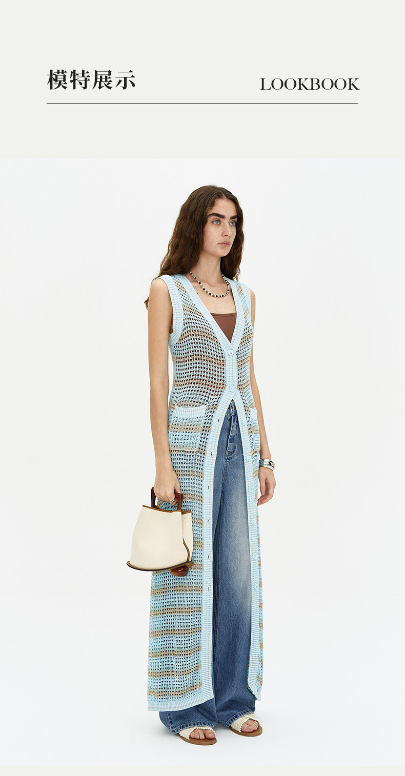 [赵昭仪同款]SELFWHO针织开衫连衣裙女夏季条纹镂空海边度假长裙