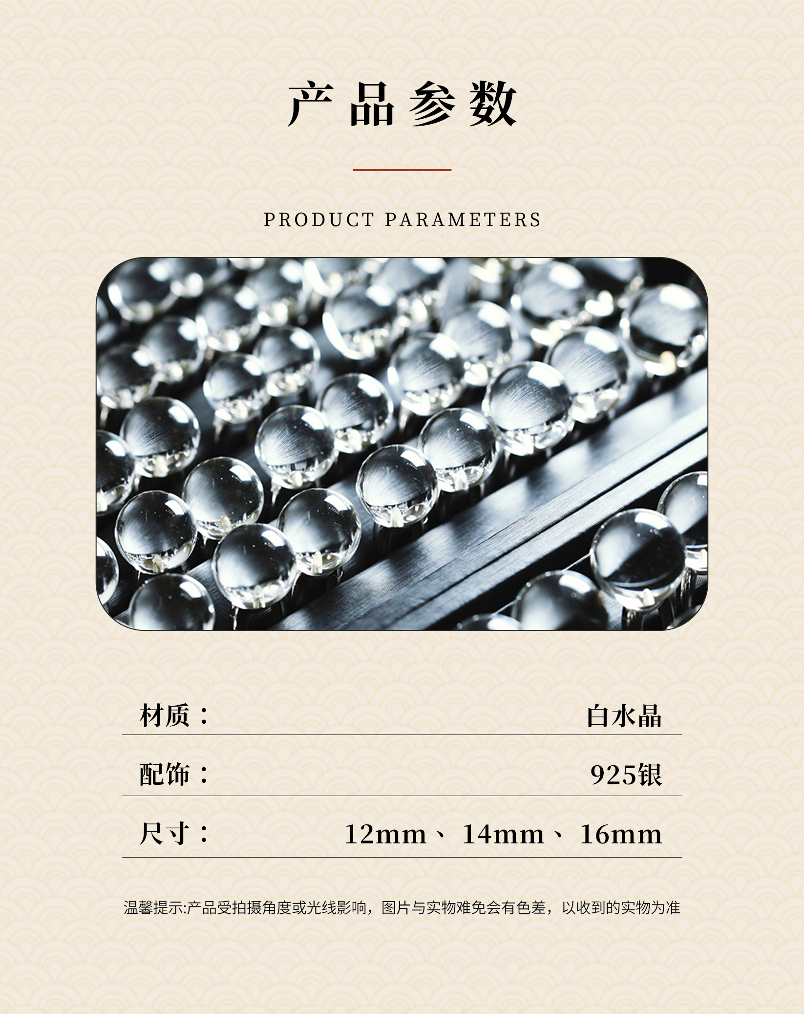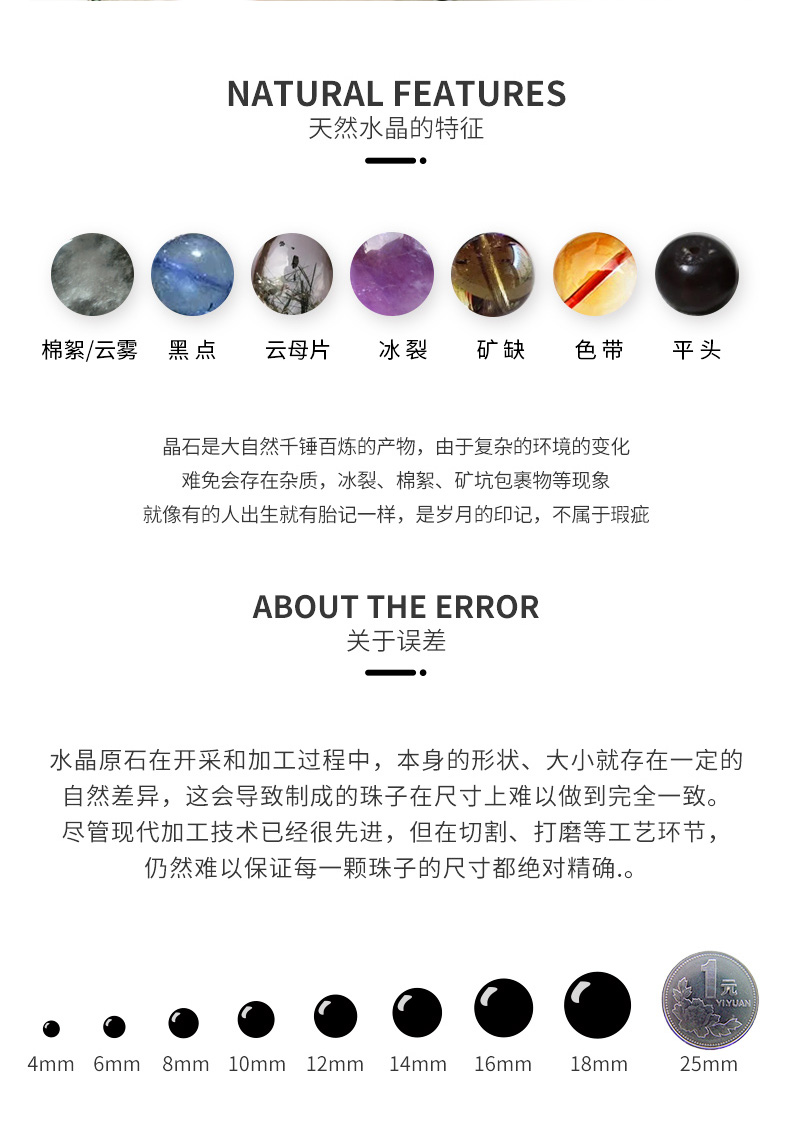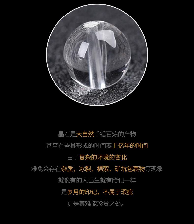 品名:水晶系列 发货地:江苏连云港 发货时效:5-7天,部分款式72小时可发 物流信息:默认中通快递,不接受指定快递。除港澳台不发货外,全国包邮。 关于售后 不影响二次销售,支持七天无理由退换货,运费自理。 非人为原因损坏,925银配件3个月质保,合金类配件1个月质保,换新或免费维修 温馨提示: 1.避免磕碰 2.不接触化学物品、不泡水 3.避免高温高热的环境, A保养方法:手串佩戴时间久了,咱们可以拿一瓶养护油,第一滴在手心搓匀,把玩,会慢慢改善这个现象哈! B长期不佩戴需密封保存,尤其是有银饰配件的饰品哈! 关于色差:因显示器,拍摄光线,角度不同存在些许色差,请以收到的实物为准,色差情况属正常情况 关于尺寸,克重:产品数据为手工测量,存在微小数值误差,请以实物为准,敬请谅解! 根据产品大小进行包装,两款包装不接受指定! |