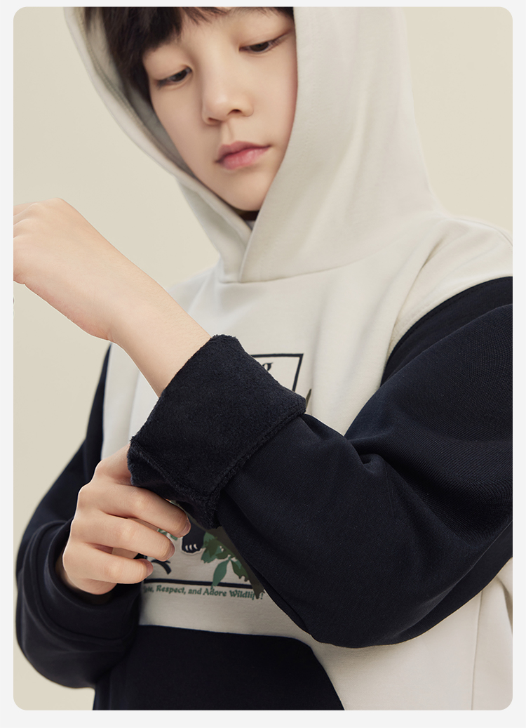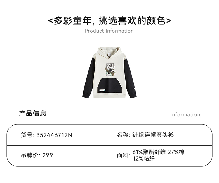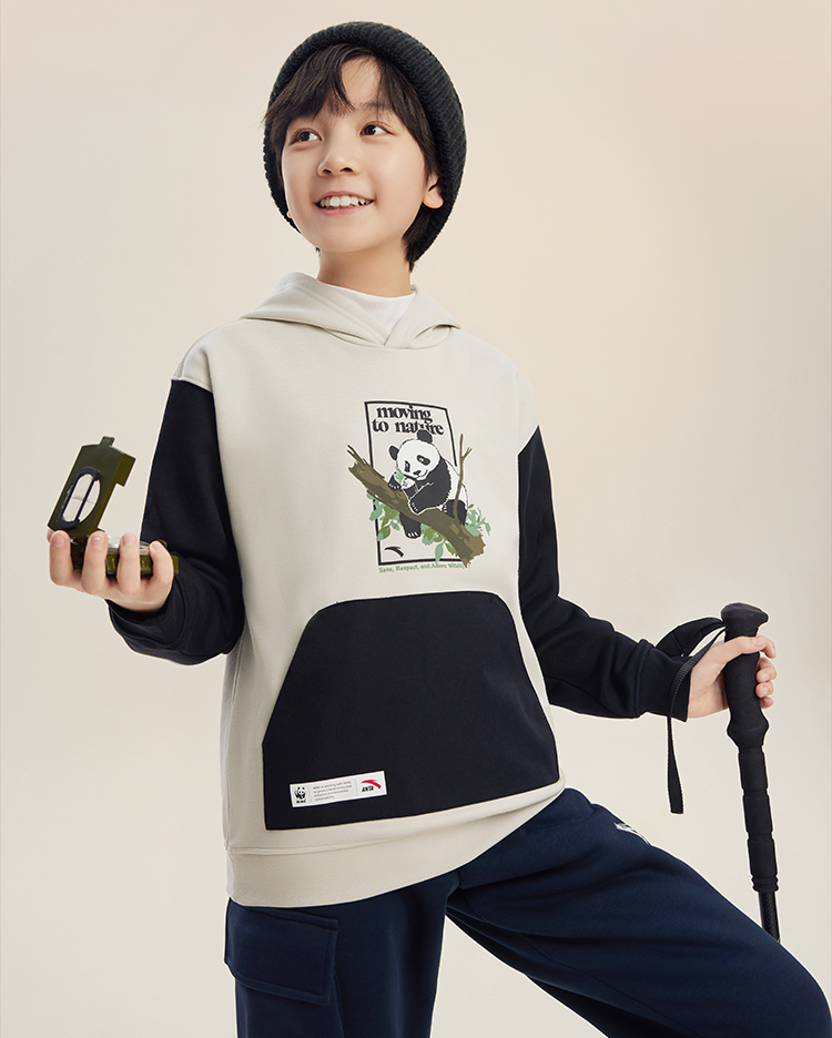 安踏儿童卫衣男大童连帽套头衫秋冬款加绒保暖熊猫印花休闲上衣352446712N