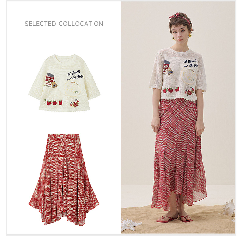 谜底印花T恤短袖2026夏新品趣味红格立体绣花复古活泼女262MT0605