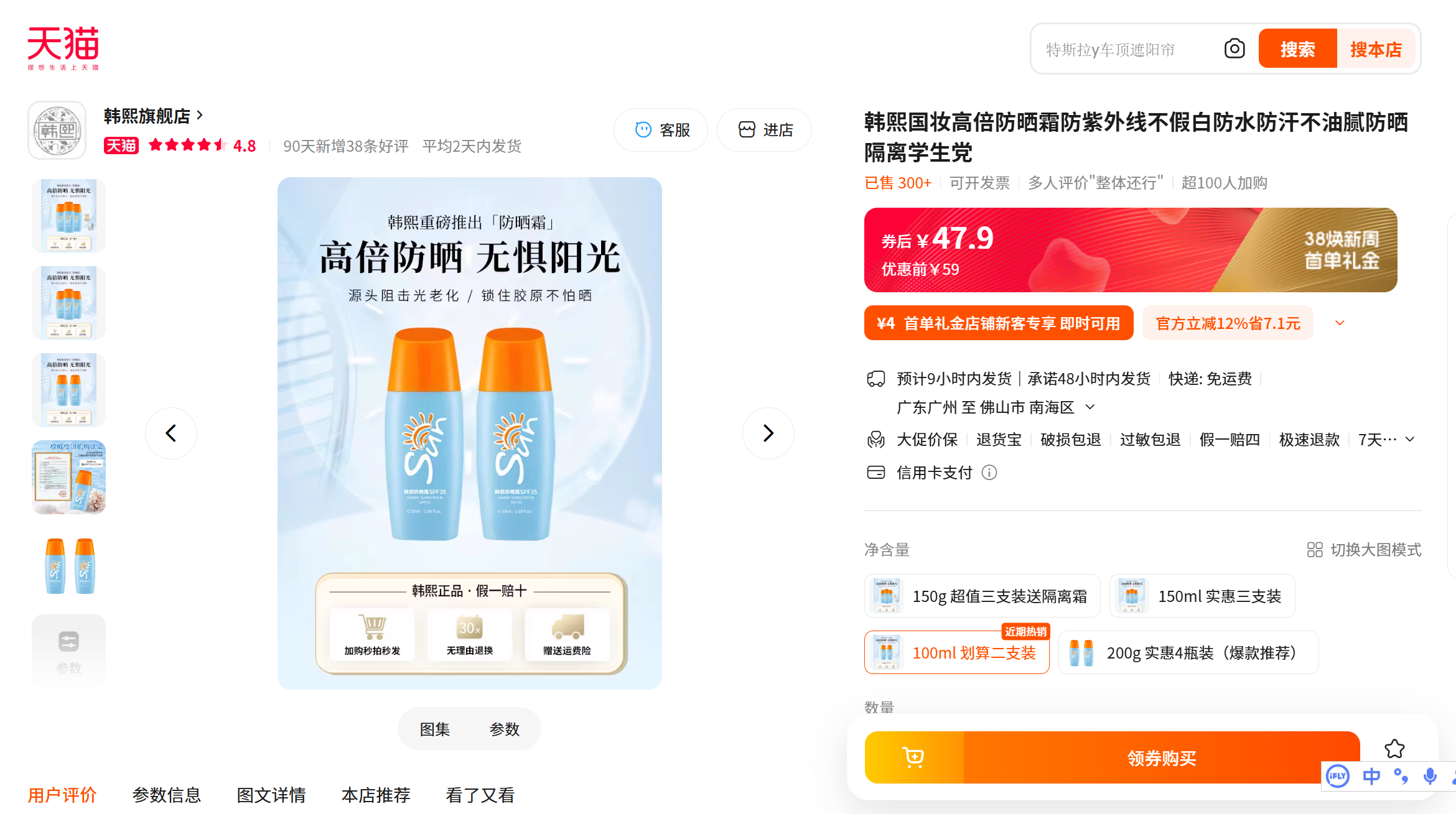 韩熙防嗮霜SPF35 不假白防水防汗不油腻防晒隔离 50ml*1瓶
