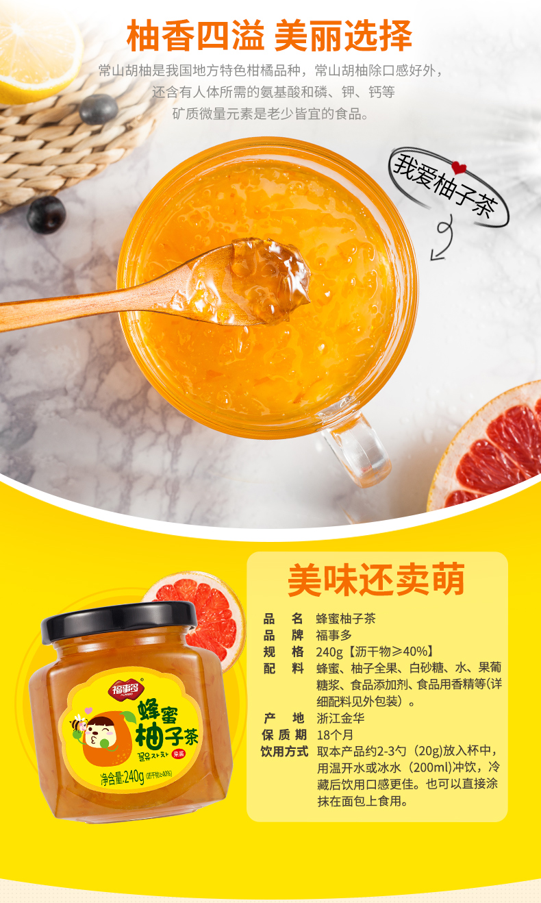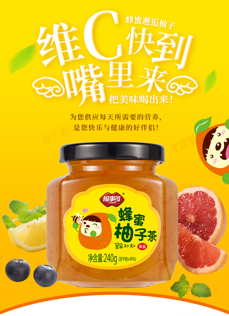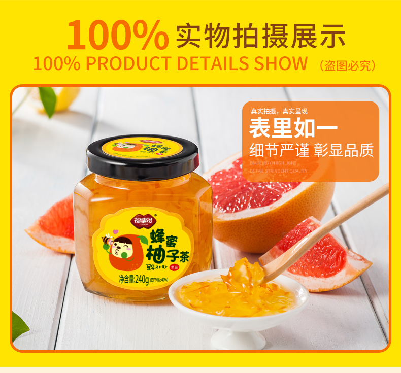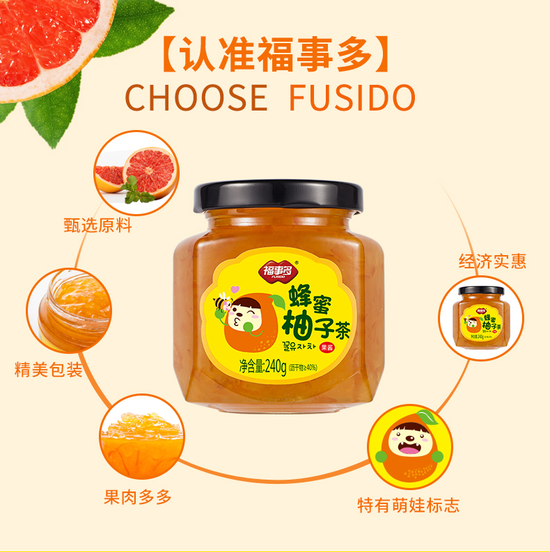 福事多蜂蜜柚子茶240g/瓶,办公室冲饮品,柚香怡人