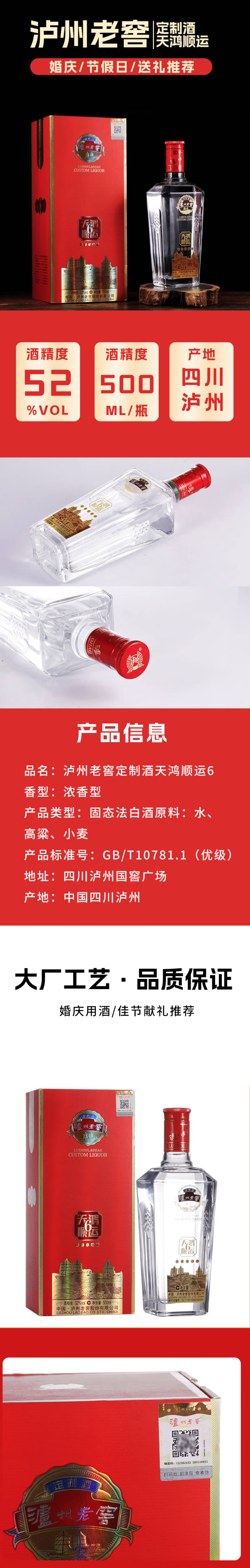 【嫡系好酒】2023年泸州老窖 天鸿顺运6 浓香型白酒 52度 500ml单瓶