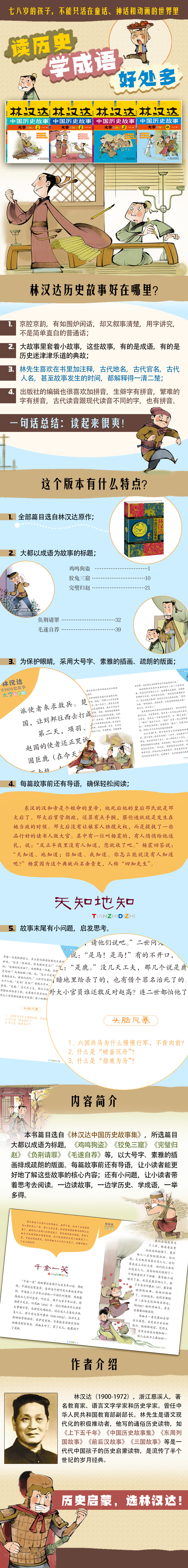 林汉达(1900-1972),浙江慈溪人,著名教育家、语言文字学家和历史学家。曾任中华人民共和国*副部长。林先生是语文现代化的积极推动者,他写的通俗历史读物,如《上下五千年》《中国历史故事集》《东周列国故事》《前后汉故事》《三国故事》等是一代代中国孩子的历史启蒙读物,是流传了半个世纪的岁月经典。