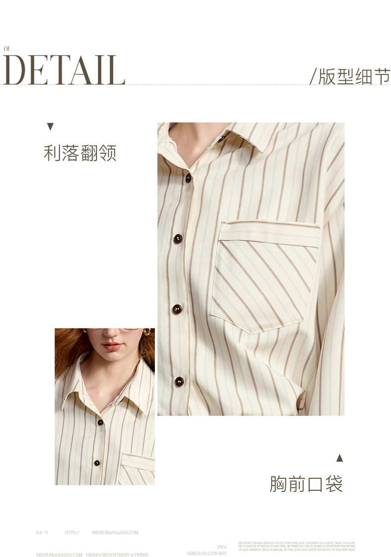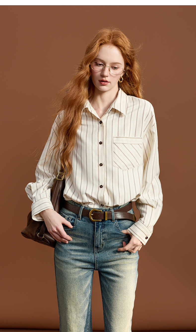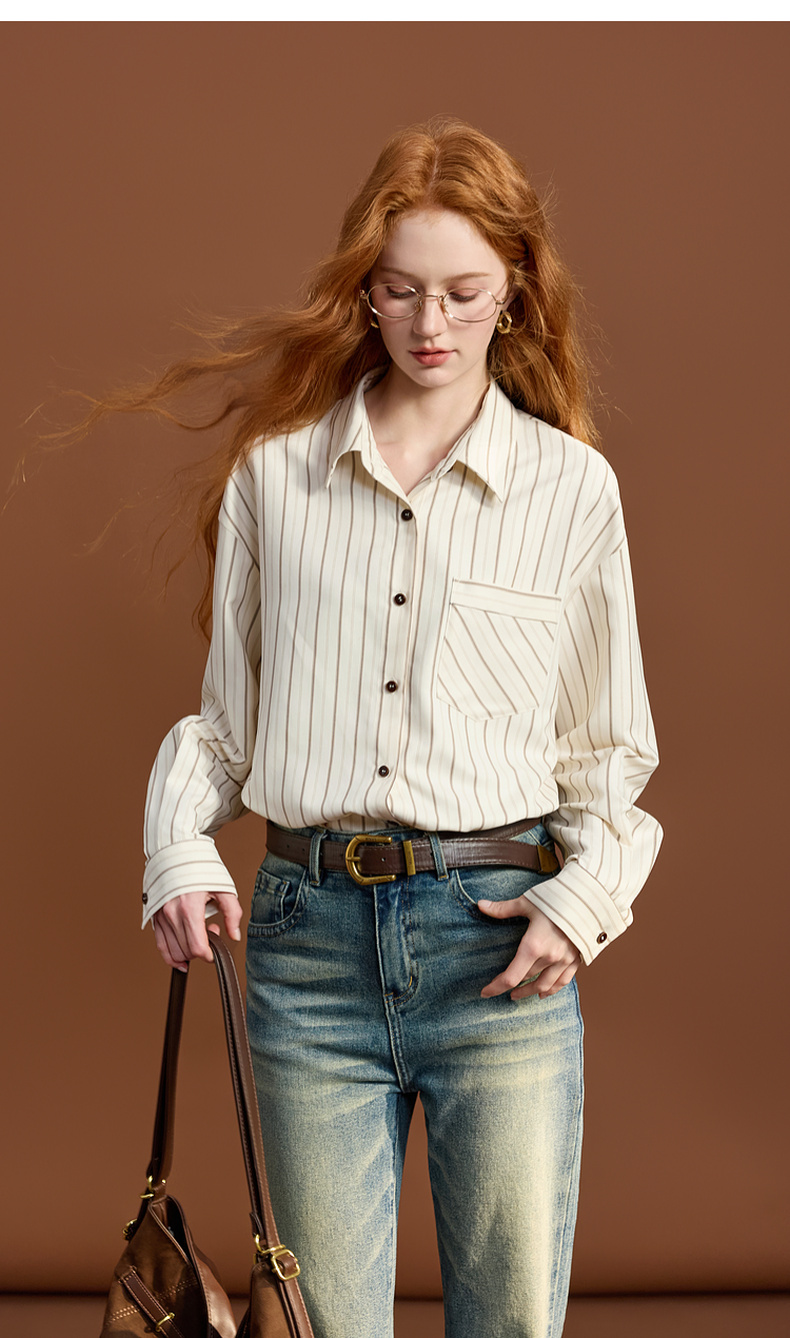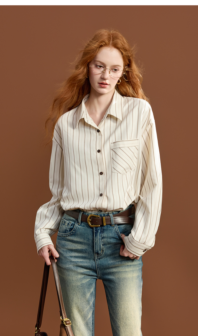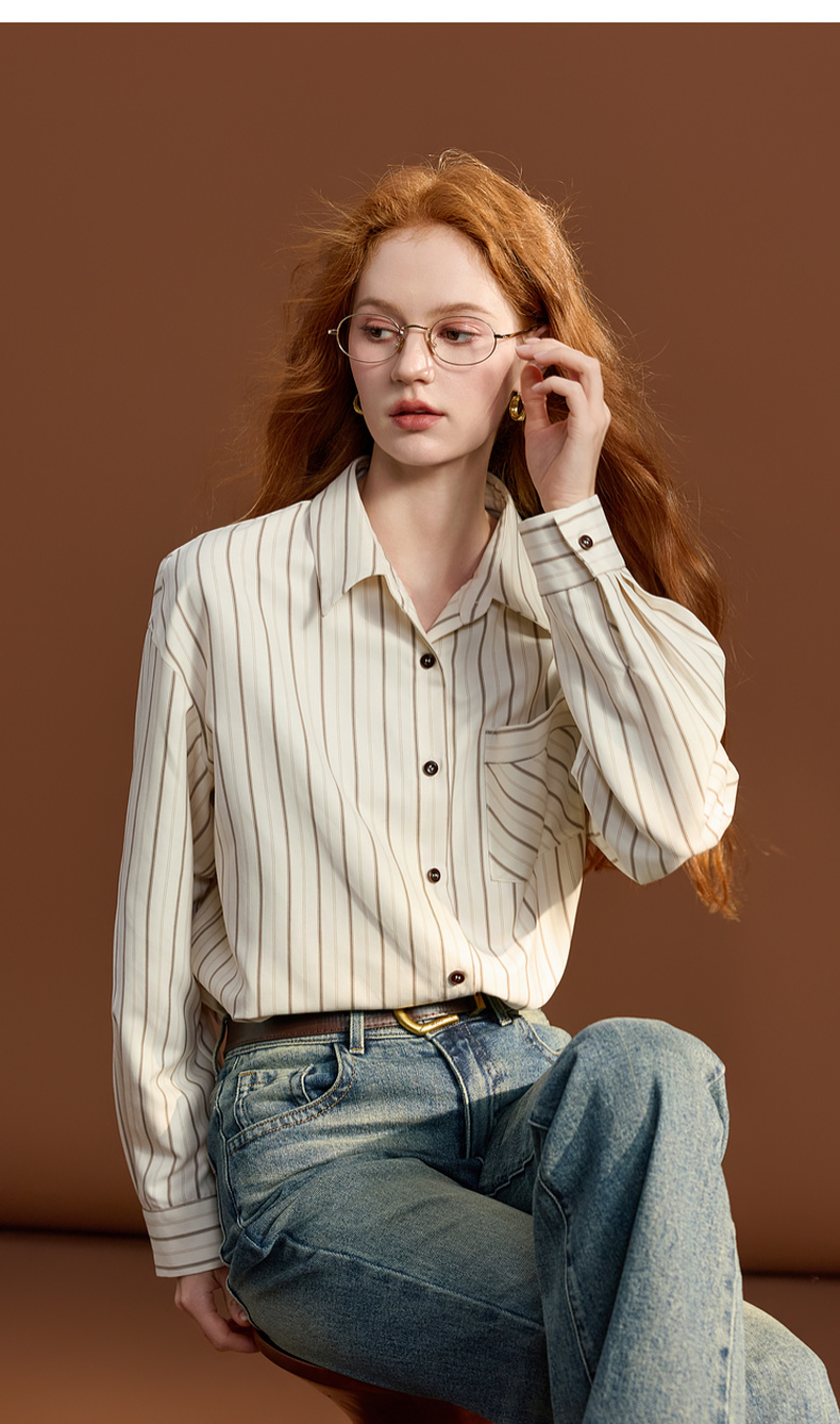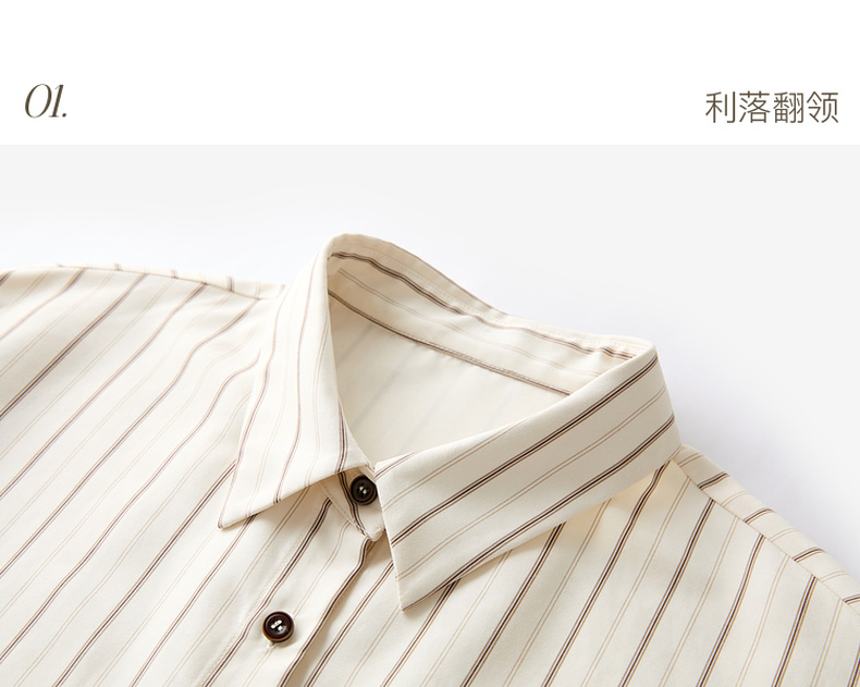 三彩2025冬季新款条纹衬衫翻领宽松衬衣休闲开衫简约M