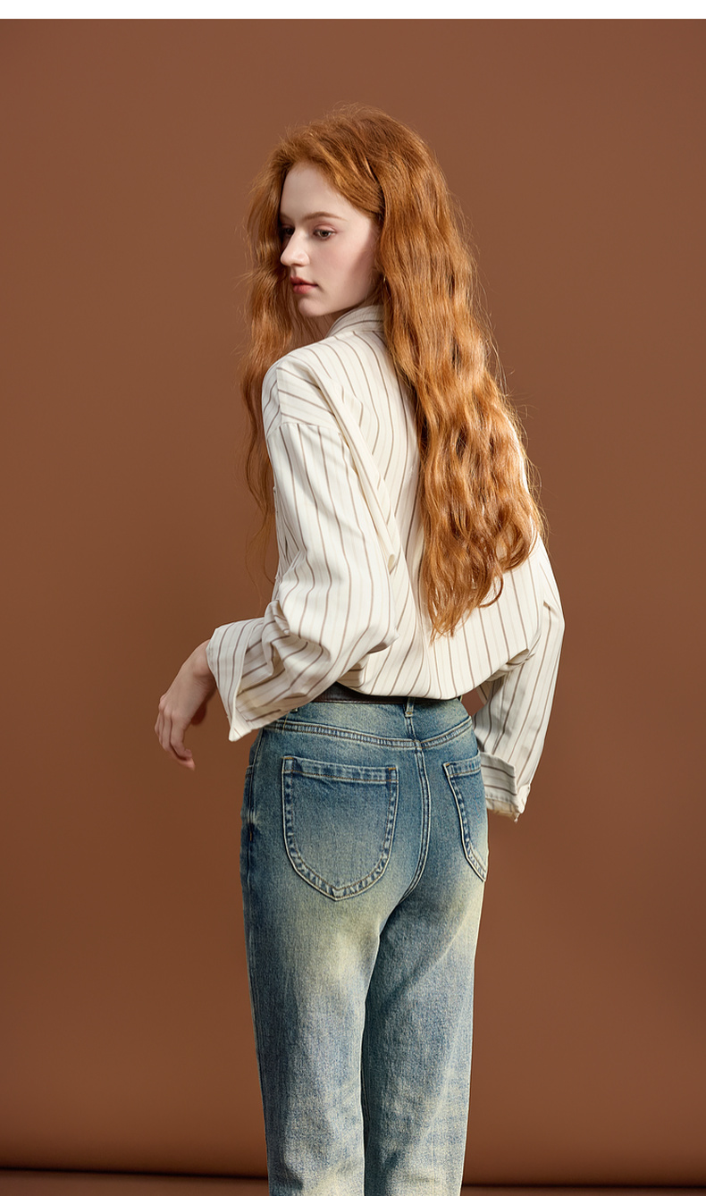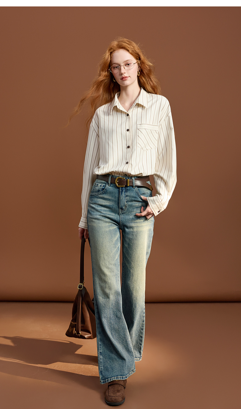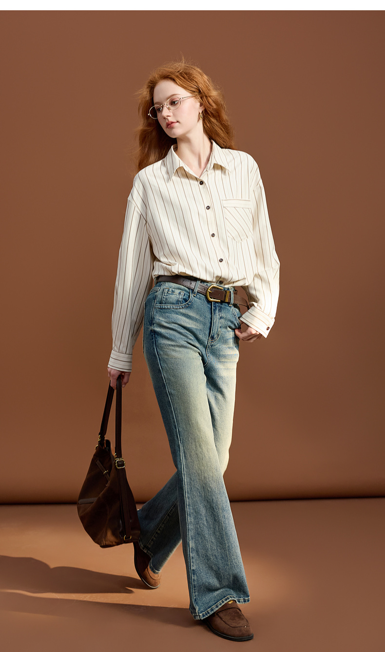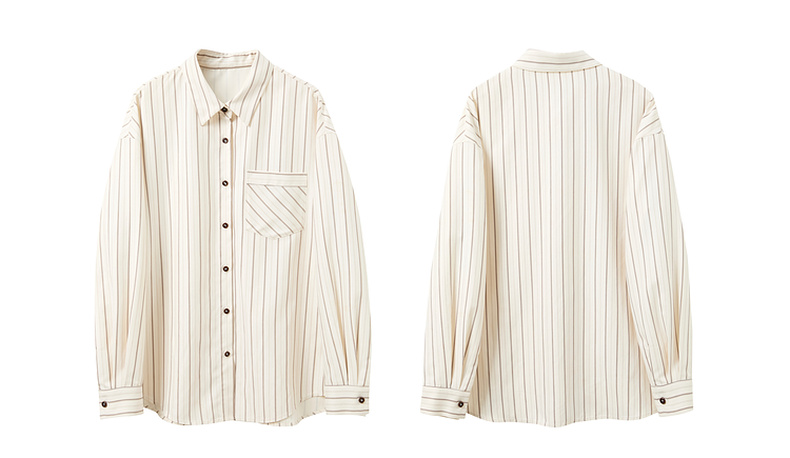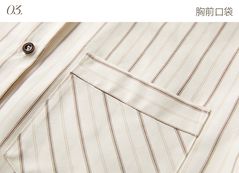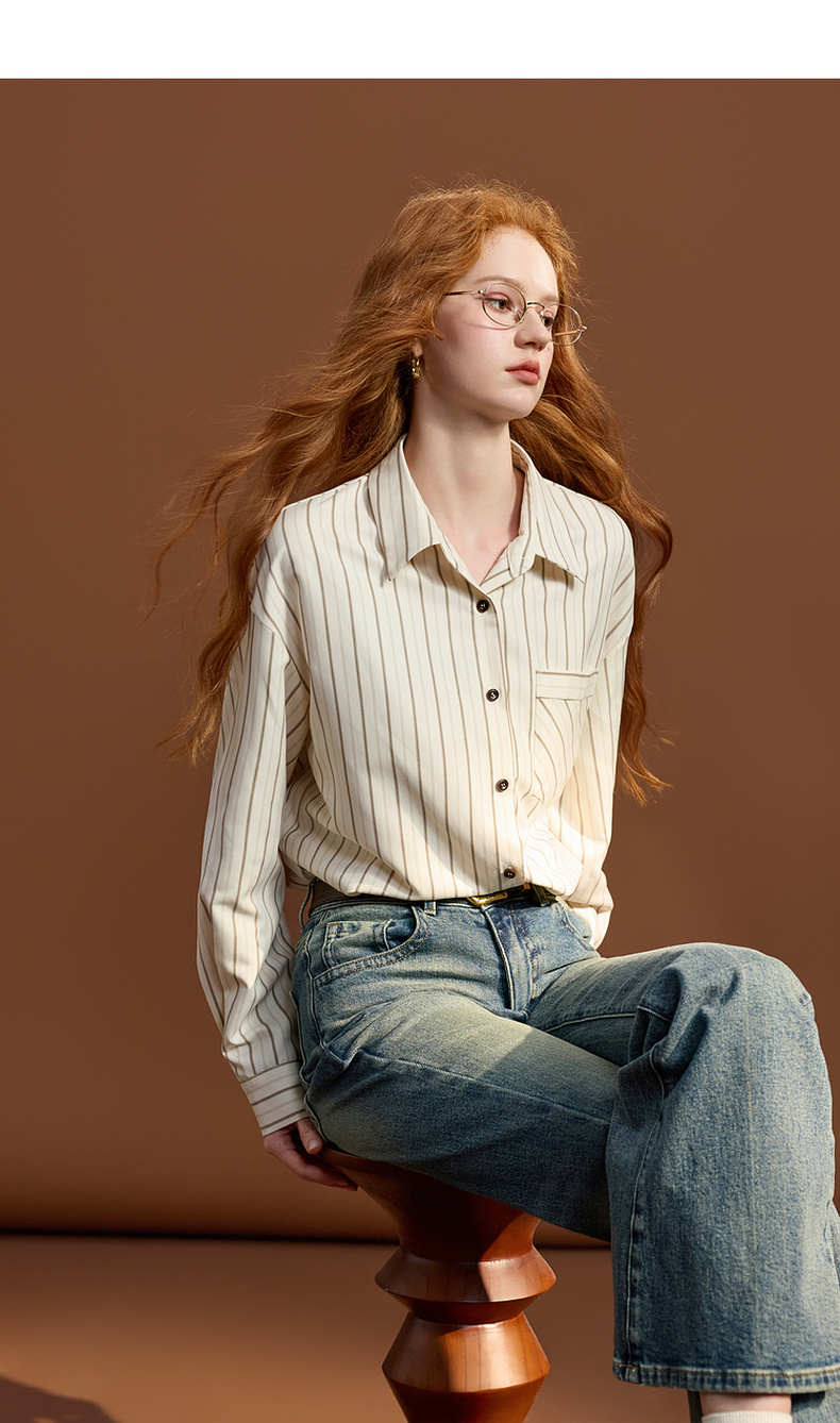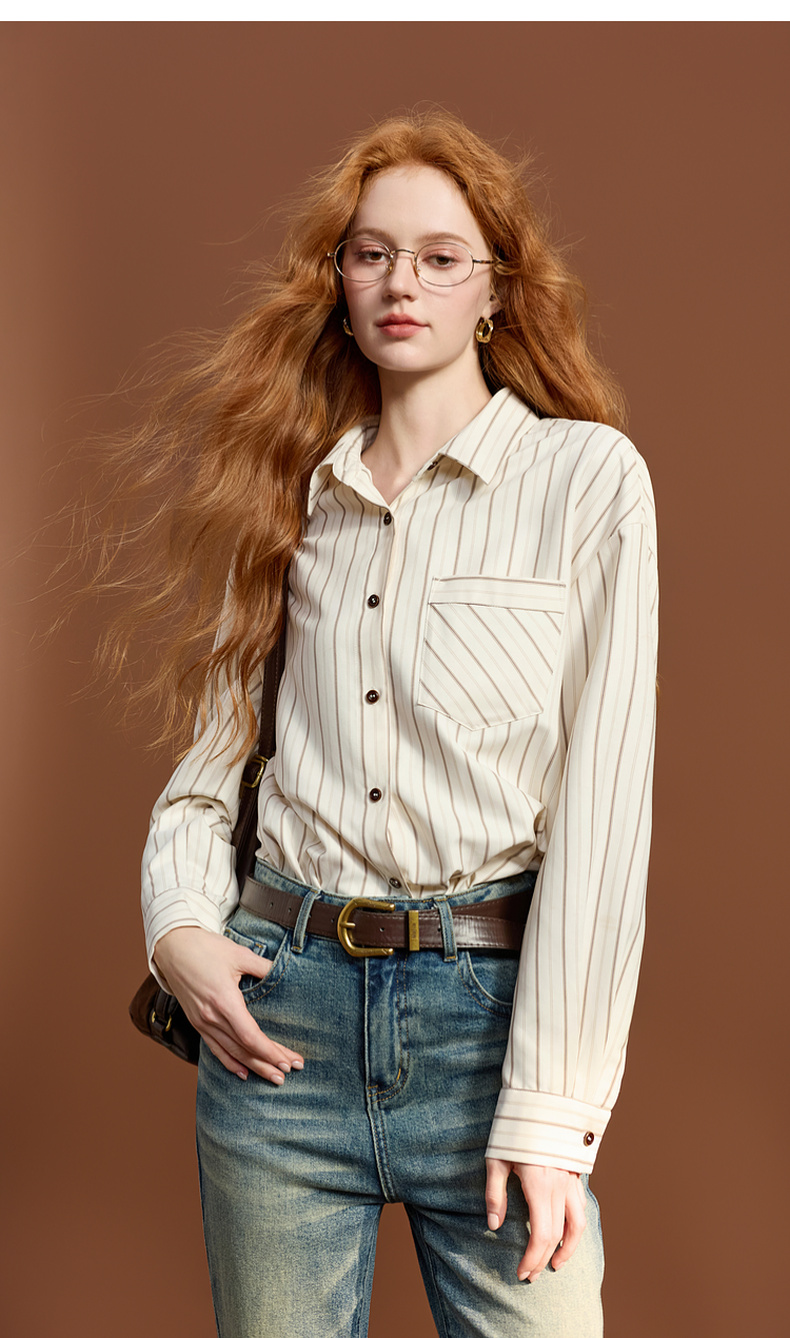 三彩2025冬季新款条纹衬衫翻领宽松衬衣休闲开衫简约M