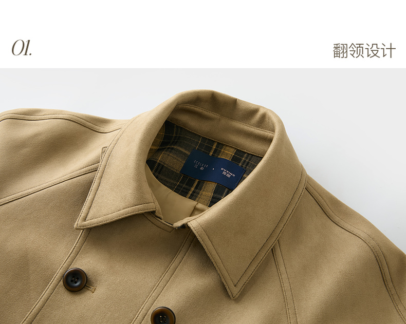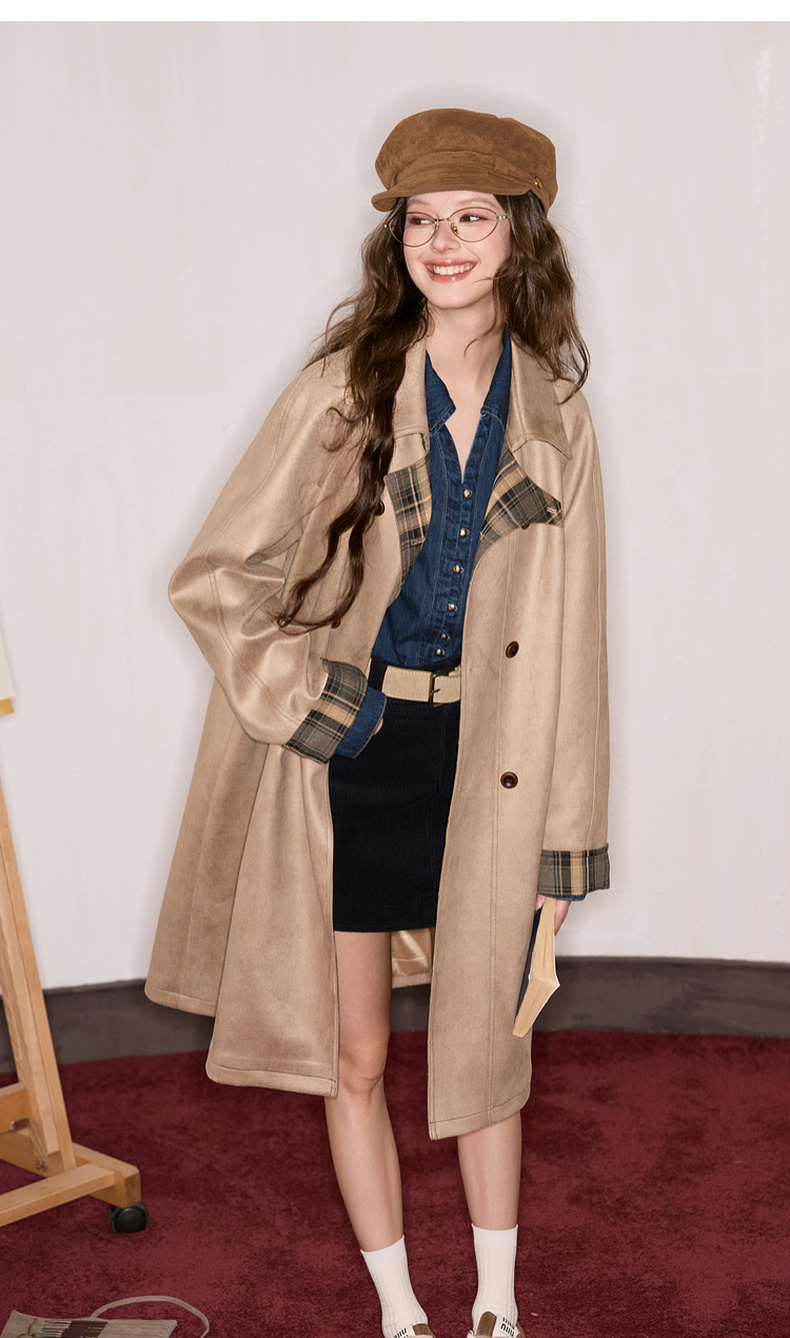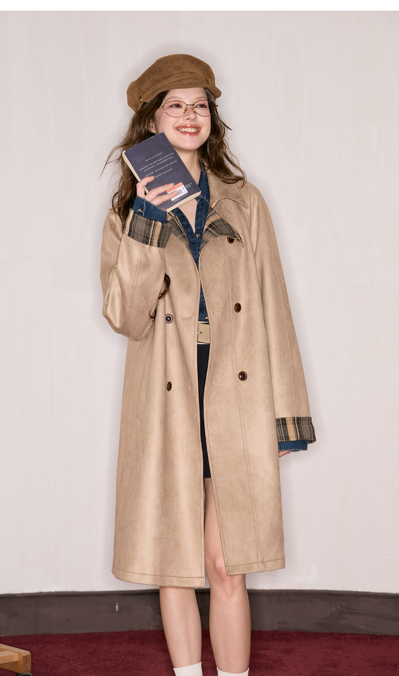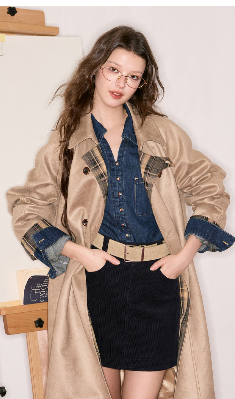 三彩独醒2025秋季新款翻领长款双排扣风衣外套宽松休闲复古F