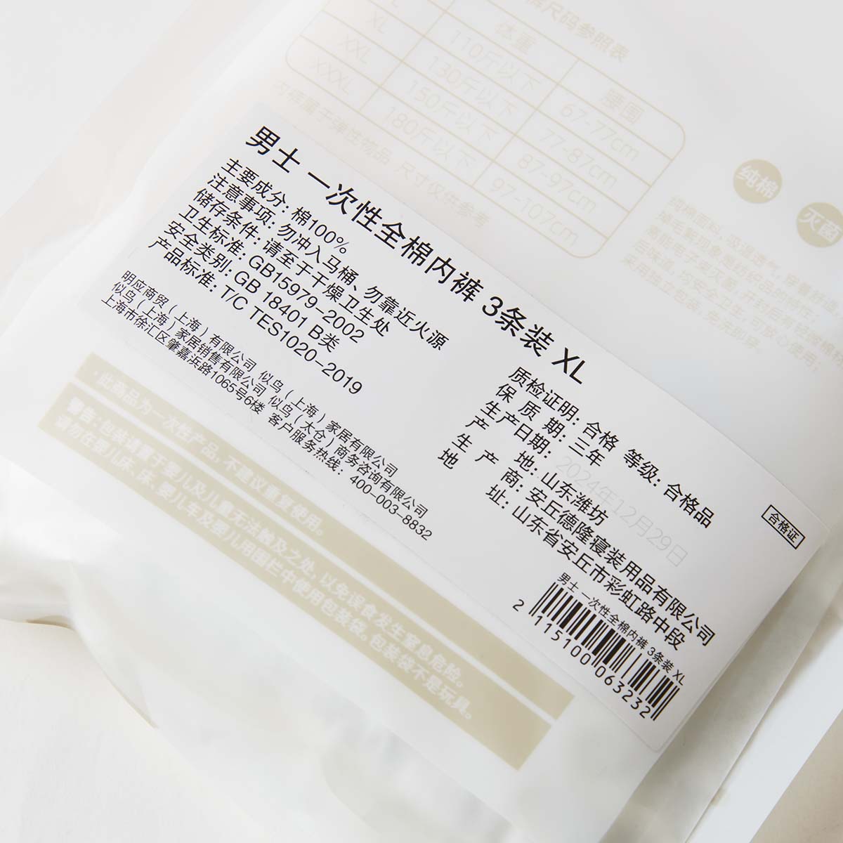男士 一次性全棉内裤 3条装