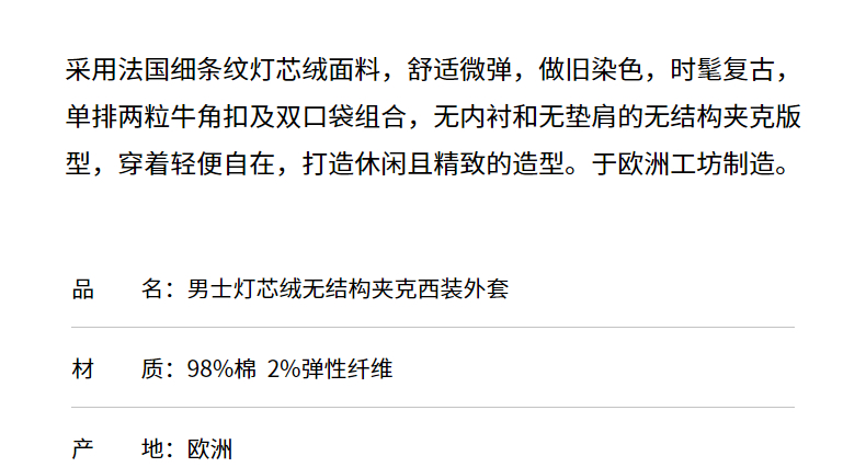 SUNSPEL秋冬男士灯芯绒无内衬西装夹克外套