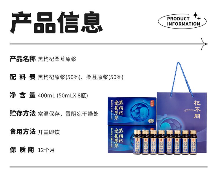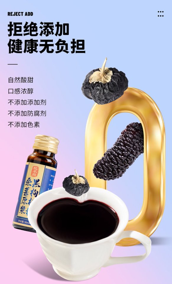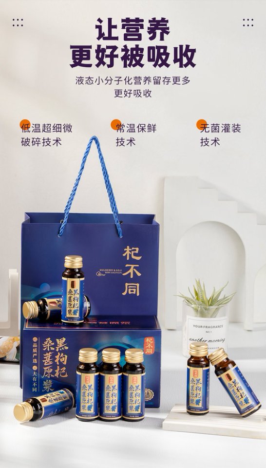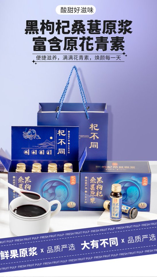 宁夏枸杞桑葚原浆主要由宁夏枸杞和桑葚制成,是一种结合了宁夏枸杞和桑葚精华的健康饮品,它不仅保留了原材料的丰富营养,还具有便捷的食用方式和广泛的适用人群。口感酸甜,且有很多的营养对身体发财友好