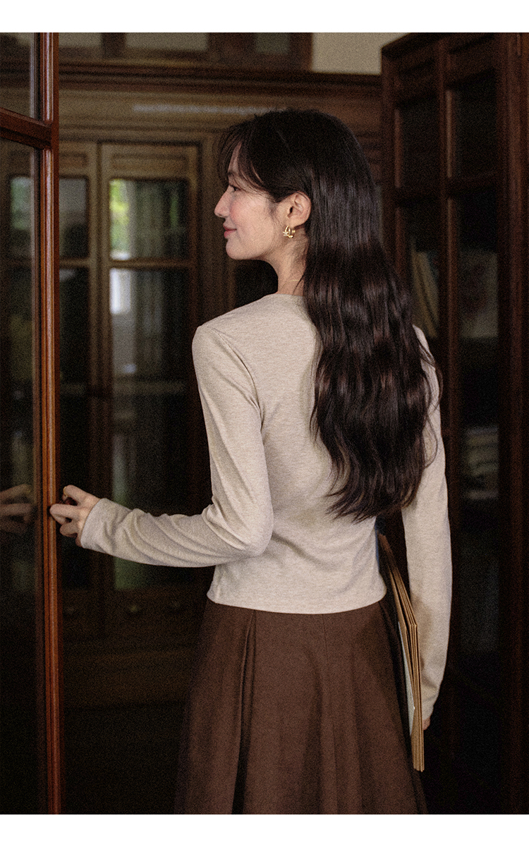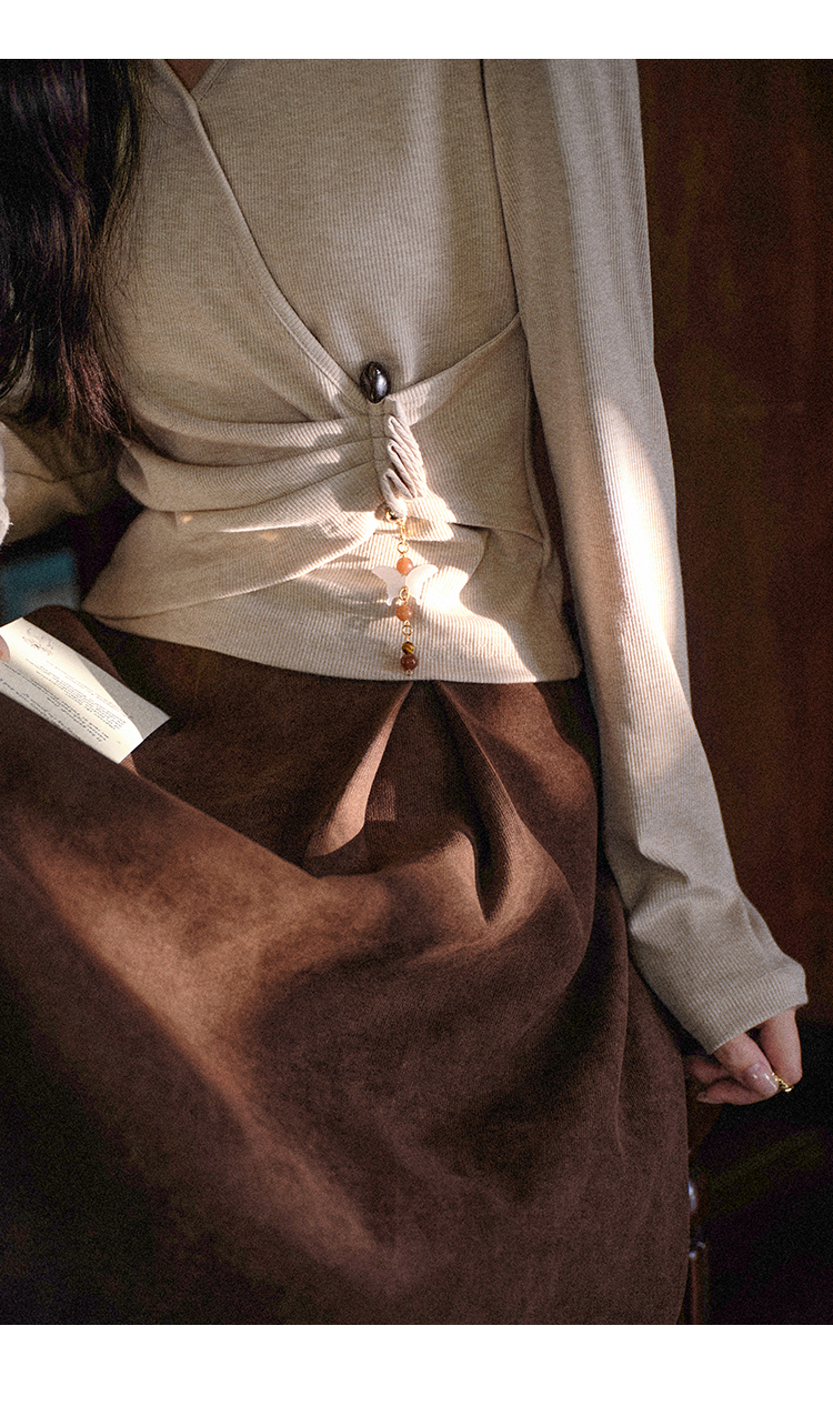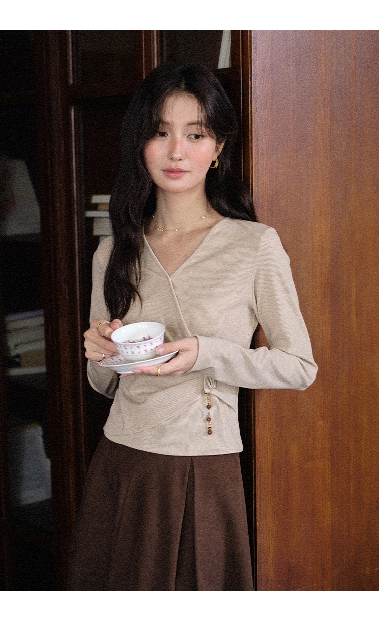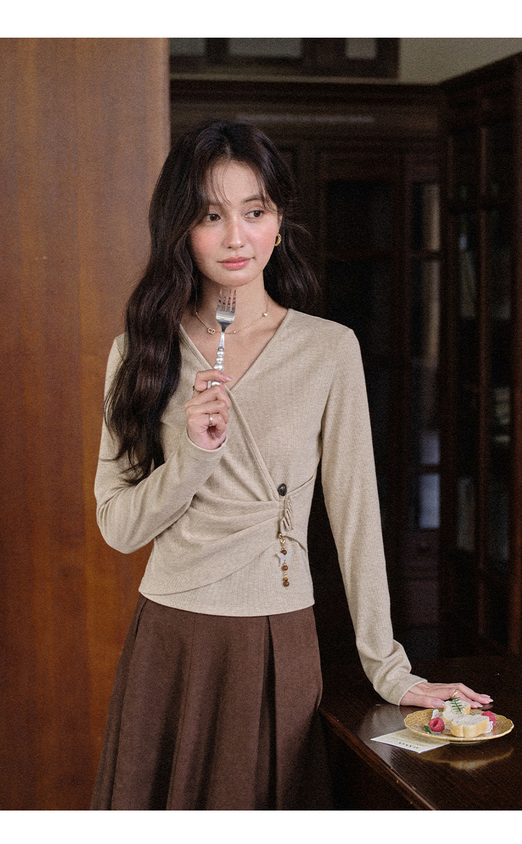 鹿向南「曲鸢流星」燕麦色显瘦V领针织衫女早秋新款设计感长袖T恤