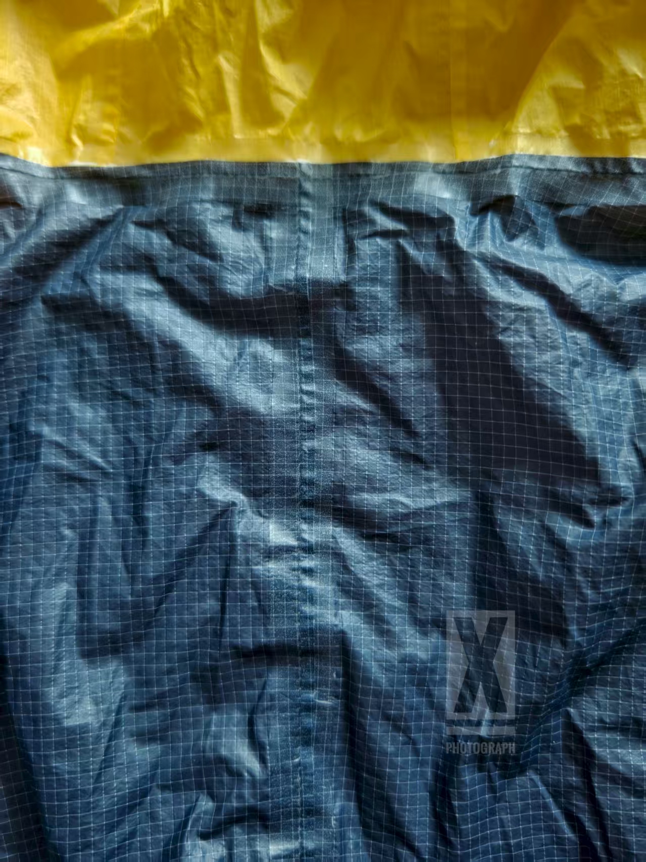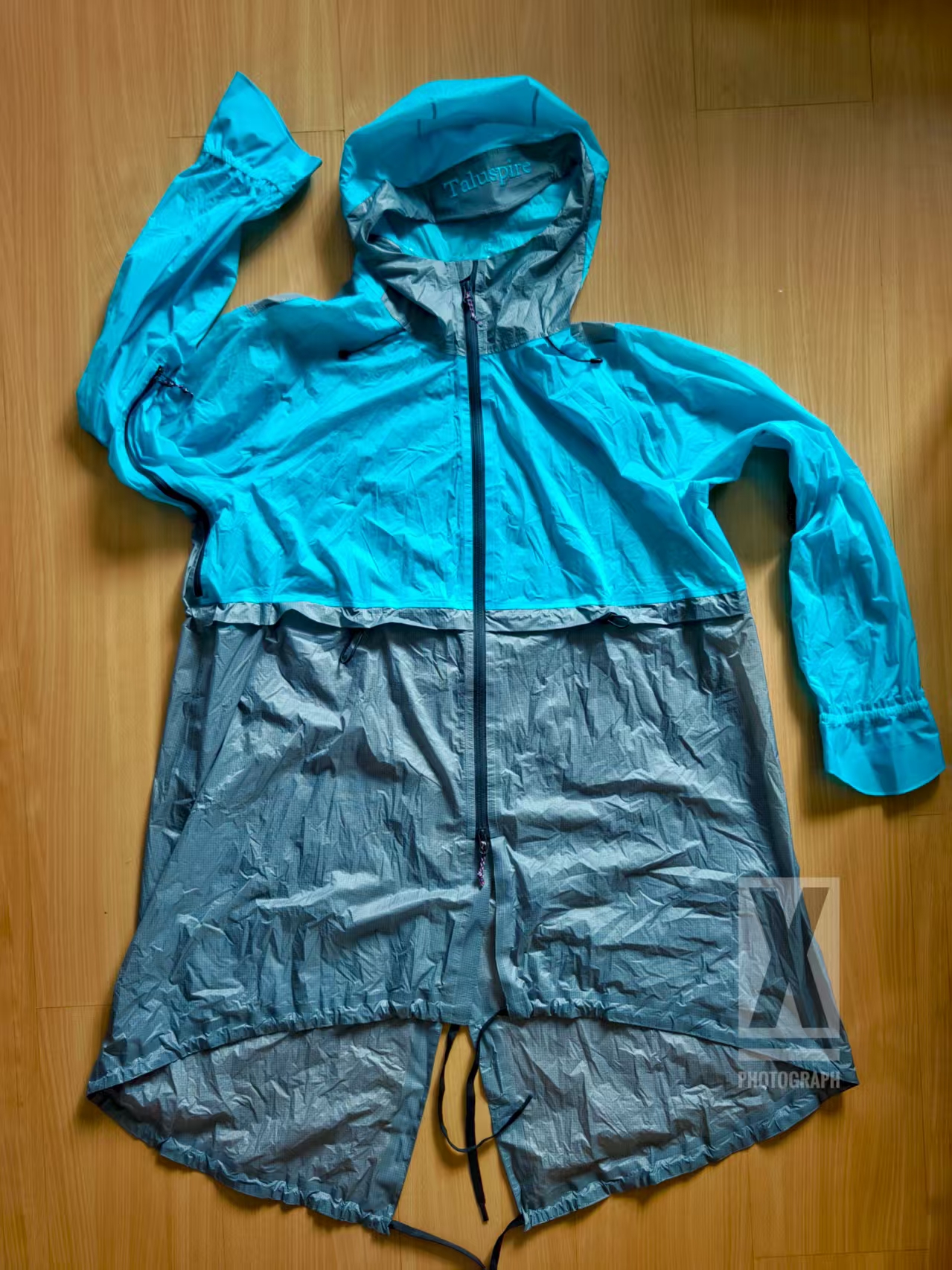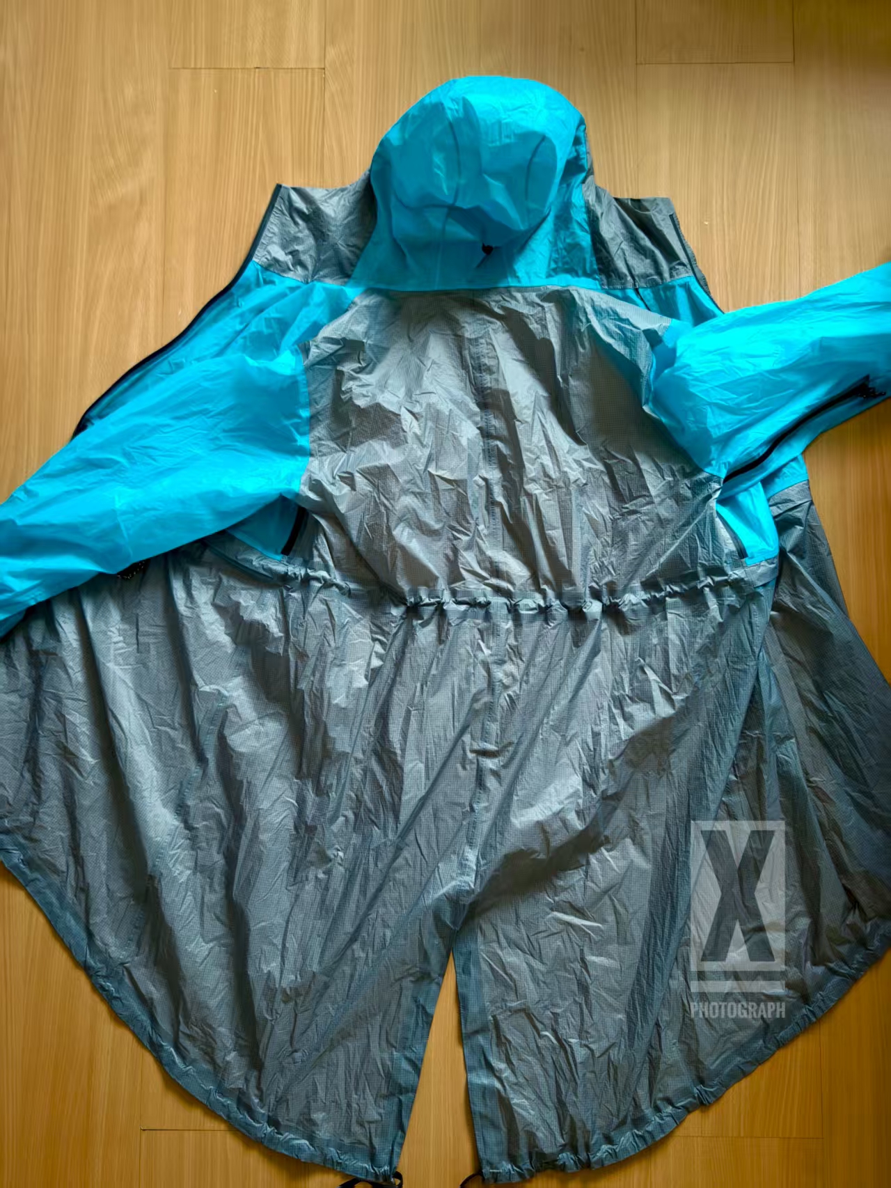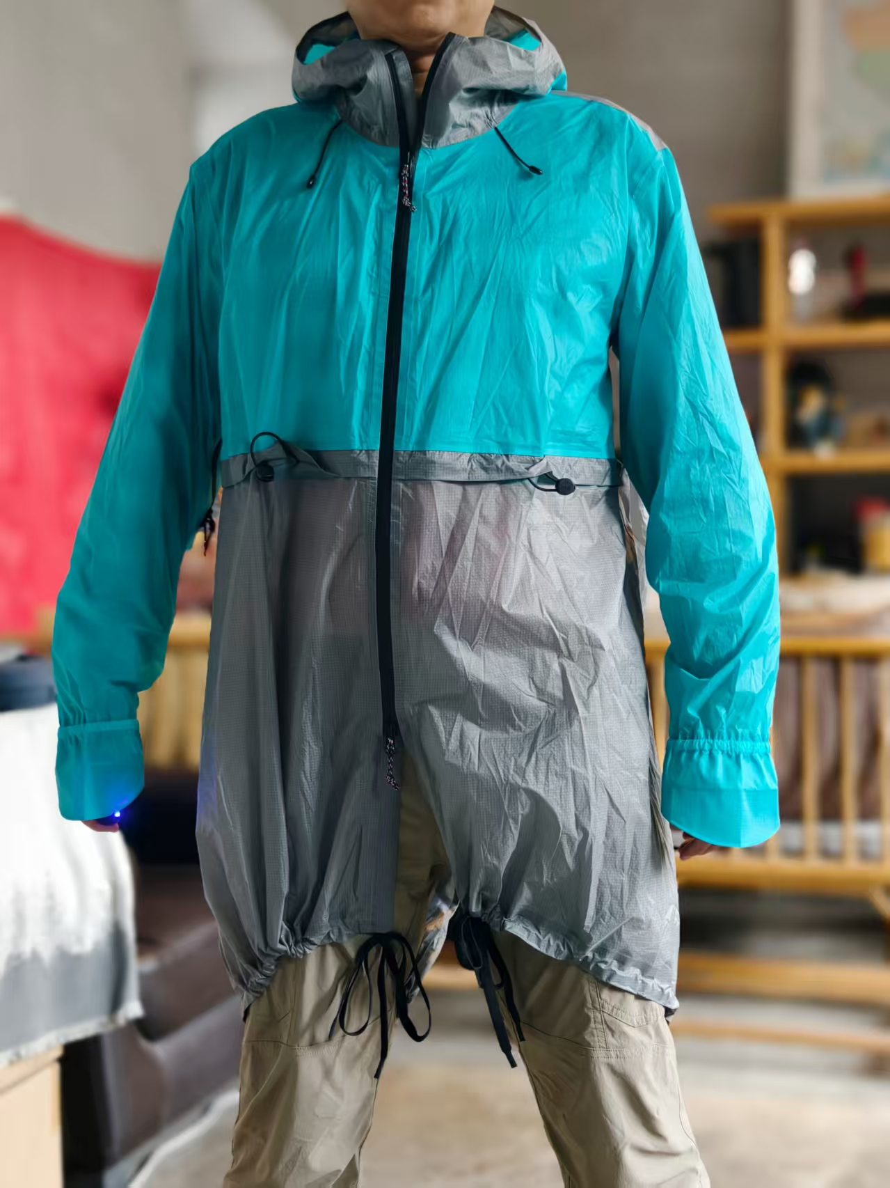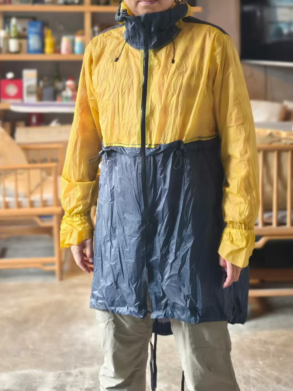 为啥背部没有设计可容纳背包的结构:我认为不需要。背包有防雨罩,背包内物品会用防水袋分别装好;即便有容得下背包的结构,背包闷在雨衣里该湿的地方和淋雨一样还是会湿。而且徒步中要用包里物品,可以随时随地卸下背包拿取就行,不必脱了雨衣再卸包,拿完东西背上包再把雨衣穿上,拿取物品时避免淋雨。