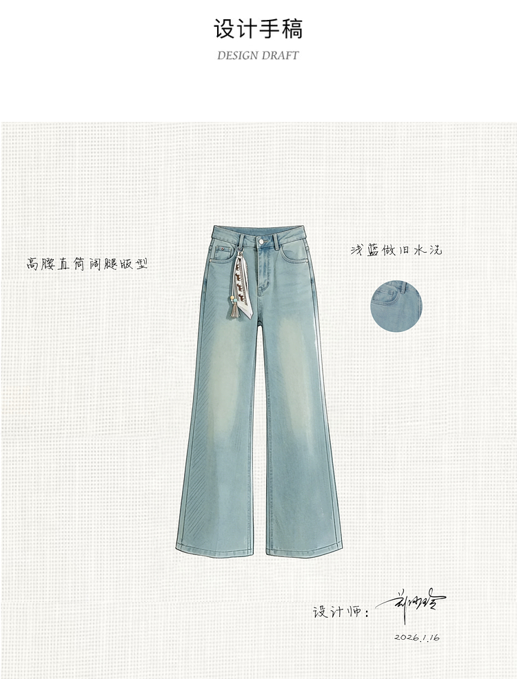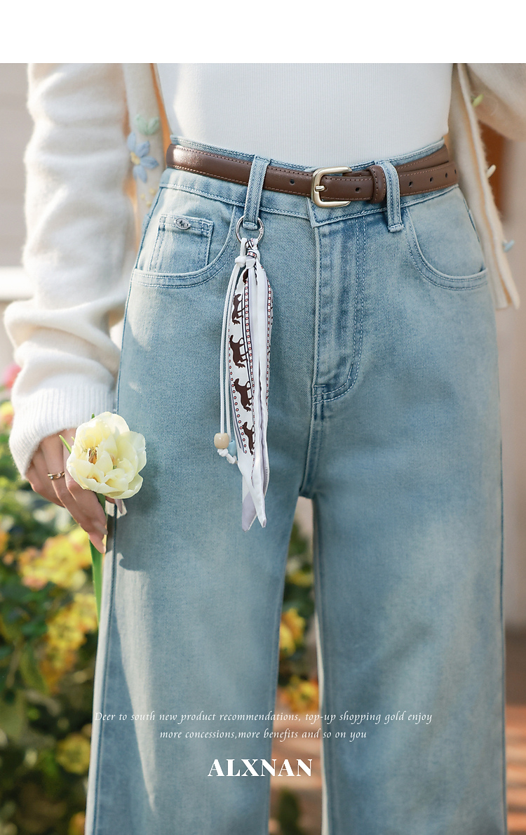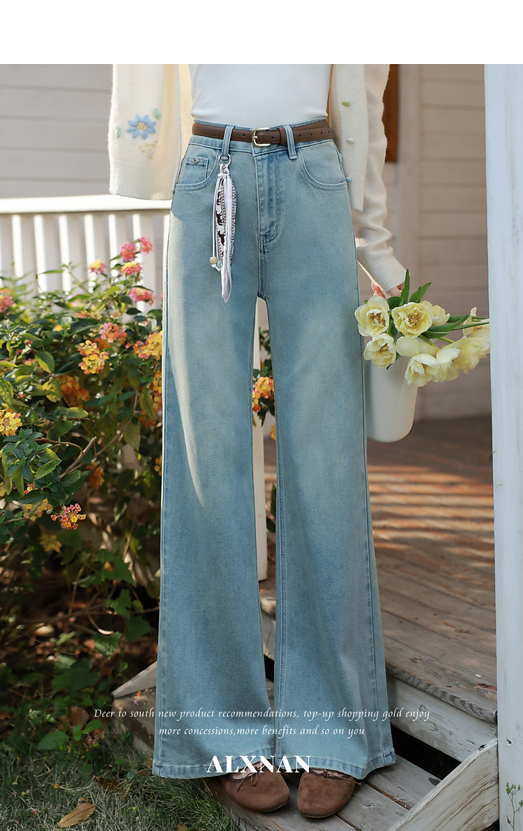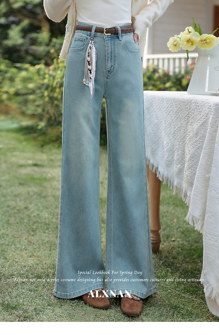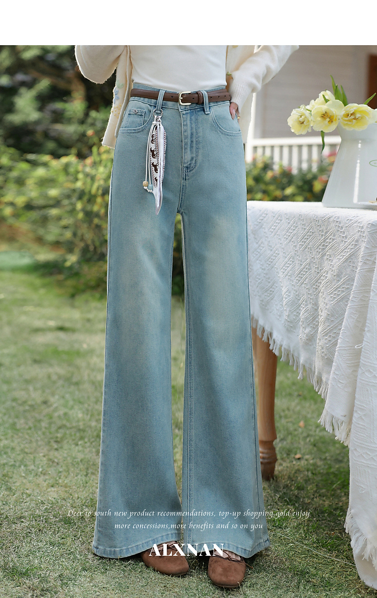 鹿向南「丹宁艺术家」洋气蓝色牛仔裤女春夏新款宽松微喇长款裤子