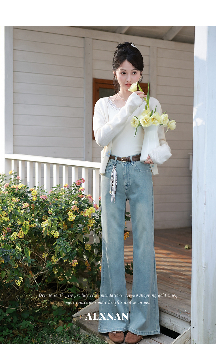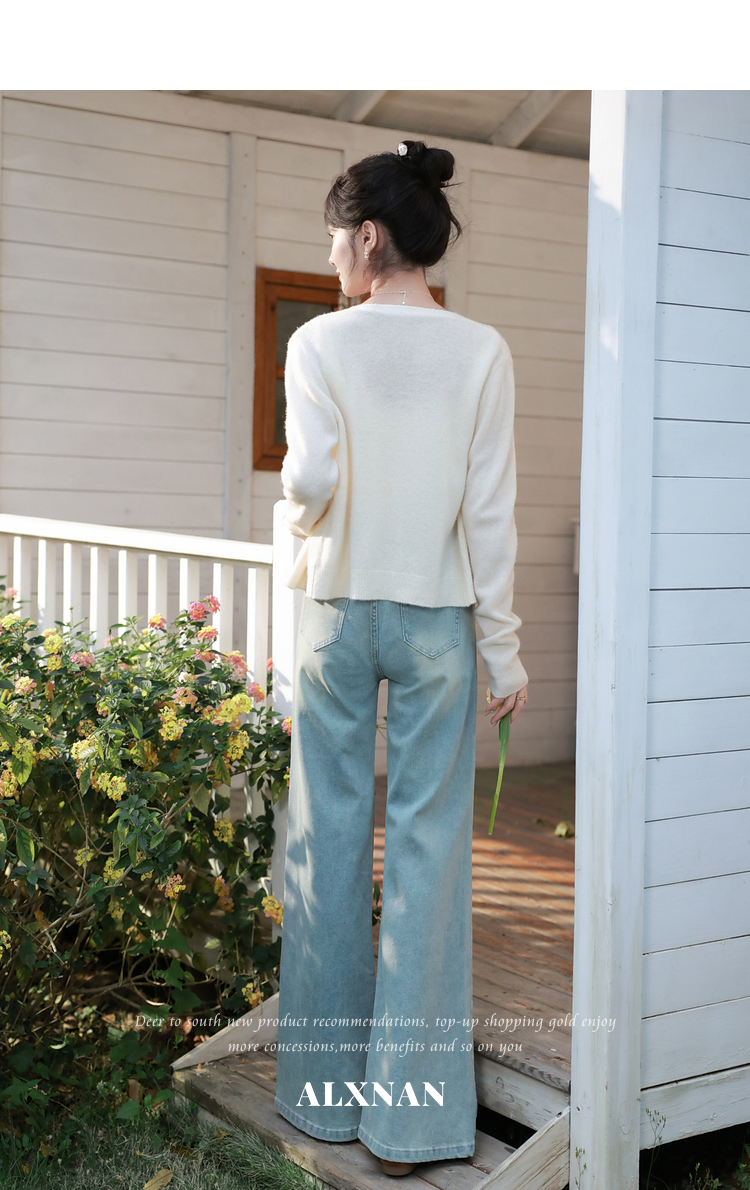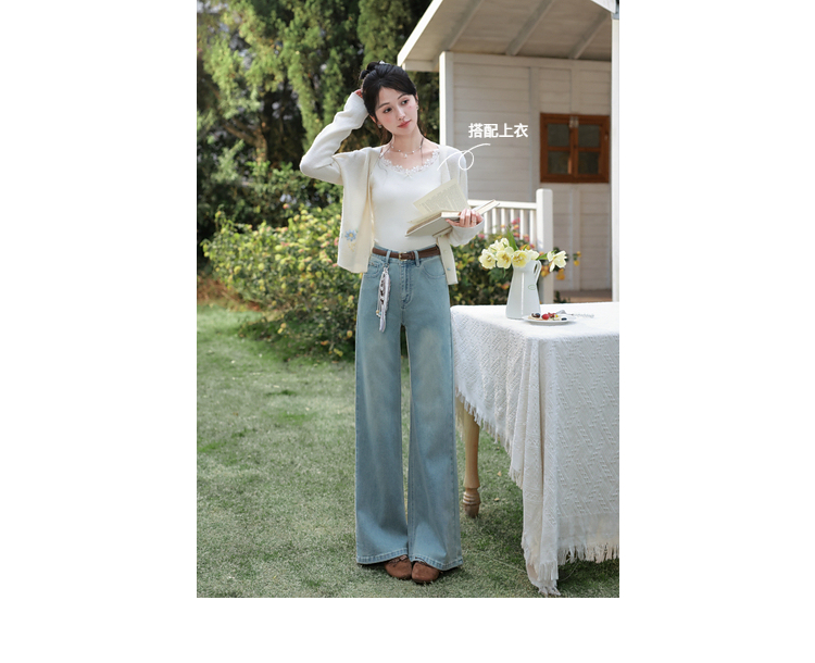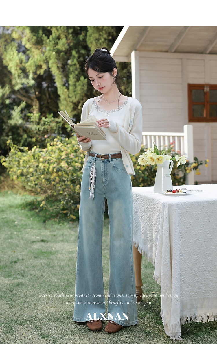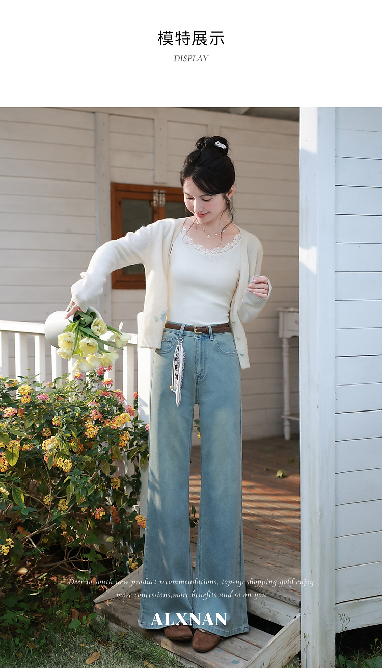 鹿向南「丹宁艺术家」洋气蓝色牛仔裤女春夏新款宽松微喇长款裤子