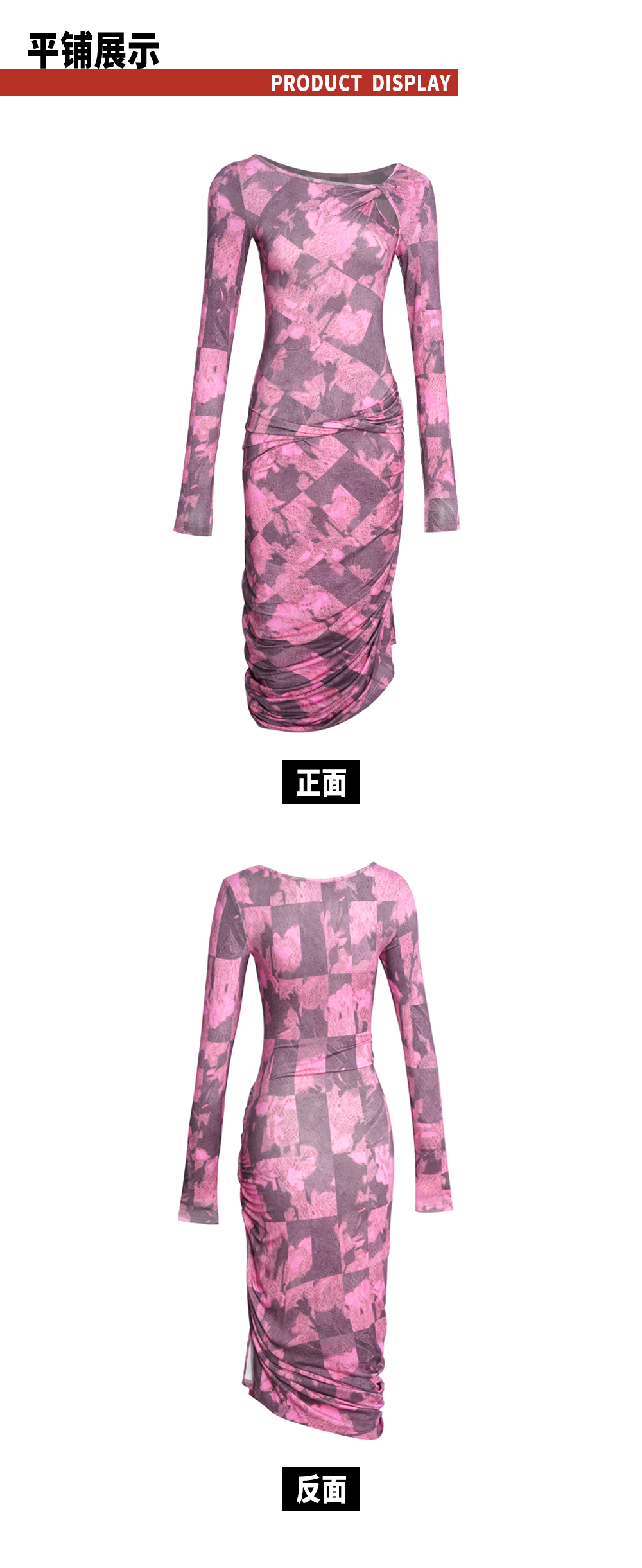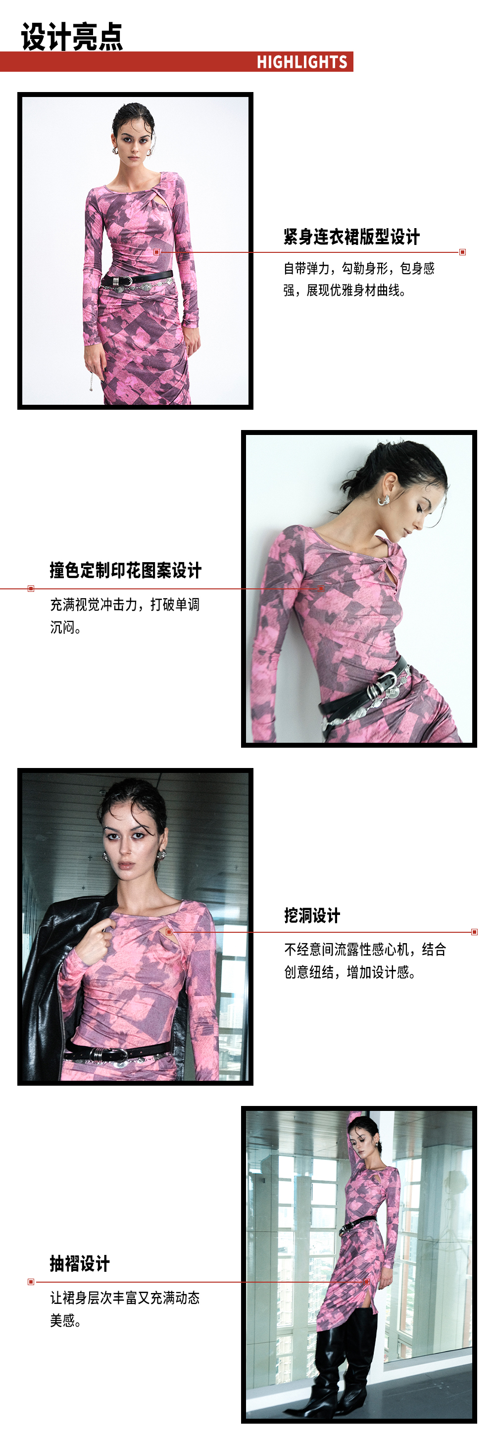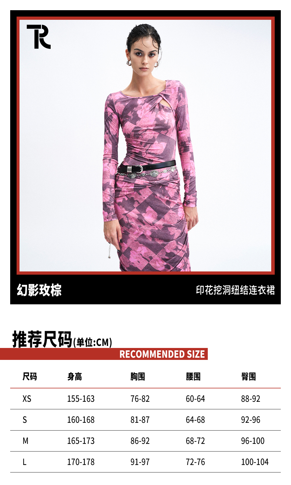TR她热 幻影玫踪 玫红色印花弹力镂空纽结性感开衩包臀连衣裙