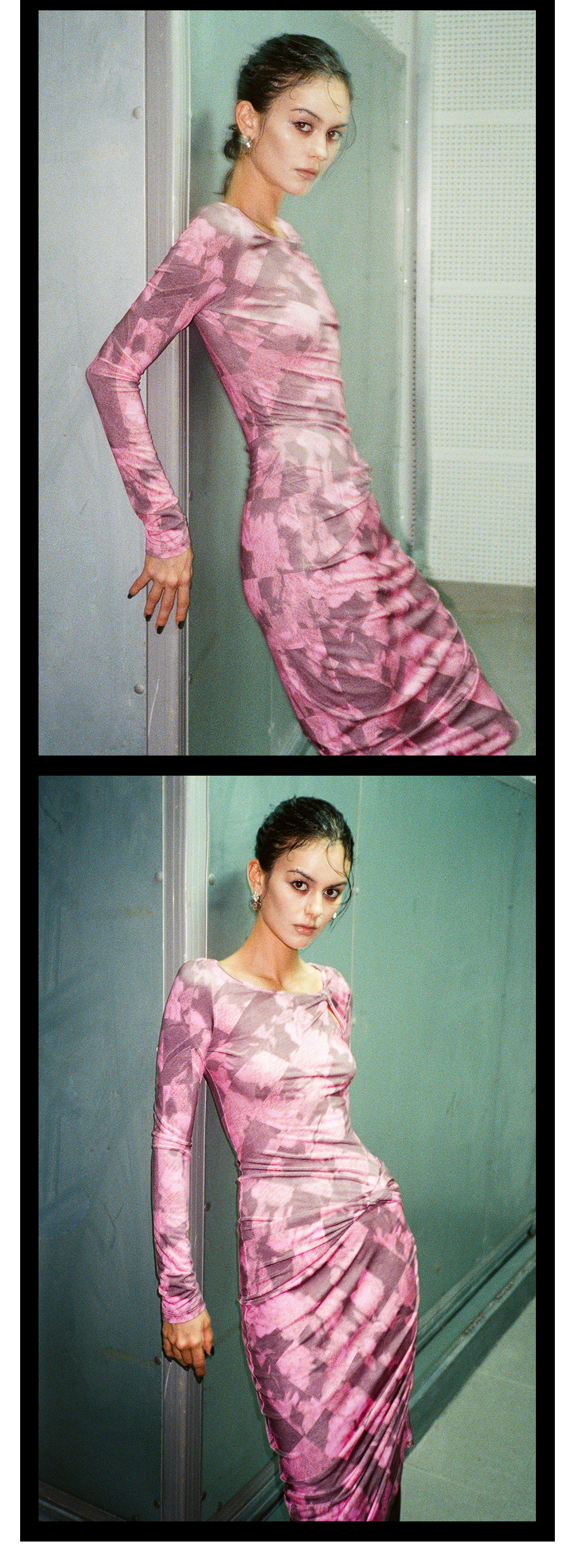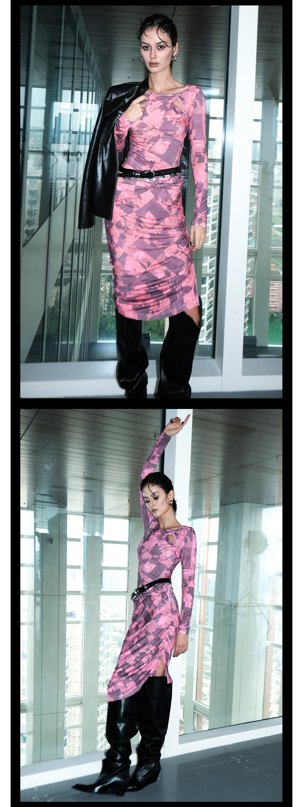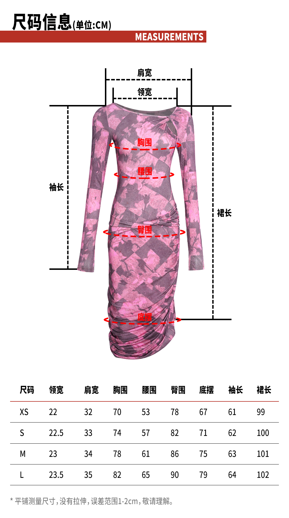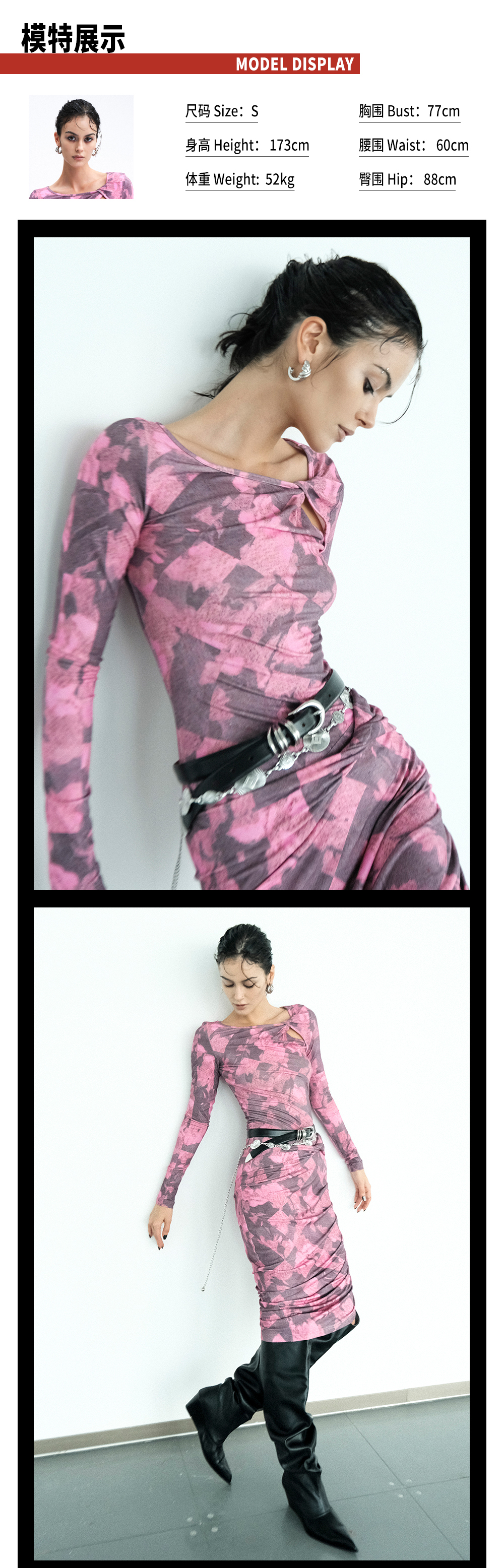 TR她热 幻影玫踪 玫红色印花弹力镂空纽结性感开衩包臀连衣裙