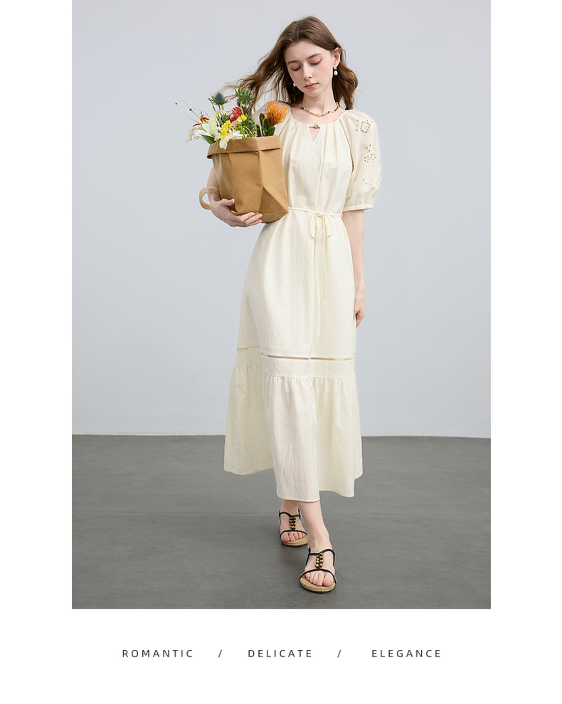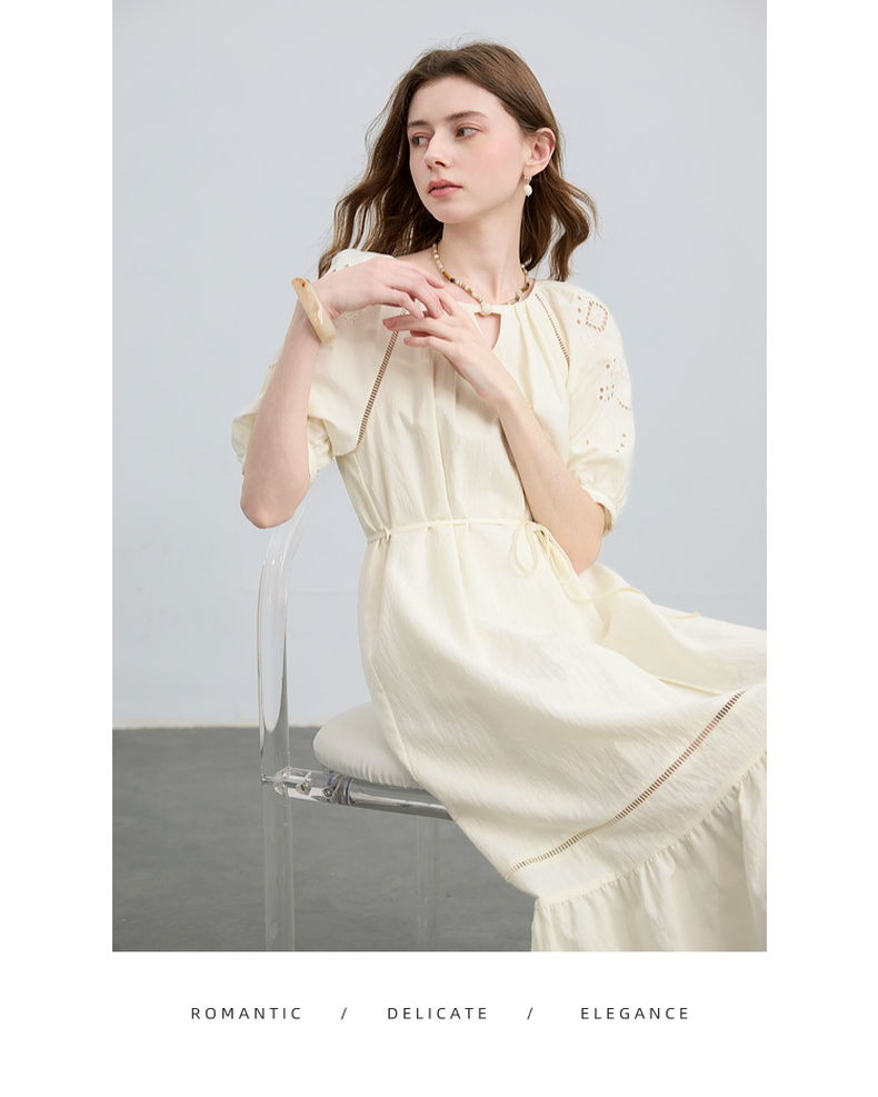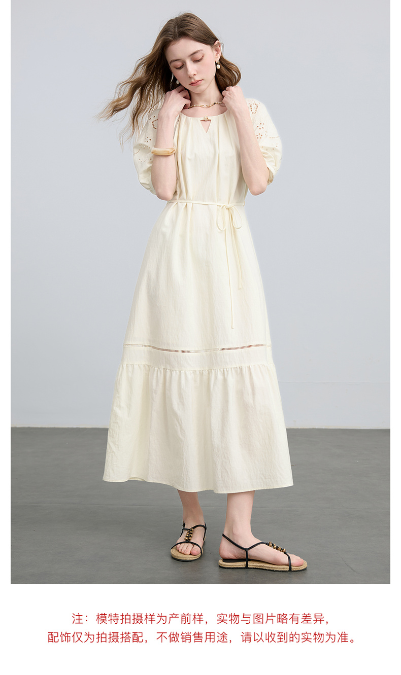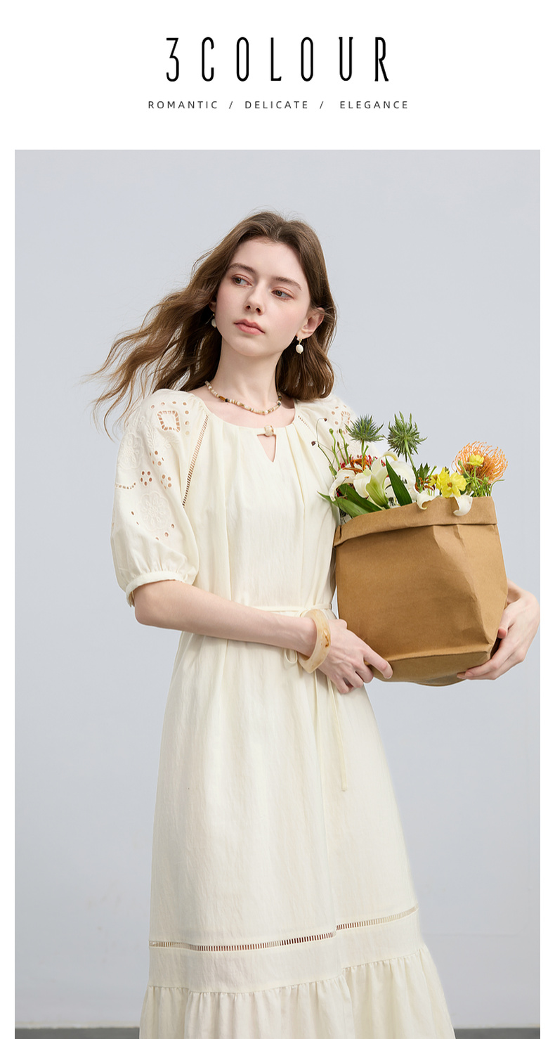三彩2025夏季新款镂空刺绣连衣裙圆领灯笼袖A字裙宽松长裙M