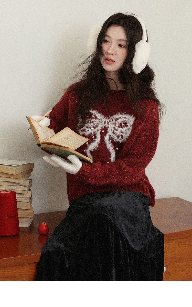 鹿向南「圣诞前奏」红色圣诞蝴蝶结毛衣女秋冬慵懒风长袖圆领上衣