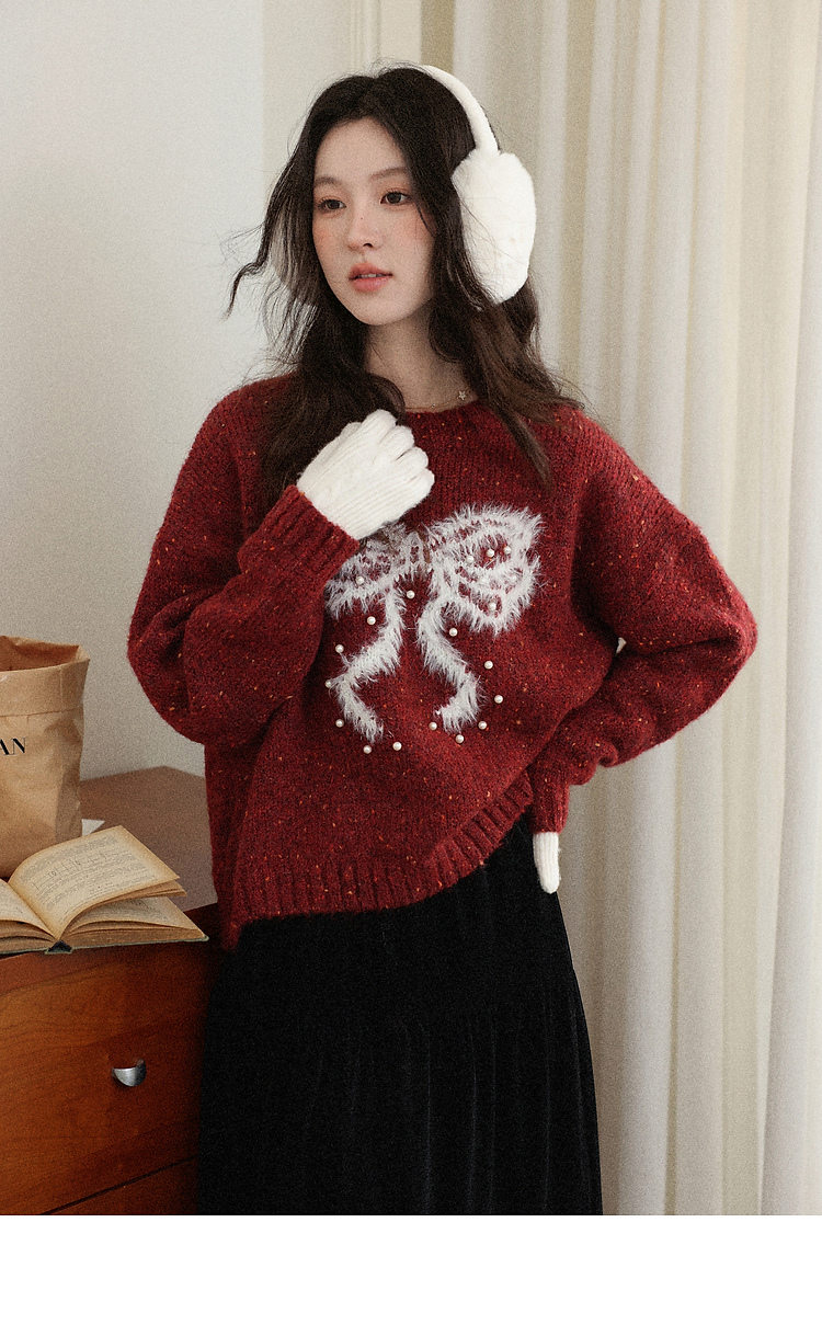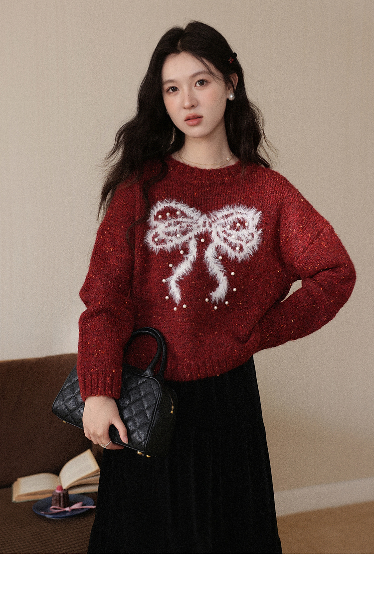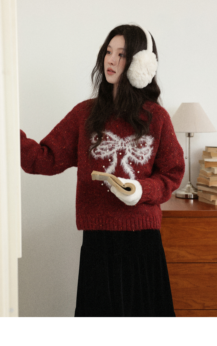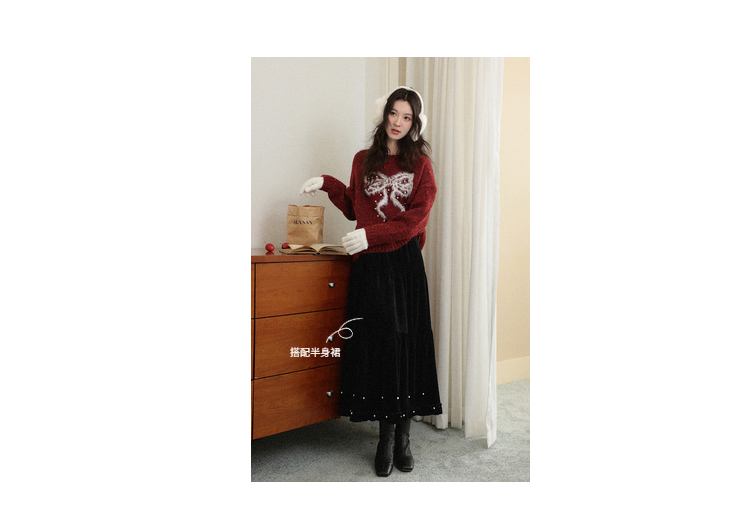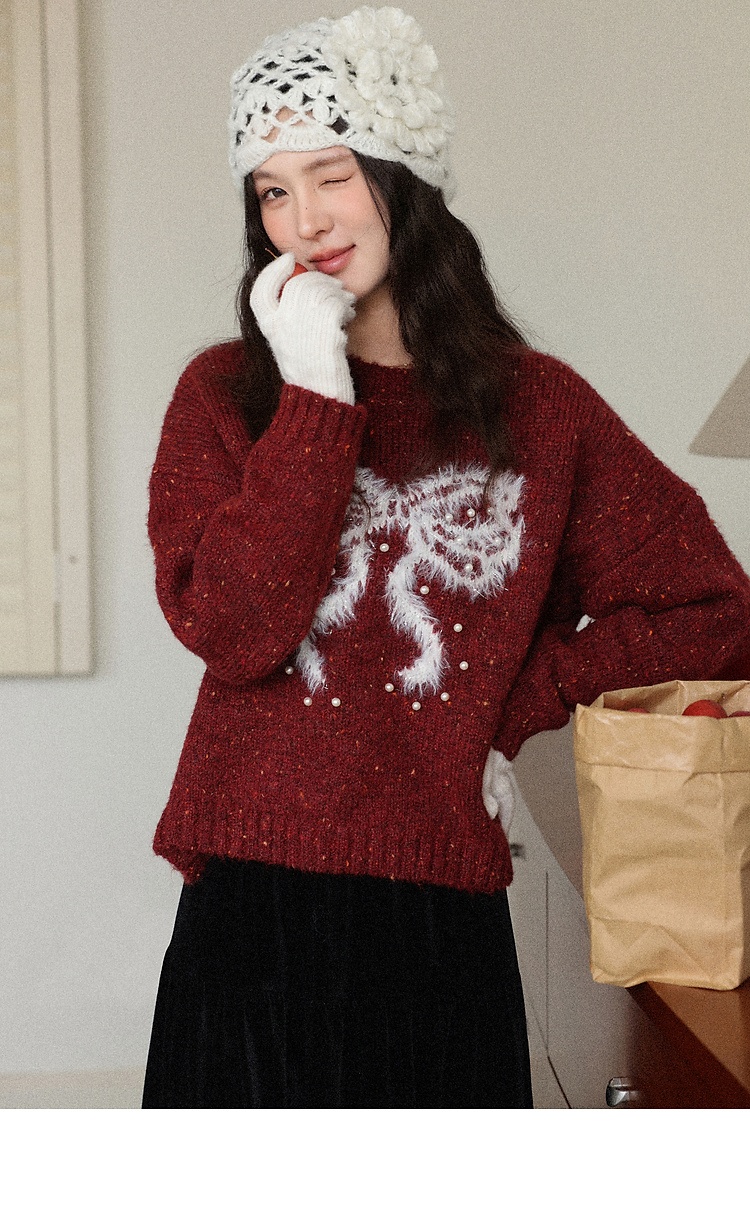 鹿向南「樱桃可可」圣诞红色长袖针织毛衣女秋冬叠穿宽松保暖上衣
