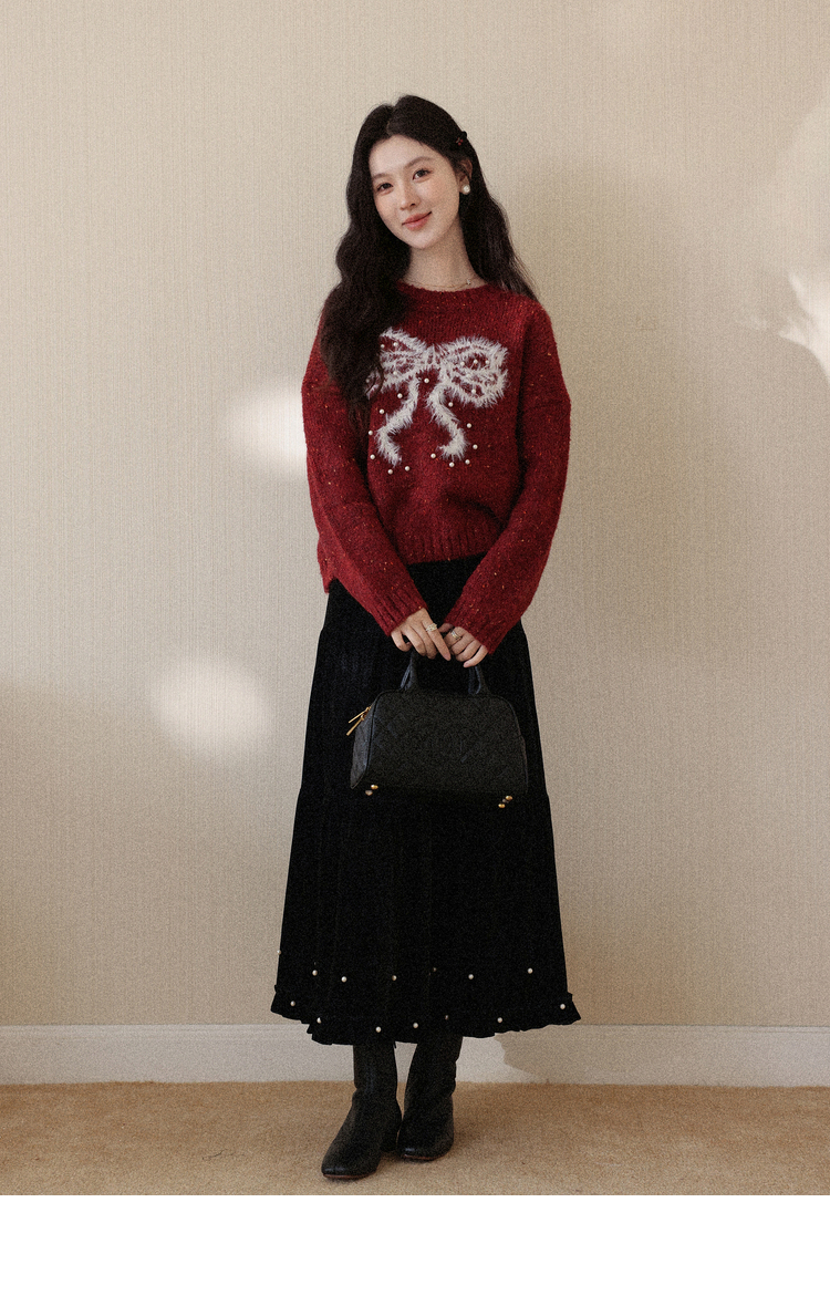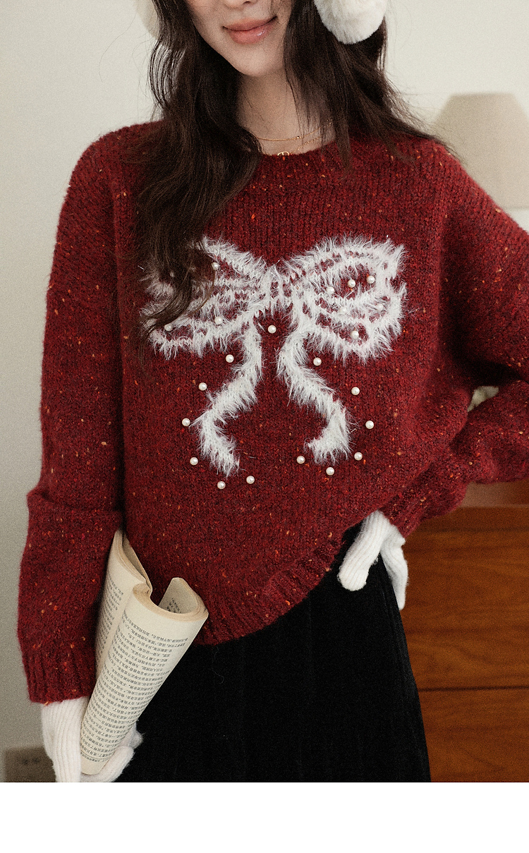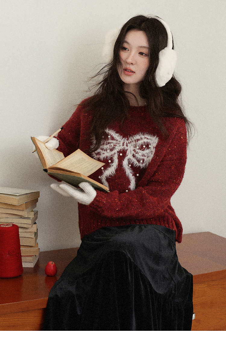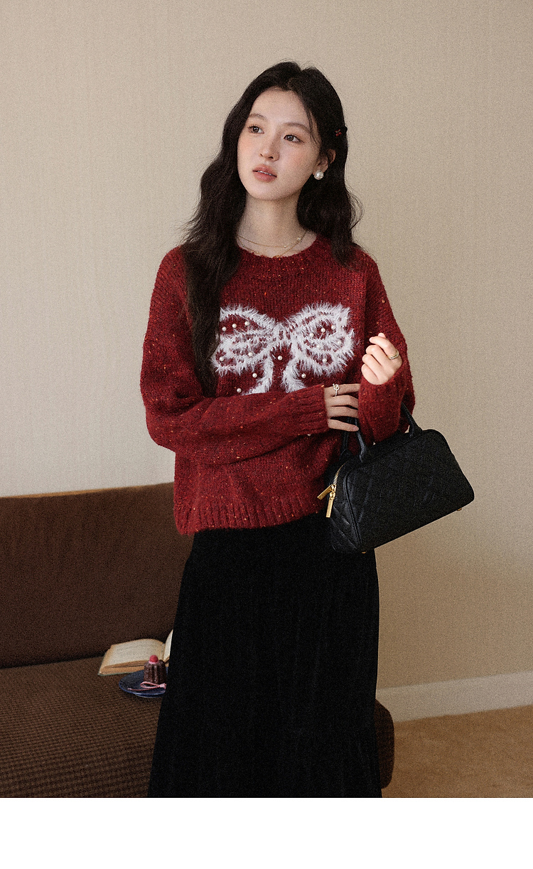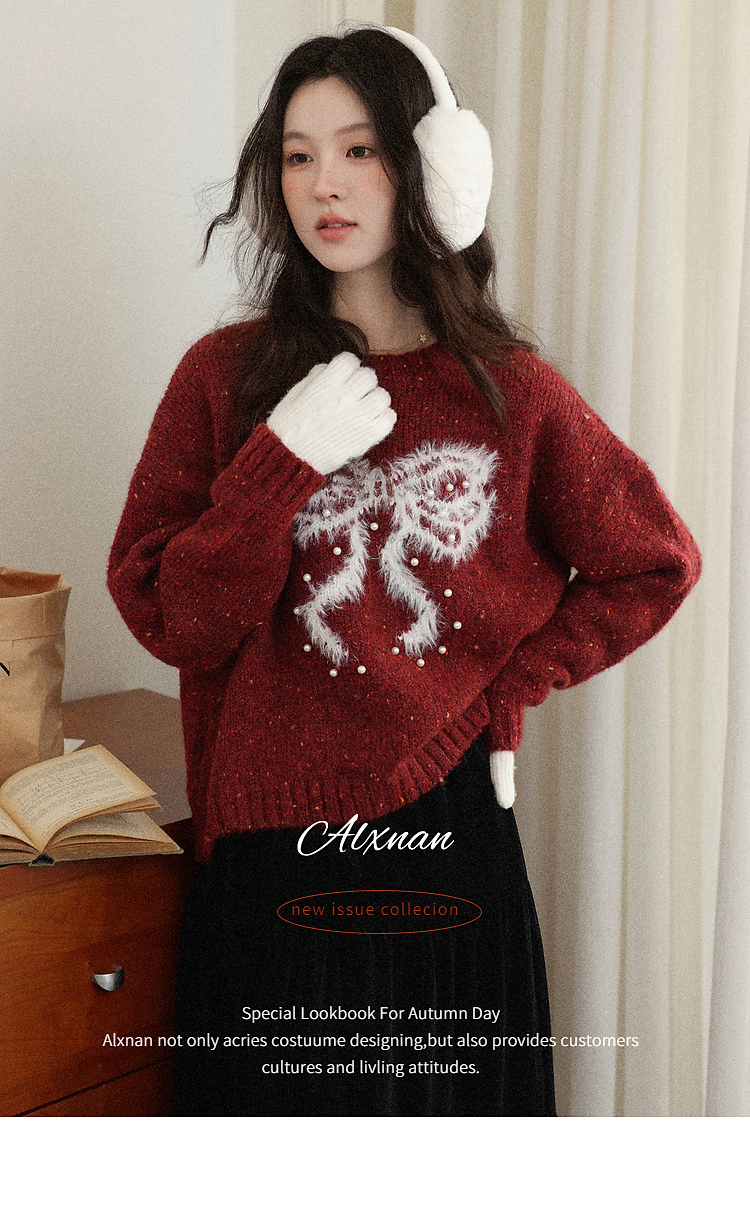 鹿向南「樱桃可可」圣诞红色长袖针织毛衣女秋冬叠穿宽松保暖上衣
