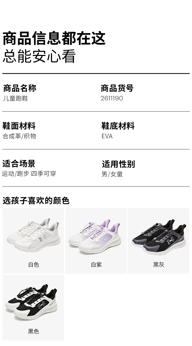 【品牌直发-福利特惠】Under Armour安德玛儿童 缓震透气 束带轻便跑鞋2611190