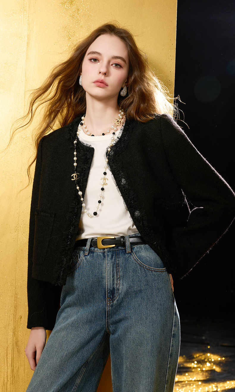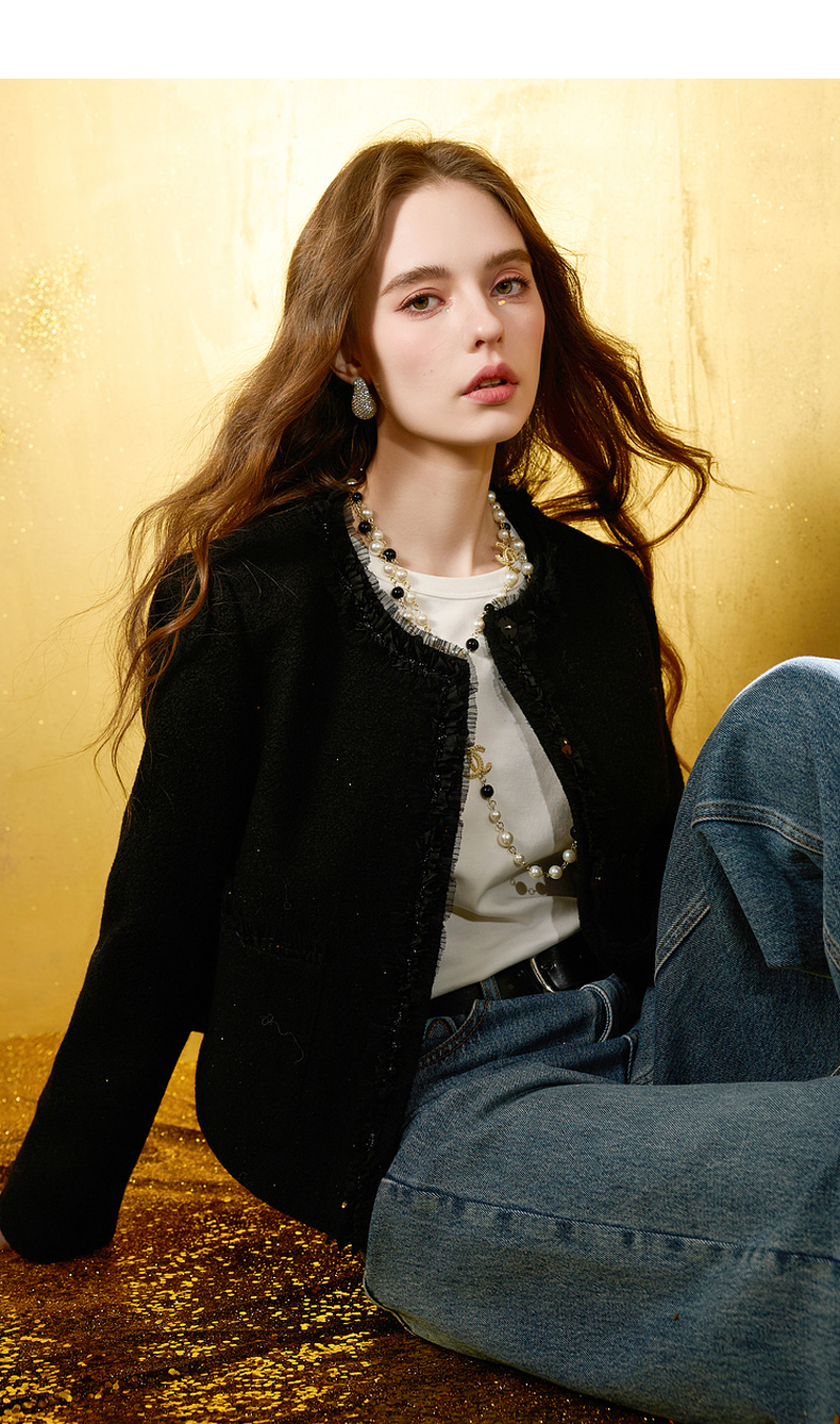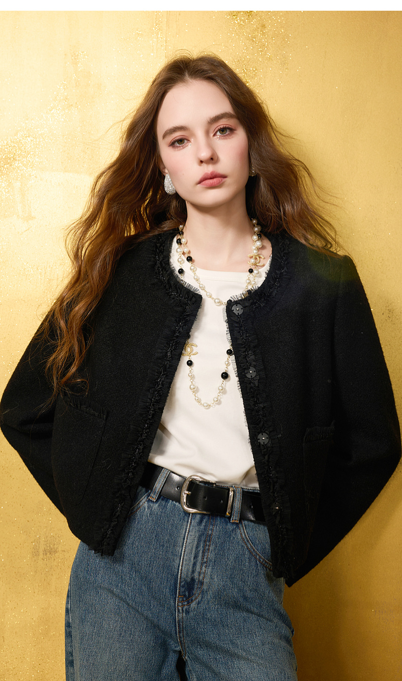 【绵羊毛】三彩2025冬季新款香风呢大衣短款单面呢外套M